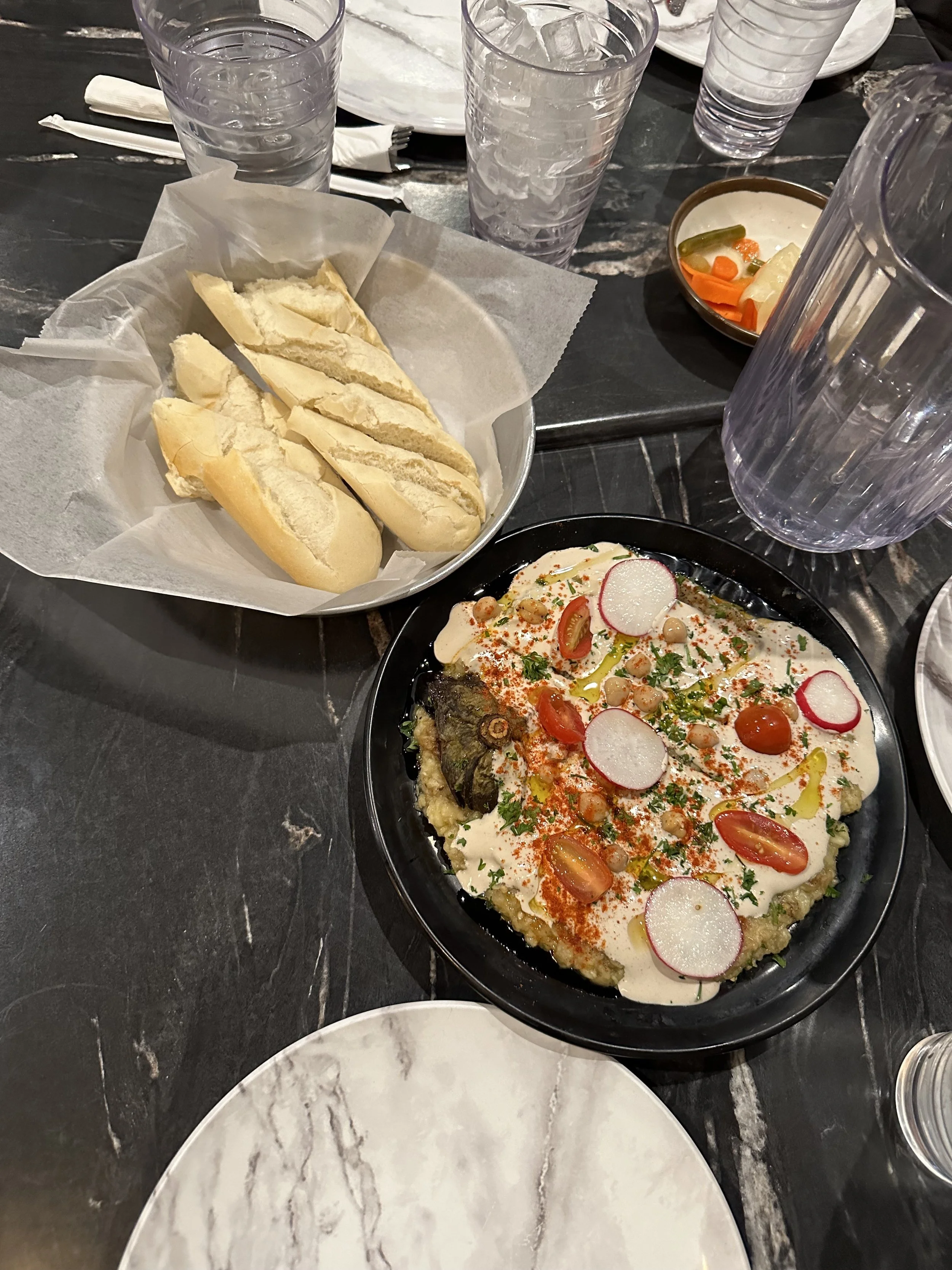 The restaurant is comprised of two big rooms. The first was pretty full, and our table was in the second, which was entirely empty. Always love a room to ourselves. The food was a mix of Israeli and American. Large Jewish communities can support multiple kosher restaurants with different cuisines – Israeli restaurants, a hamburger shop, a chicken place, a Chinese restaurant, a sushi bar, etc. But when you get to smaller communities, like Orlando, there’s just kosher food, which is usually a mix of American and Israeli meat food. That was okay, because some of us were really in the mood for schwarma, except when we sat down they told us they ran out of shawarma.