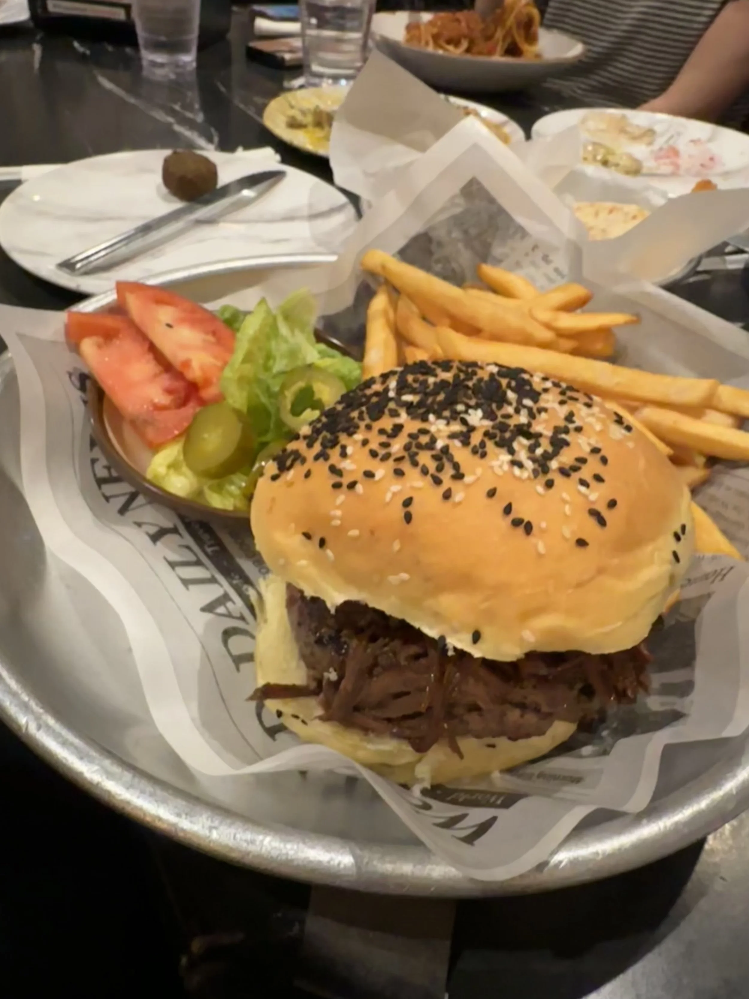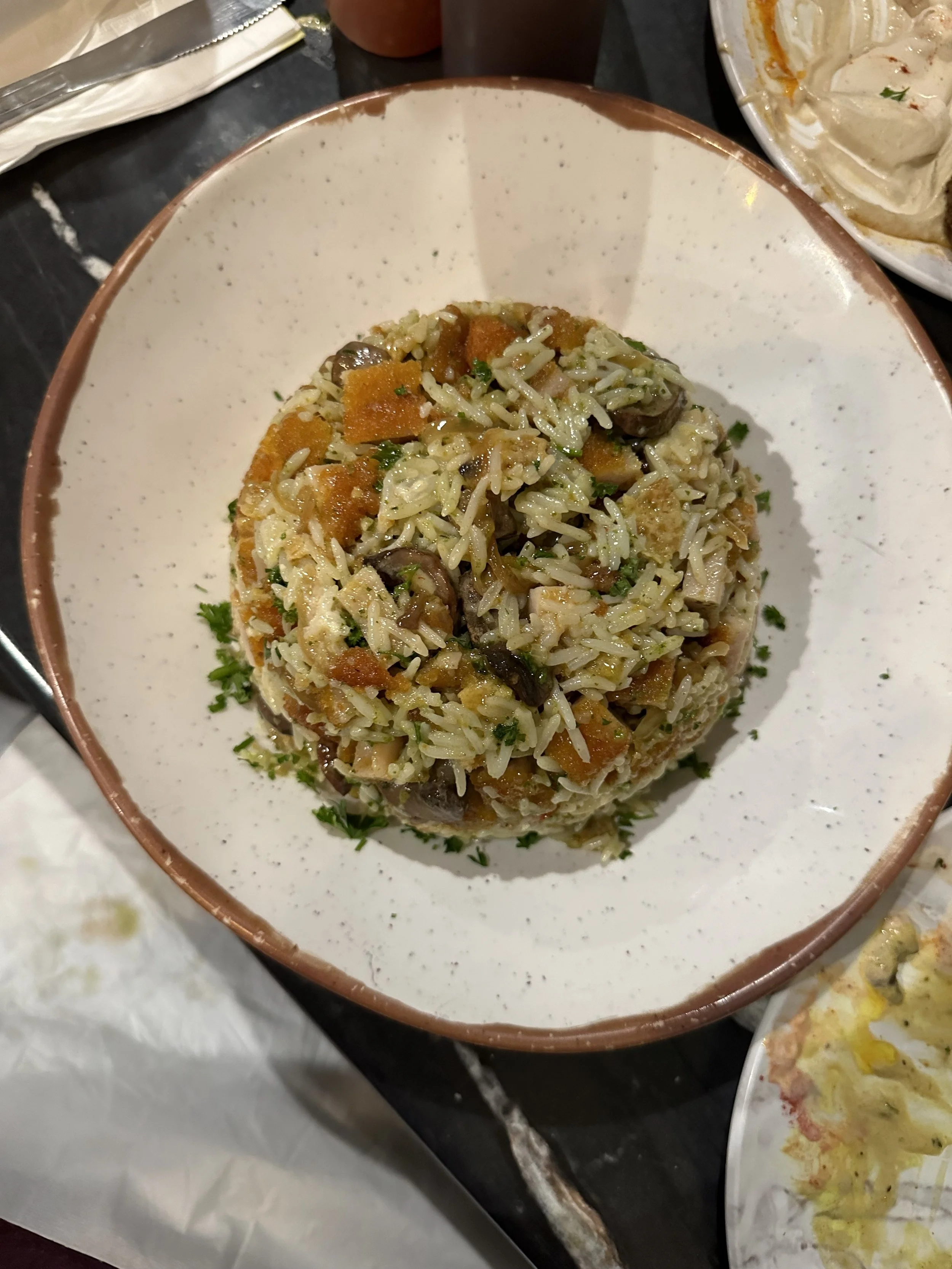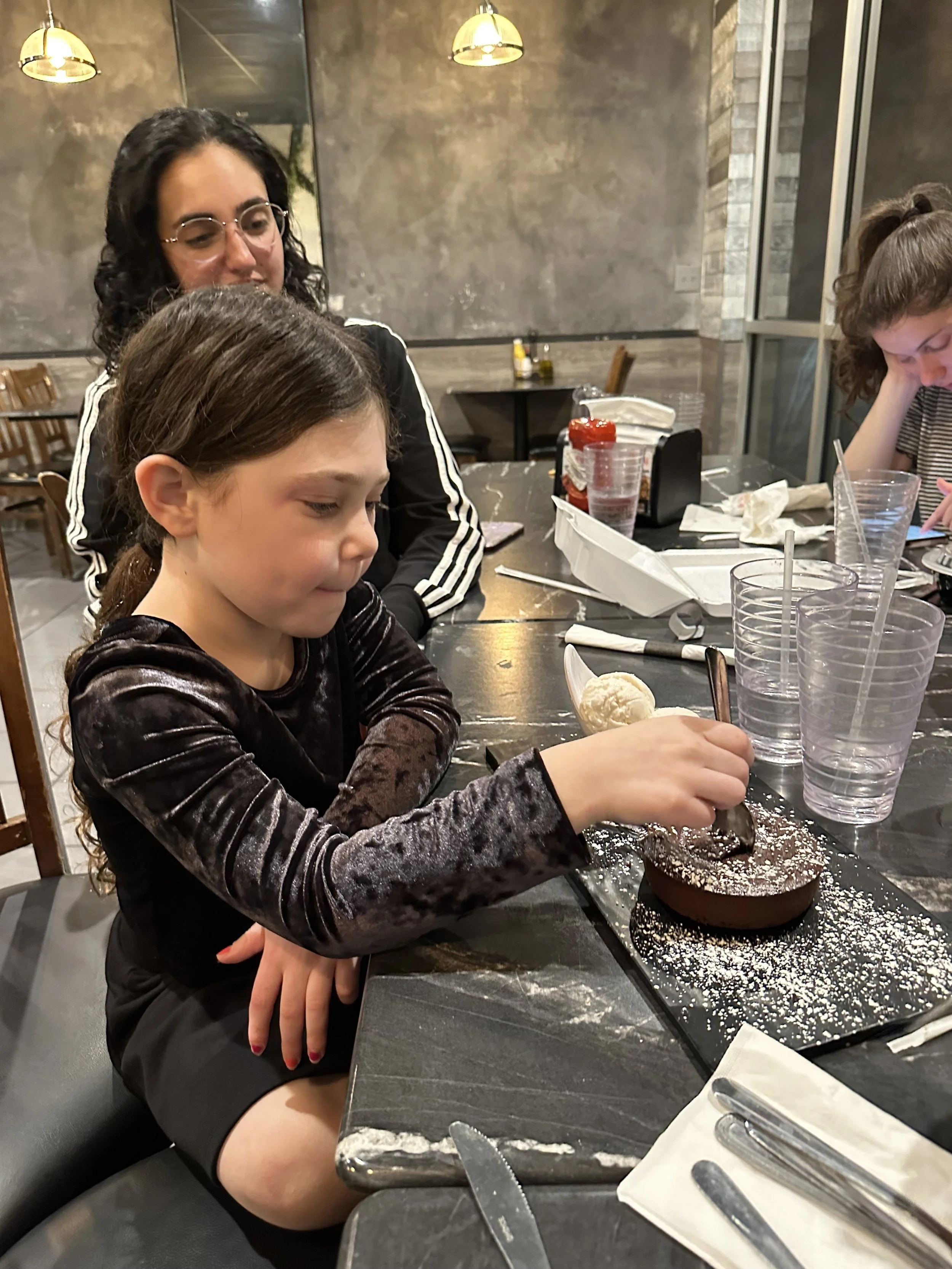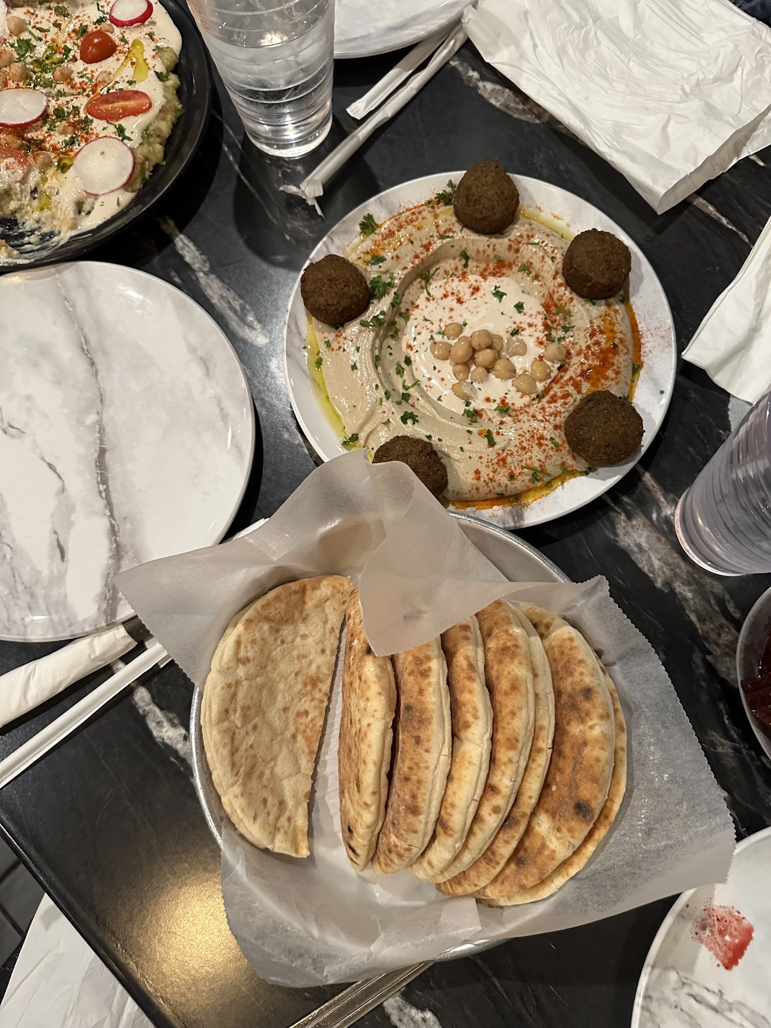 The food was delicious. I really thought I’d get sick from it, but so far so good. We started with a few appetizers – hummus, felafel, fried cauliflower and some weird eggplant thing. Tzvi and I shared two dishes – a burger with pulled beef on it, and a makluba, which was basically a mixture of rice, schnitzel, mushrooms, caramelized onions, sweet chili and garlic pesto sauce. It was actually delicious. For dessert Hallie ordered chocolate cake, which we all shared. It was okay.