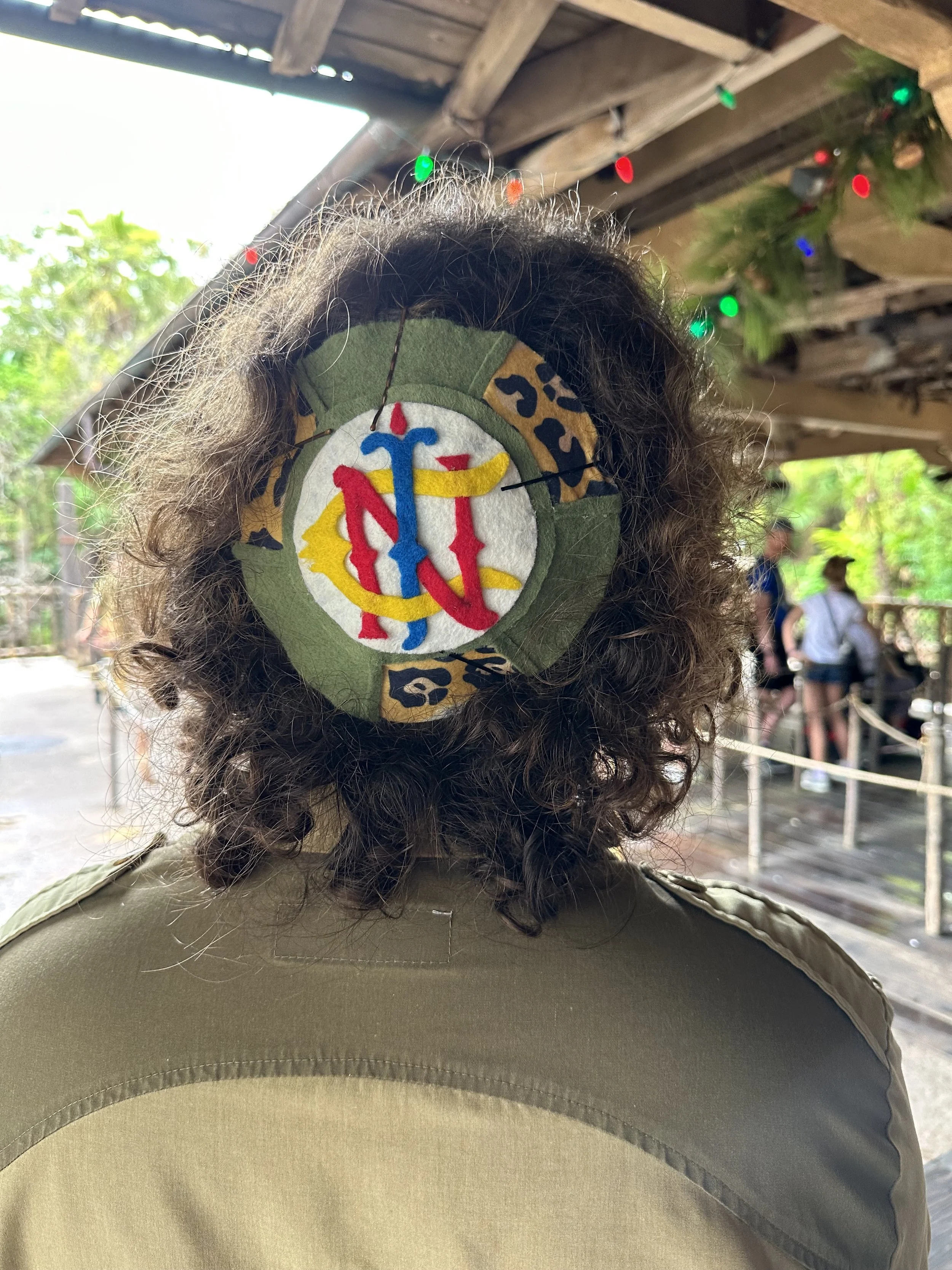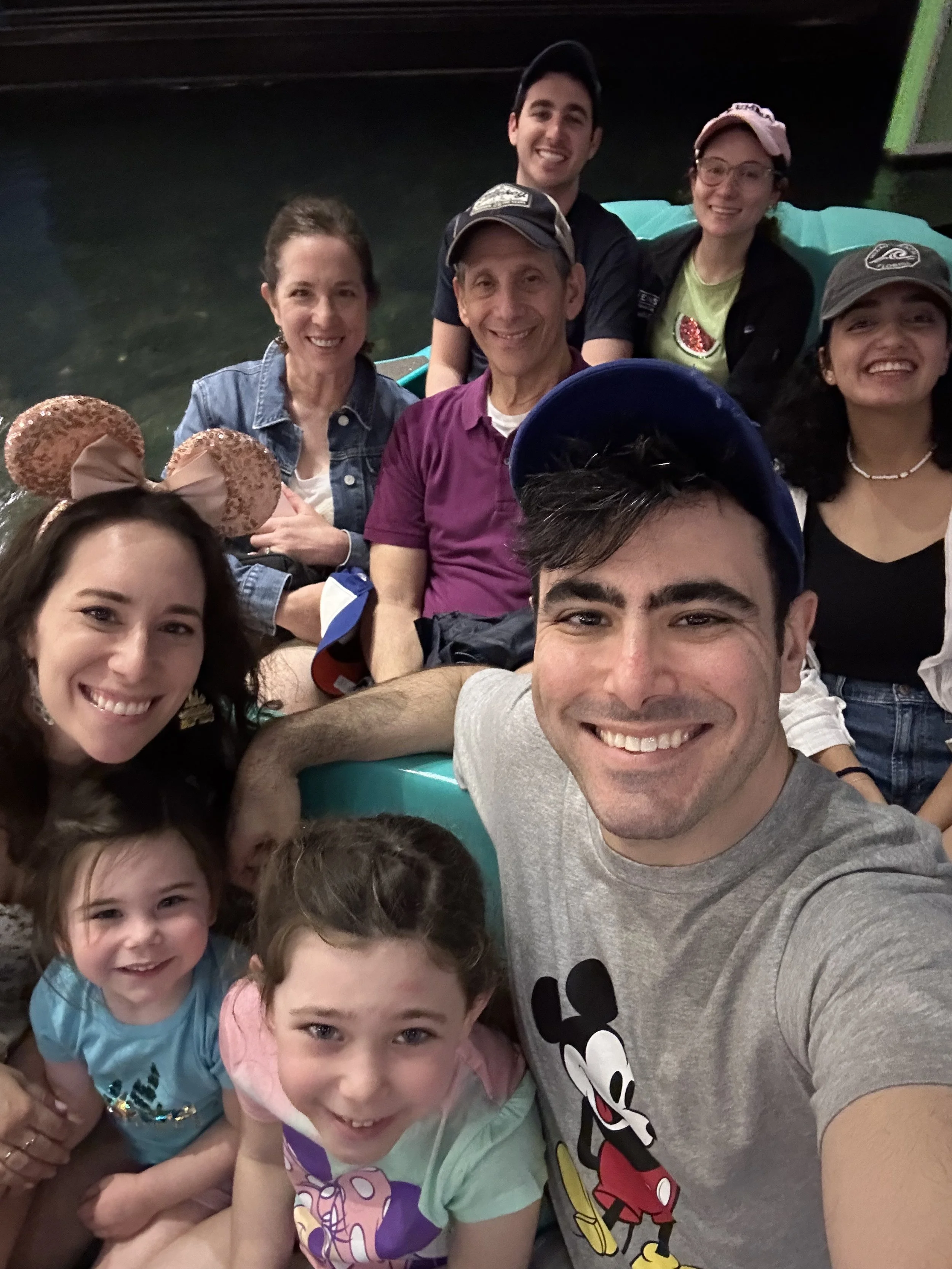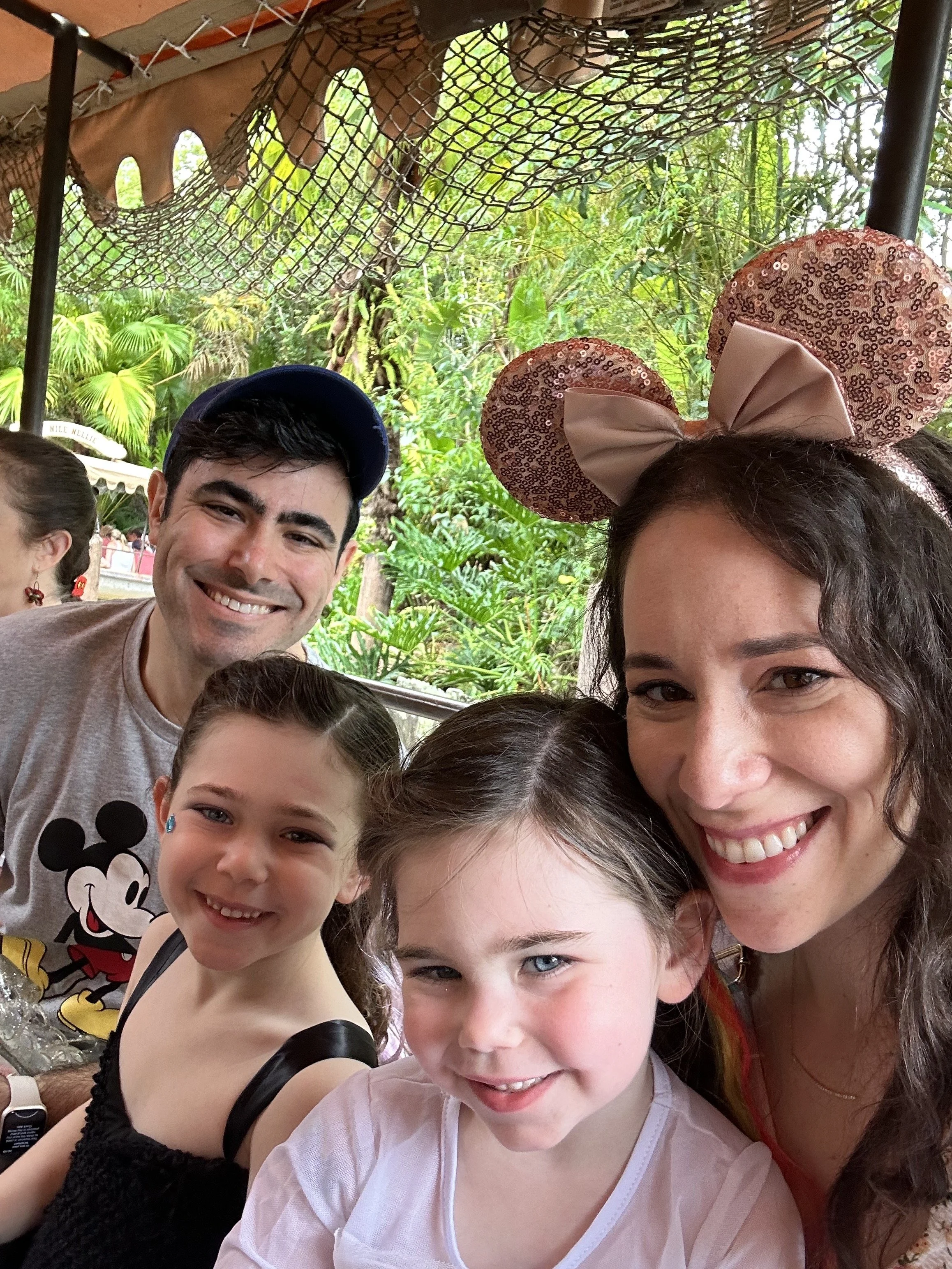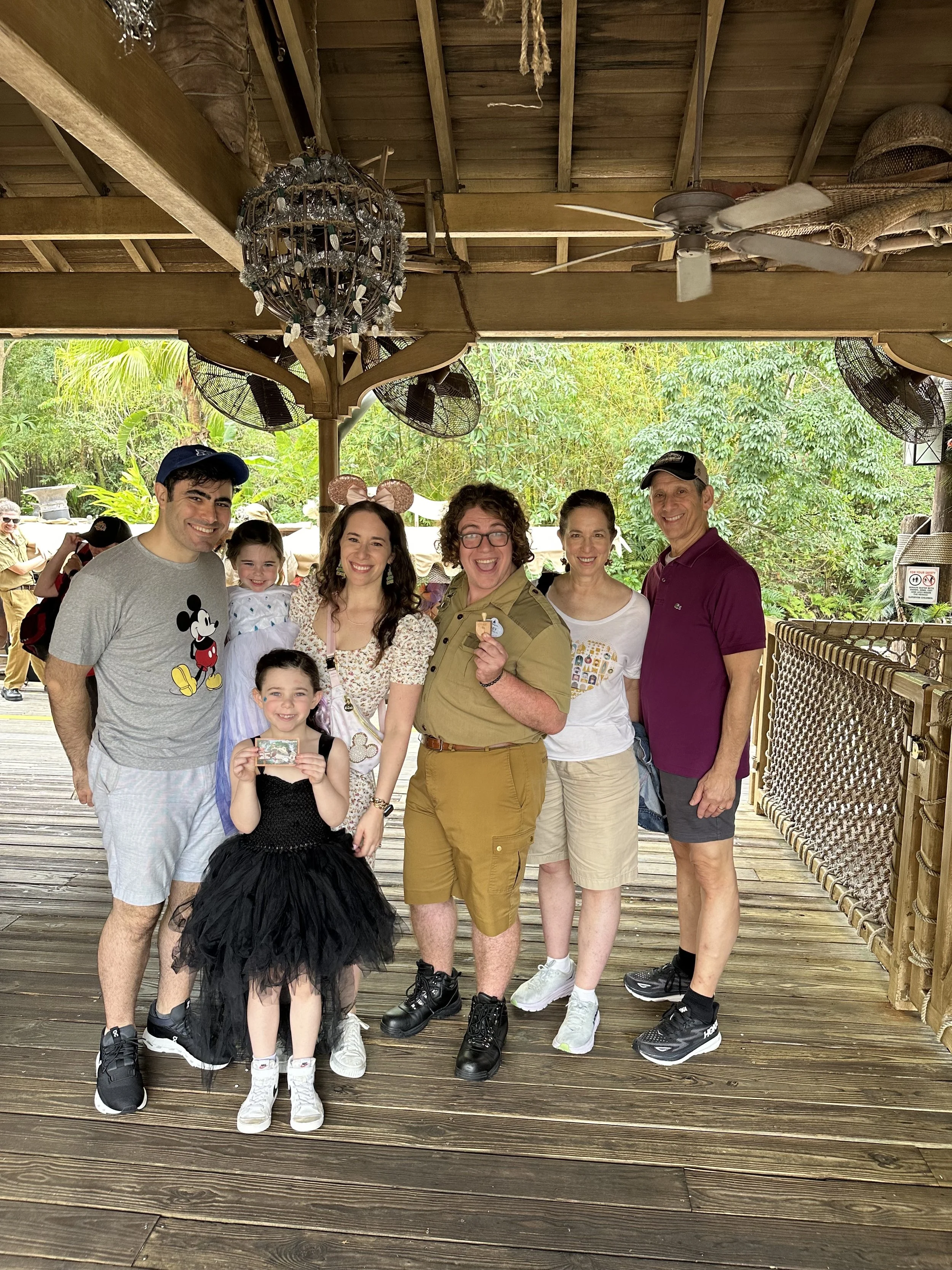 We headed inside, took some castle photos, and made our way to our first ride. Avery, Gabriella, and Inbar went to Peter Pan. Tzvi and I rope dropped that last December, so I’m good for the next decade or so. The rest of us opted for , the Jingle Cruise (normally Jungle Cruise, but they theme it X-mas from November to January). For those who don’t know, Jungle Cruise is a slow moving river boat ride through a fake jungle river. The “skippers” that drive the boats are usually comedians and they narrate the whole ride in a humorous way. For Jingle Cruise, all of the jokes are Christmas themed. Anyway, getting on line my mom spotted a Skipper wearing a kippah. I went over to him to ask him about it and he started telling us that last year, amidst all the Christmas hats another cast member made him a Jungle Cruise kippah. Also, he said that per Disney guidelines, they’re required to have at least one multi-cultural joke in each cruise, so he always did one Chanukah joke, but last year he decided to flip that and do a cruise that’s fully Chanukah themed. He said most of his feedback has been very positive. He took us off the line and commandeered a boat to do his Chanukah version of the cruise for us. It was so nice. Very 1960s, Borscht Belt humor. When we got off we took a photo with him. Thanks a lot Skipper Joey from Philadelphia! Keep up the good work!
