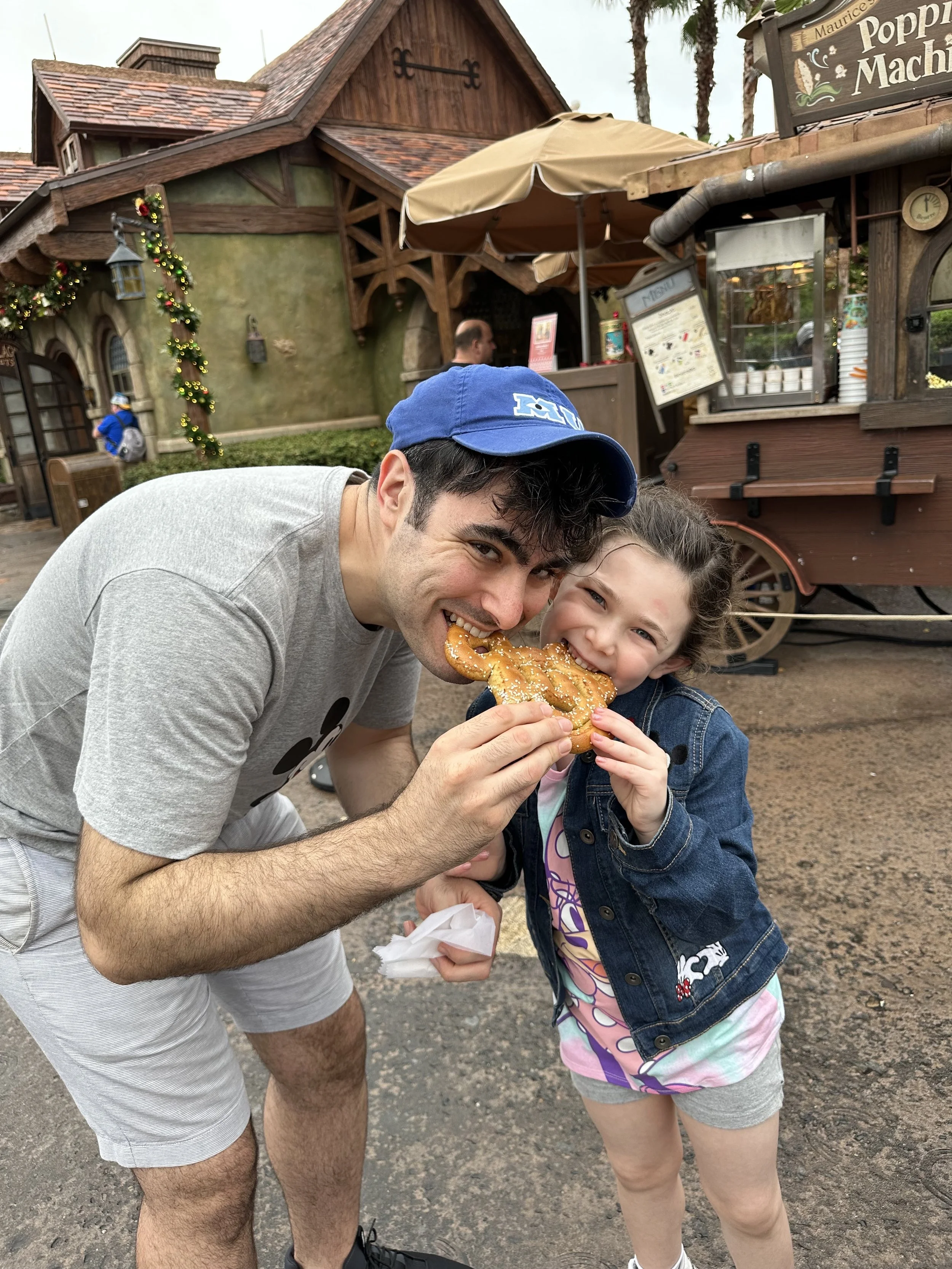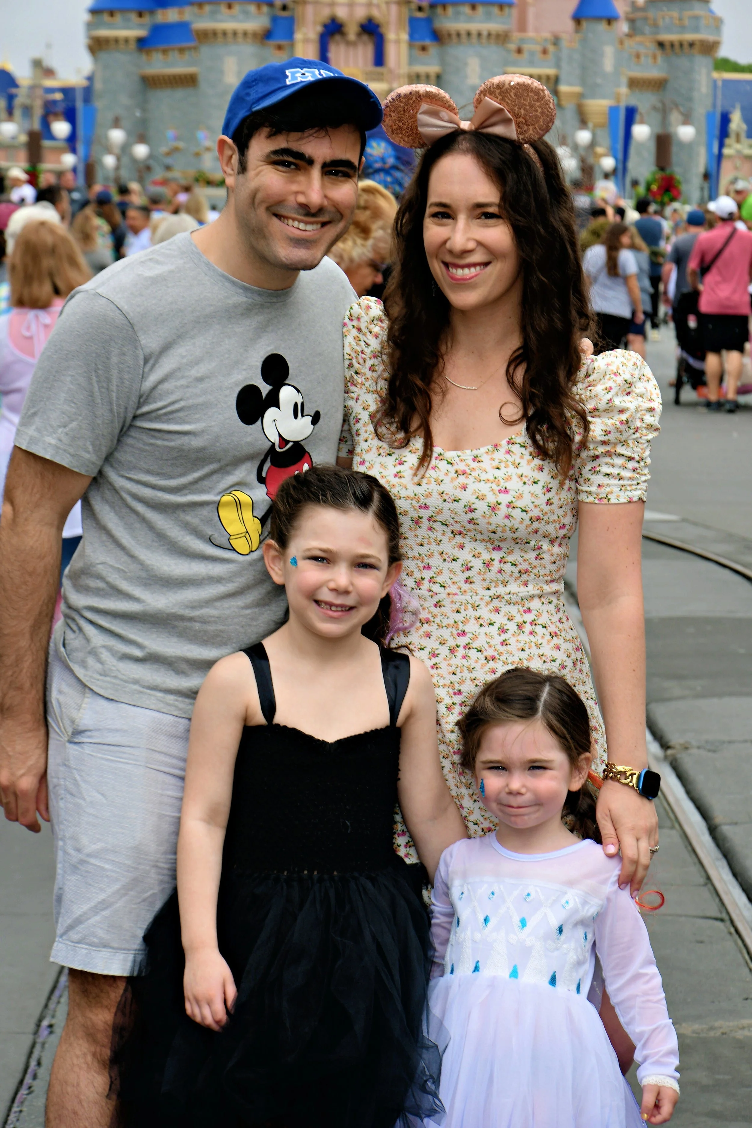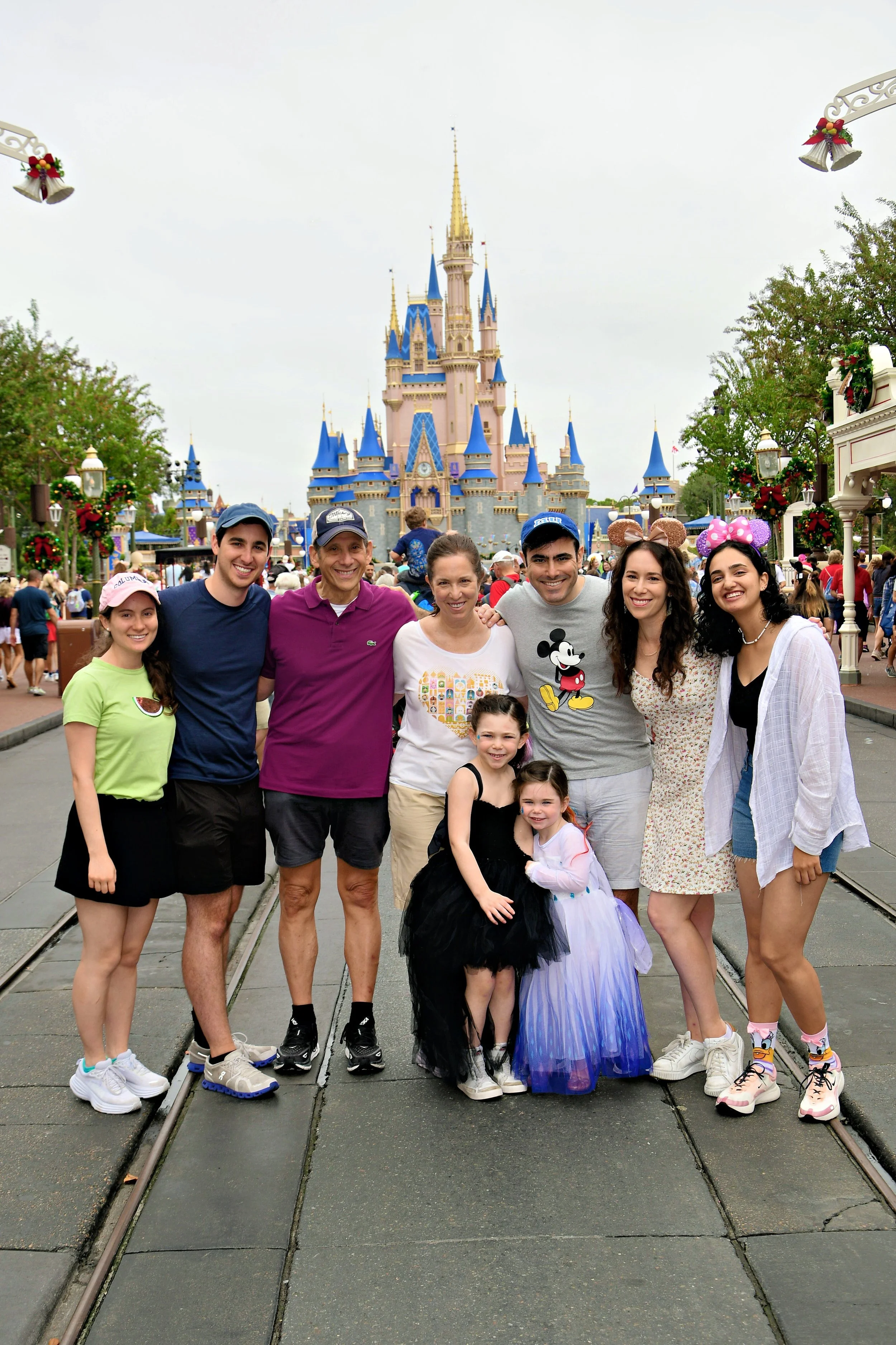 We headed inside, took some castle photos, and made our way to our first ride. Avery, Gabriella, and Inbar went to Peter Pan. Tzvi and I rope dropped that last December, so I’m good for the next decade or so. The rest of us opted for , the Jingle Cruise (normally Jungle Cruise, but they theme it X-mas from November to January). For those who don’t know, Jungle Cruise is a slow moving river boat ride through a fake jungle river. The “skippers” that drive the boats are usually comedians and they narrate the whole ride in a humorous way. For Jingle Cruise, all of the jokes are Christmas themed. Anyway, getting on line my mom spotted a Skipper wearing a kippah. I went over to him to ask him about it and he started telling us that last year, amidst all the Christmas hats another cast member made him a Jungle Cruise kippah. Also, he said that per Disney guidelines, they’re required to have at least one multi-cultural joke in each cruise, so he always did one Chanukah joke, but last year he decided to flip that and do a cruise that’s fully Chanukah themed. He said most of his feedback has been very positive. He took us off the line and commandeered a boat to do his Chanukah version of the cruise for us. It was so nice. Very 1960s, Borscht Belt humor. When we got off we took a photo with him. Thanks a lot Skipper Joey from Philadelphia! Keep up the good work!