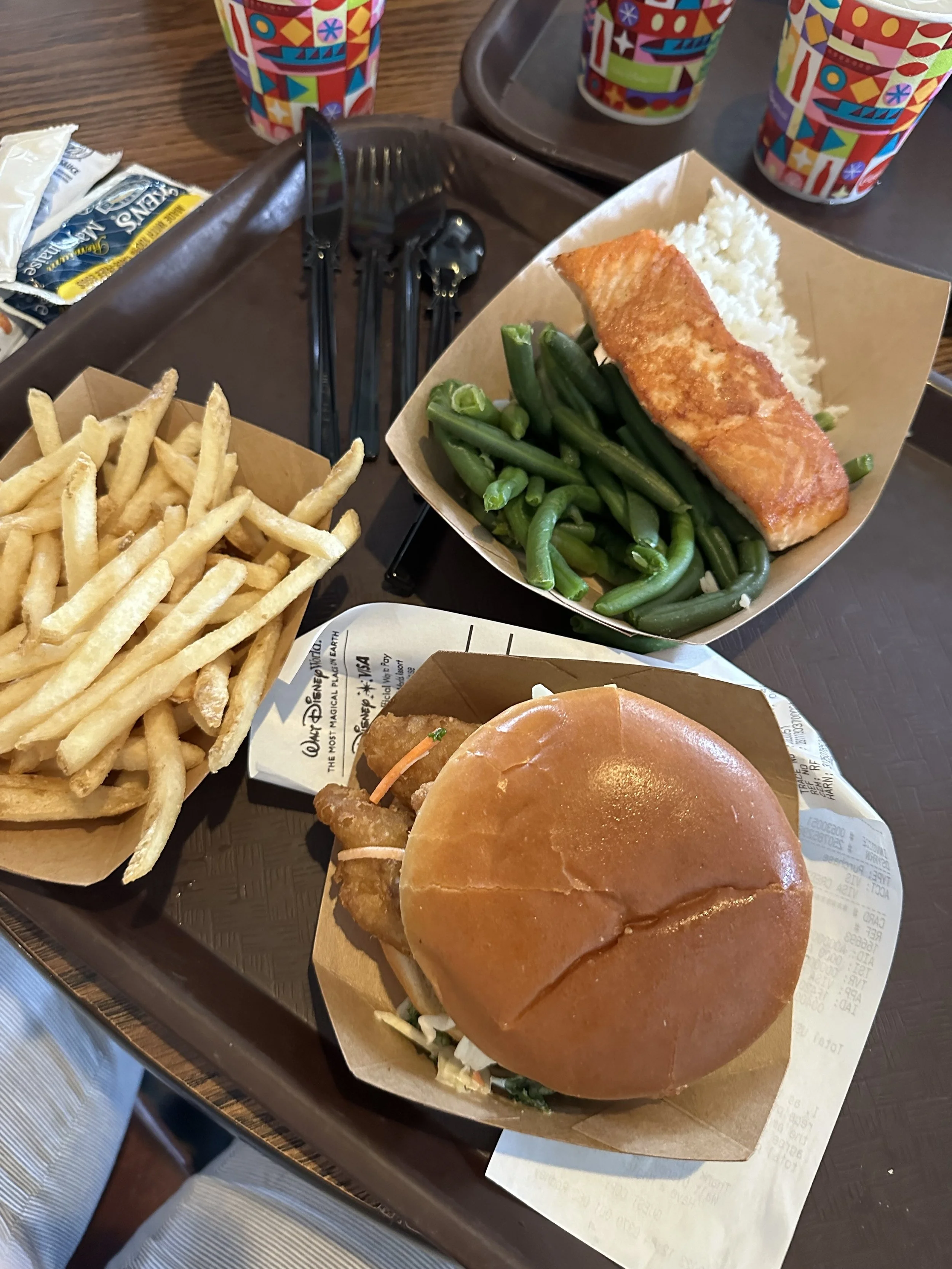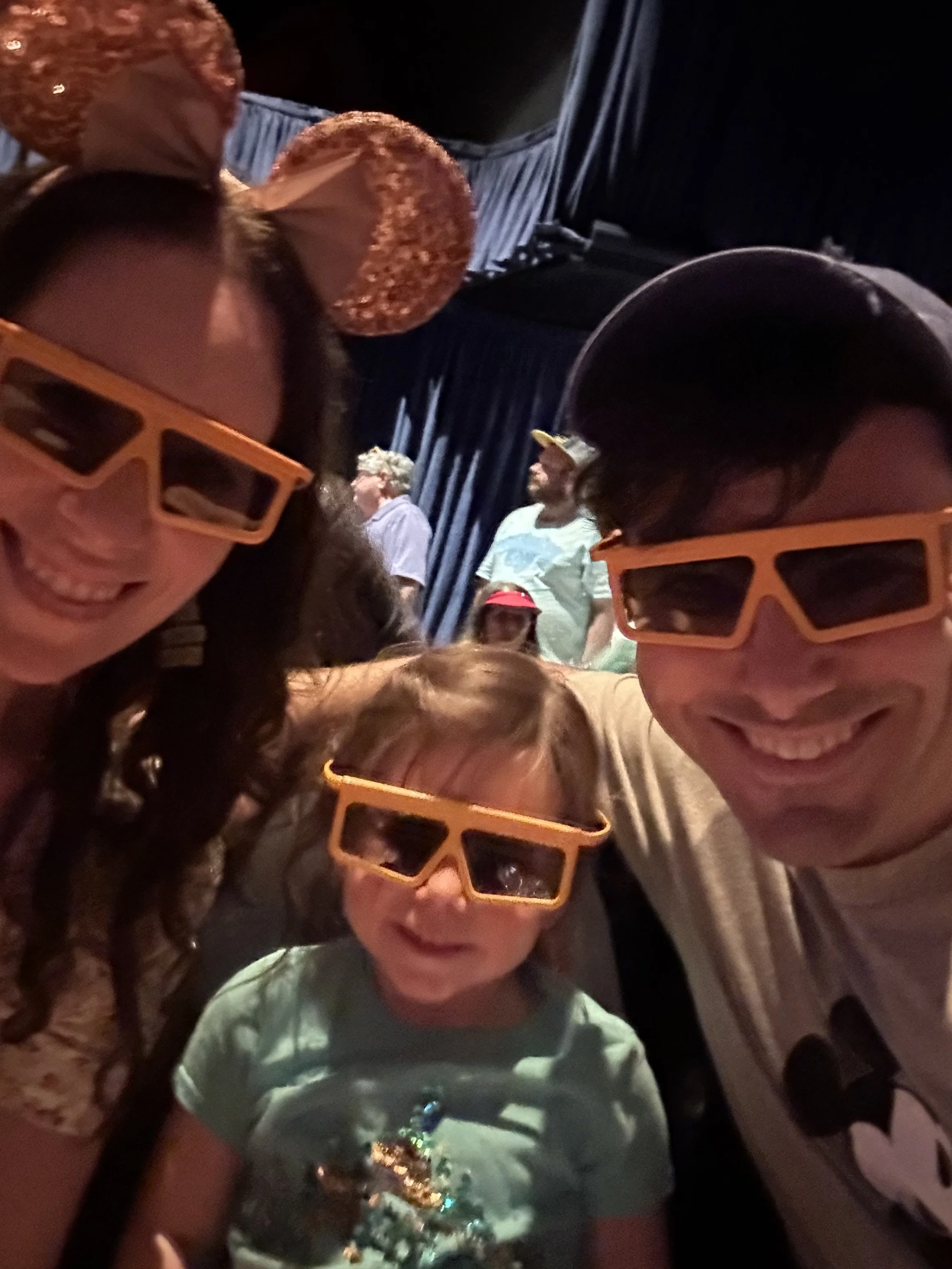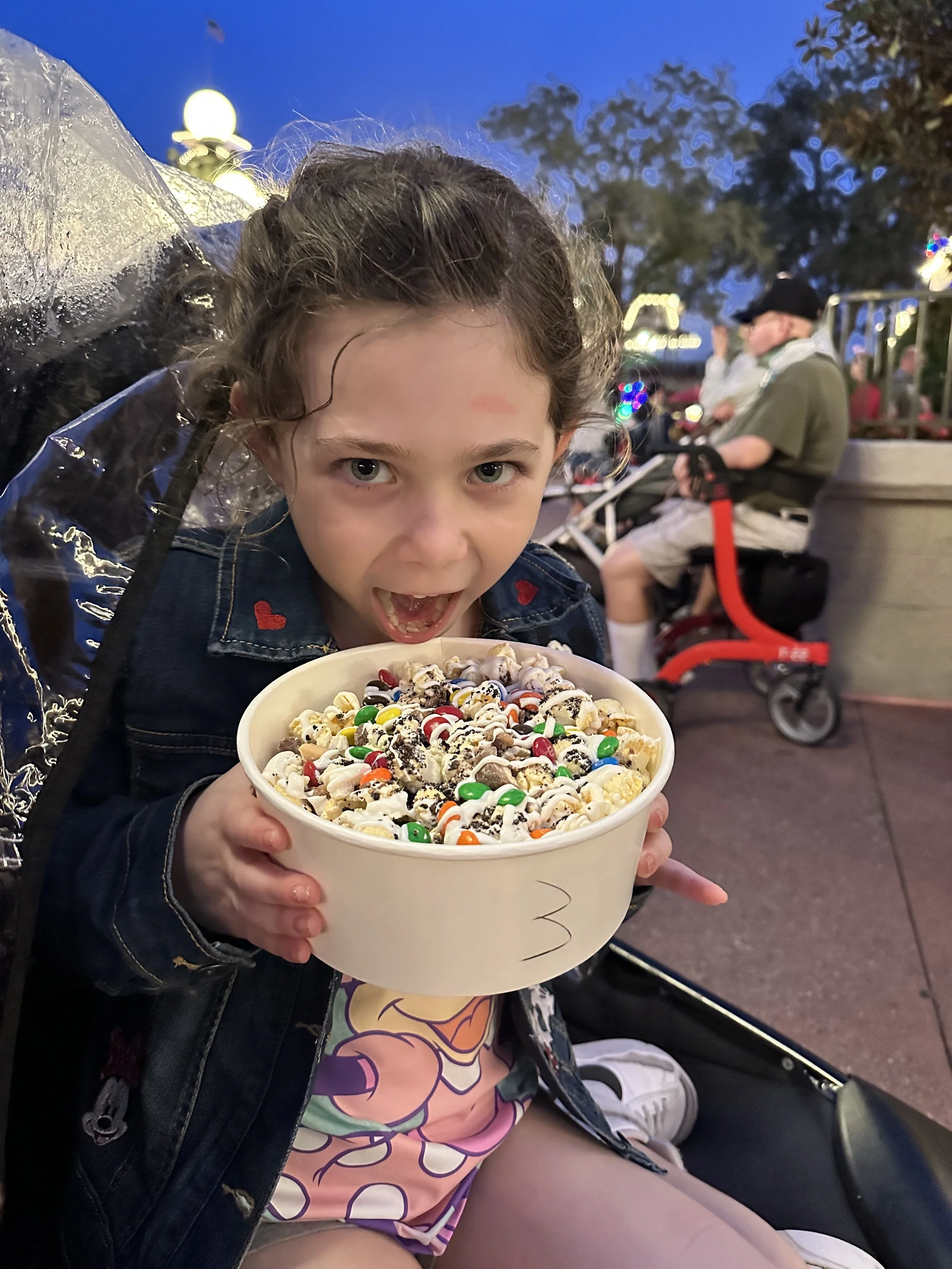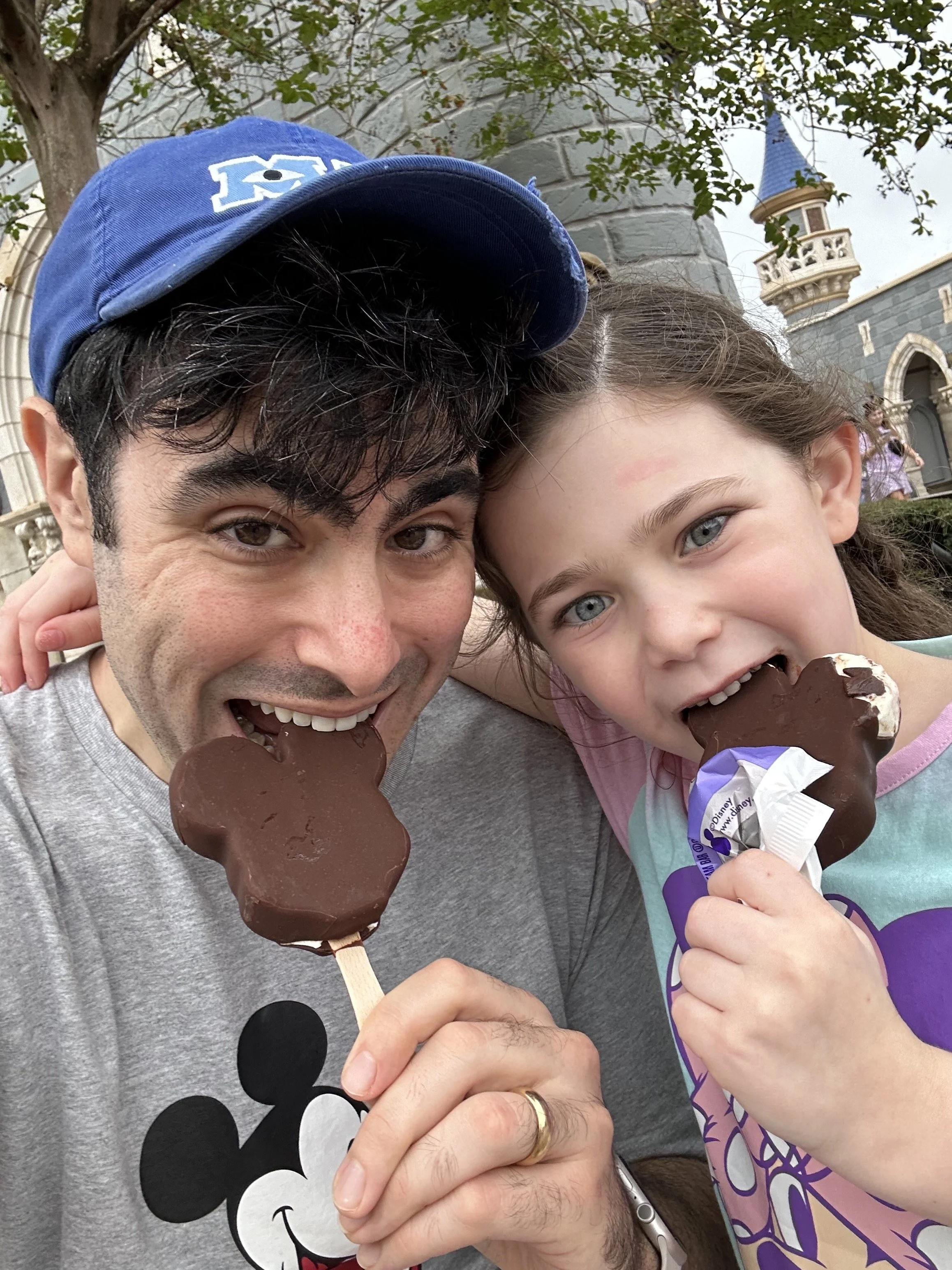 We stopped for lunch (salmon for me, a fish sandwich for Tzvi) and then did Haunted Mansion. It was Hallie’s first time and she was a little scared but ultimately loved it. As we walked out of Haunted Mansion it started to rain, so that was pleasant. Like everyone else, we headed over to Small World where there was a long, but covered, line. Madeleine loved it. We got some Mickey Ice Cream Bars, then went to Philharmagic, which was great, especially the addition of Coco.
