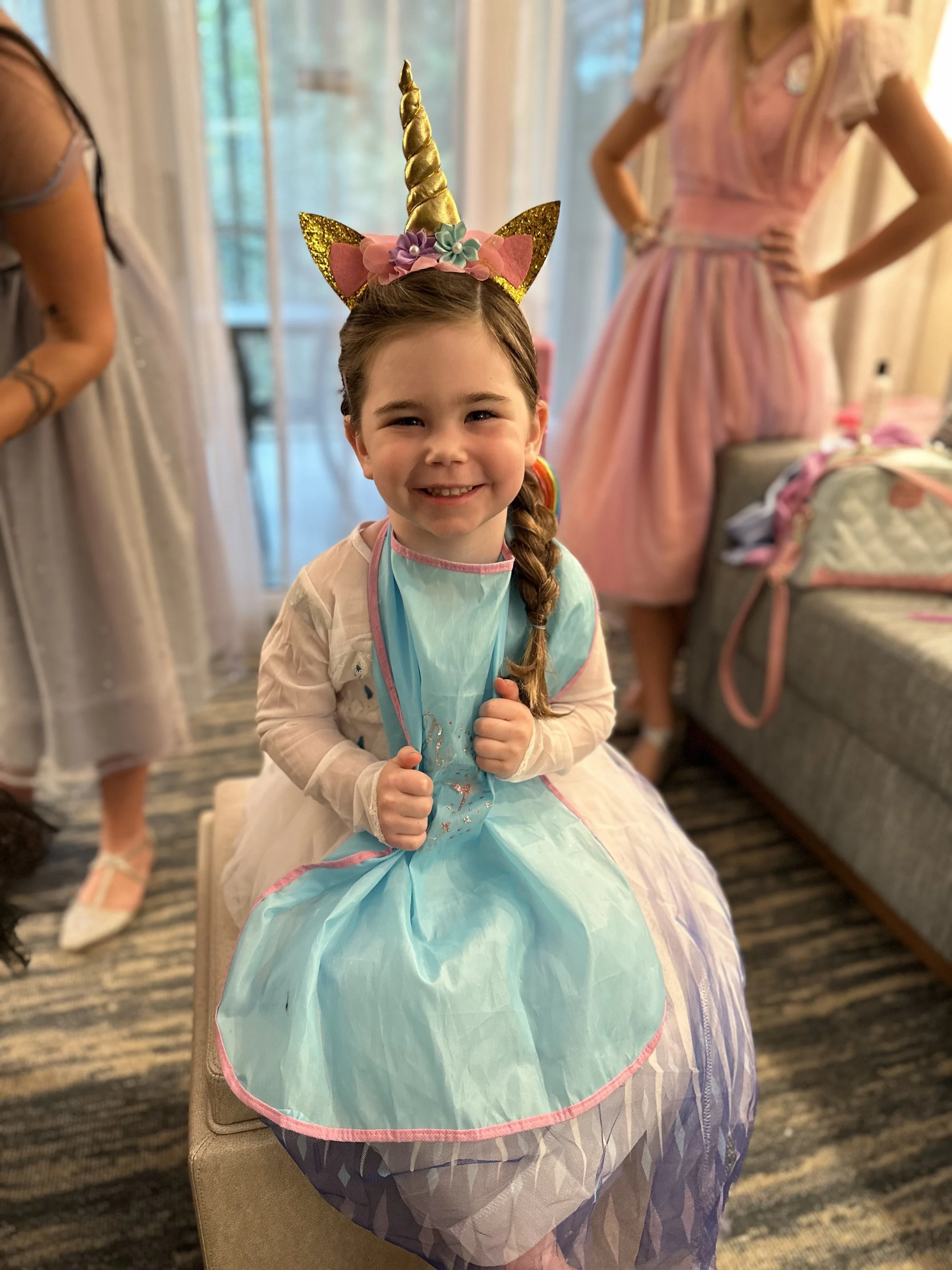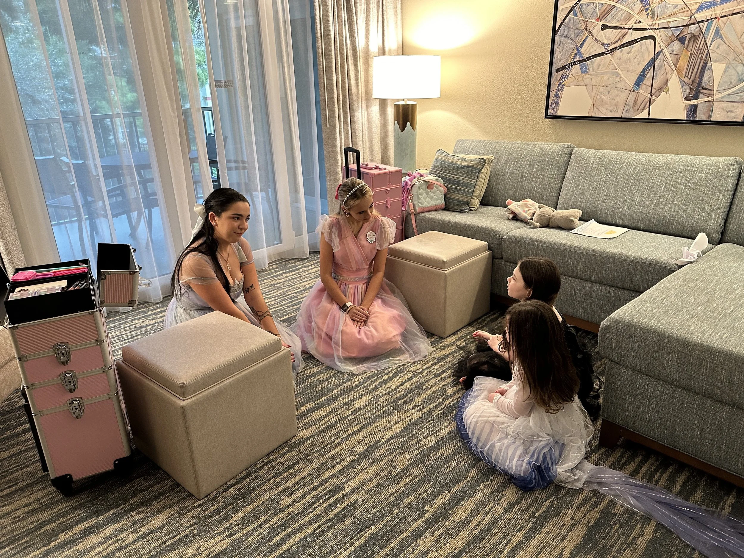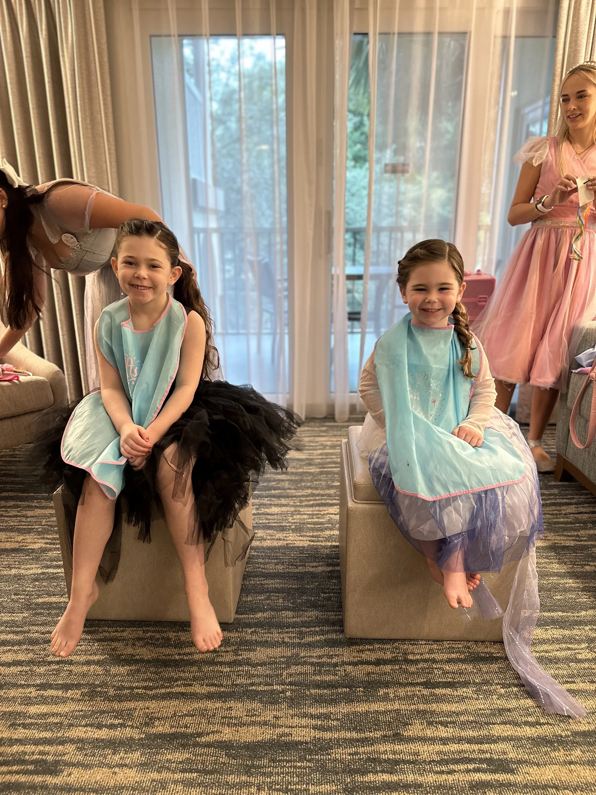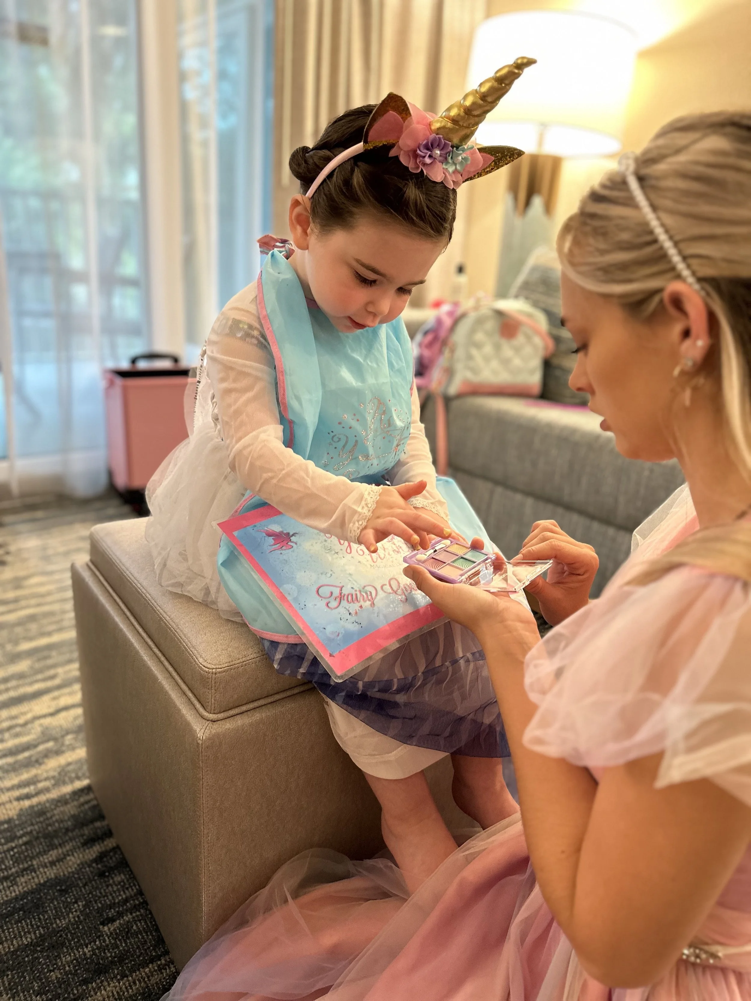At least that’s what we heard at 8am when our two Fairy Godmothers arrived. Normally I would book the Bibbidy Bobbidi Boutique, but since Covid the one in Disney Springs closed and it’s impossible to get a reservation for the one in Magic Kingdom. Instead, we opted for one of the services that come to you! It was two young women dressed as fairy godmothers and they basically spent 45 minutes pampering the girls. It was the cutest thing and the girls really enjoyed it. We had let each girl decide in advance which princess they wanted to be. Madeleine chose Elsa and Hallie chose Sleeping Beauty, but the Sleeping Beauty costume never arrived and Hallie decided she just wanted to wear a black tutu. Then they each picked out the unicorn hairstyles, so they ended up being unicorn princesses.