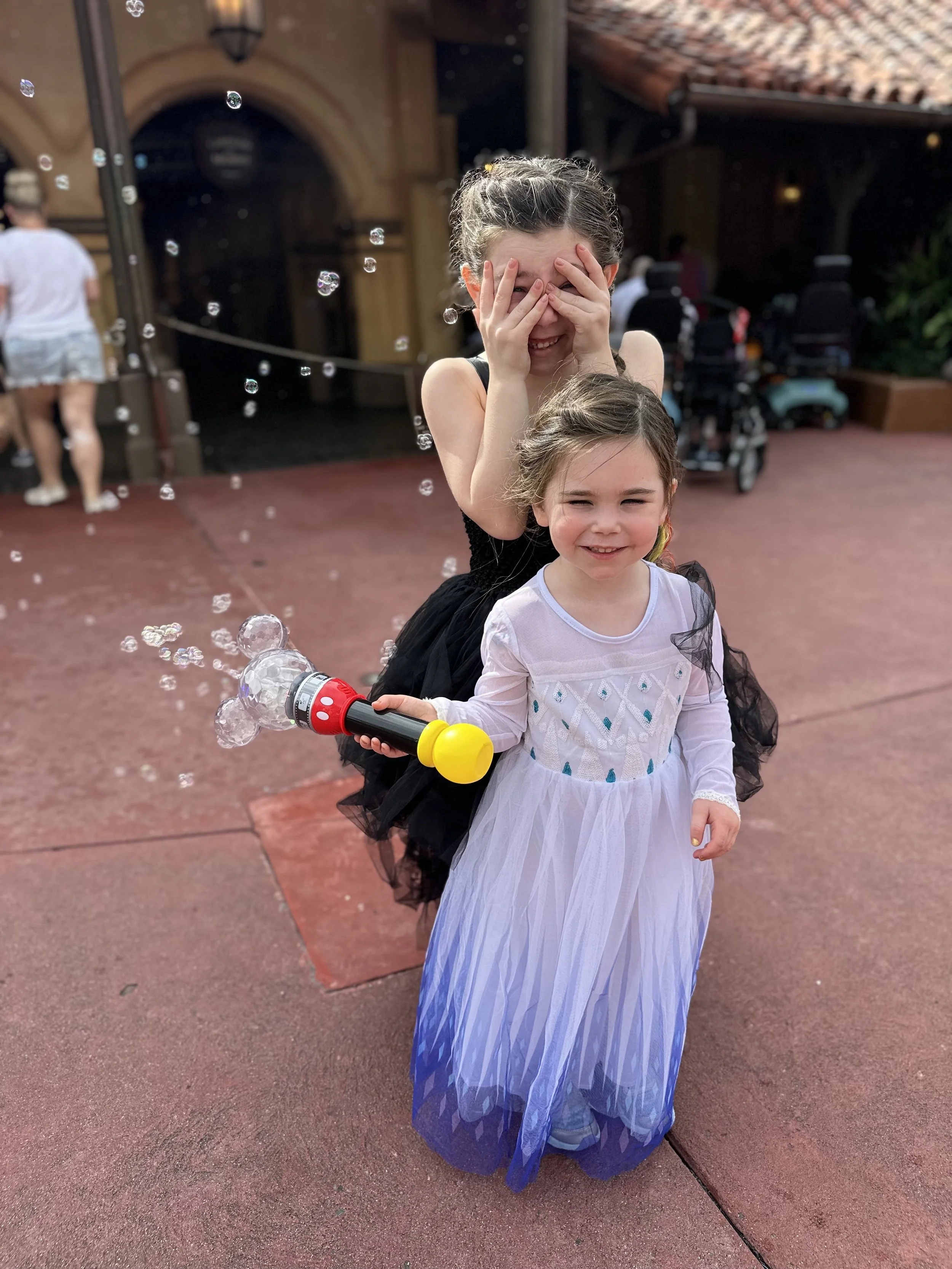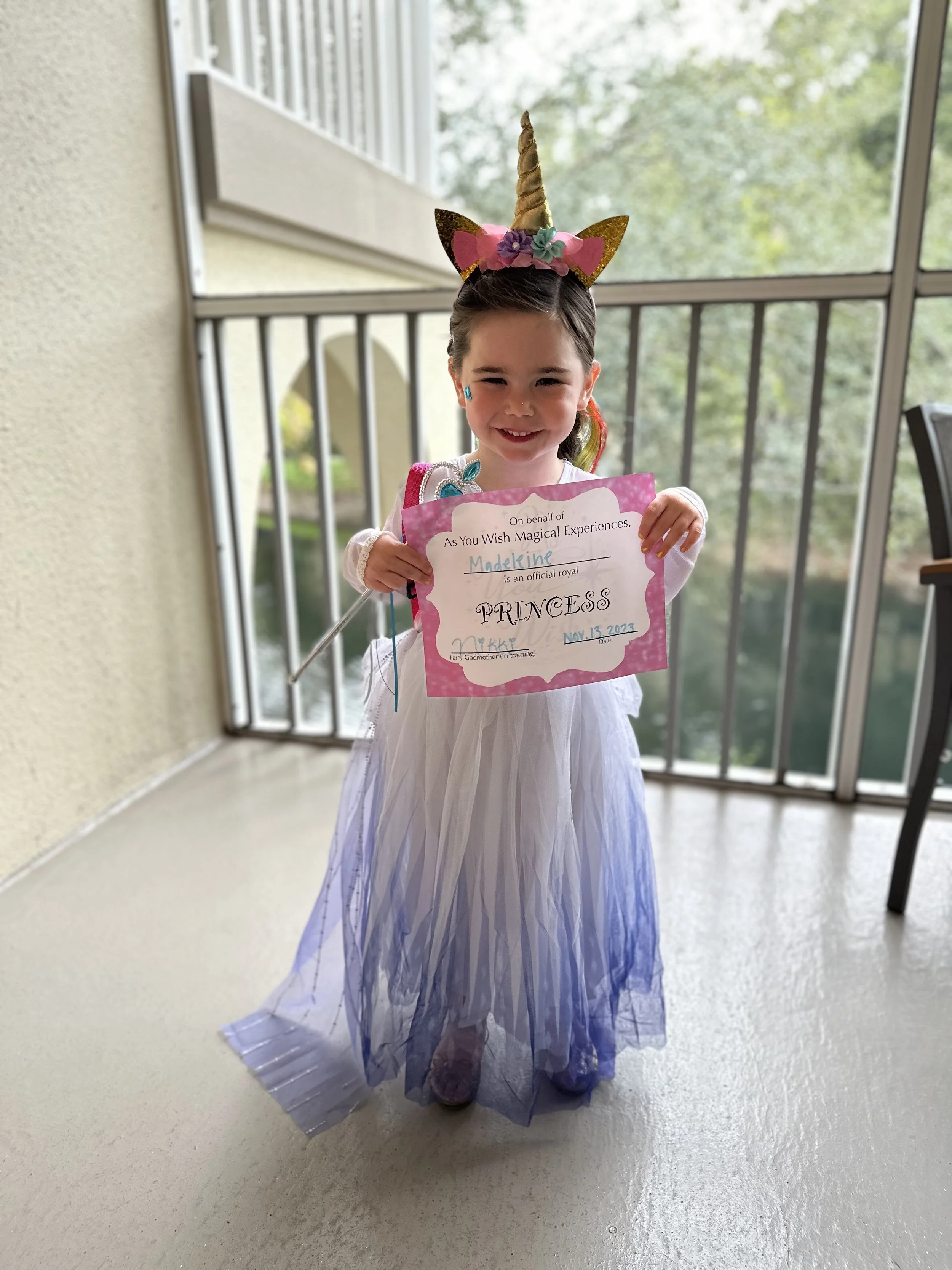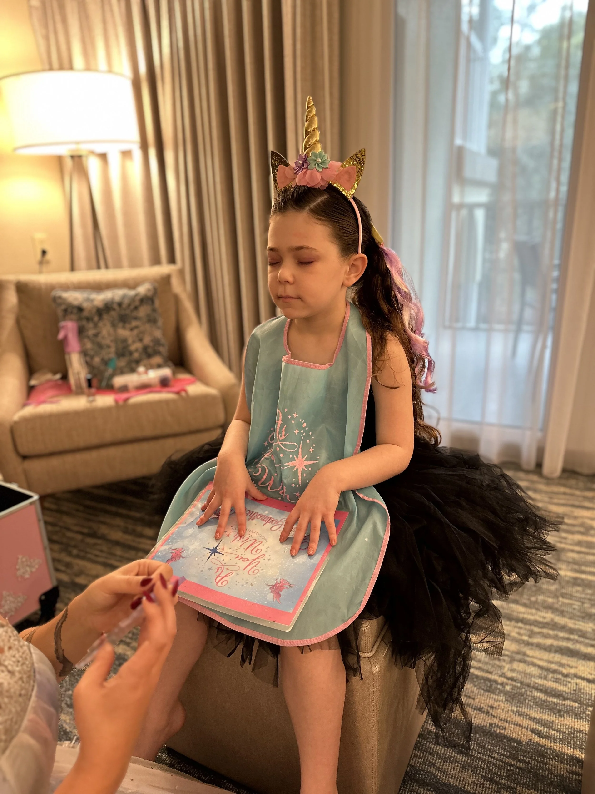 At least that’s what we heard at 8am when our two Fairy Godmothers arrived. Normally I would book the Bibbidy Bobbidi Boutique, but since Covid the one in Disney Springs closed and it’s impossible to get a reservation for the one in Magic Kingdom. Instead, we opted for one of the services that come to you! It was two young women dressed as fairy godmothers and they basically spent 45 minutes pampering the girls. It was the cutest thing and the girls really enjoyed it. We had let each girl decide in advance which princess they wanted to be. Madeleine chose Elsa and Hallie chose Sleeping Beauty, but the Sleeping Beauty costume never arrived and Hallie decided she just wanted to wear a black tutu. Then they each picked out the unicorn hairstyles, so they ended up being unicorn princesses.