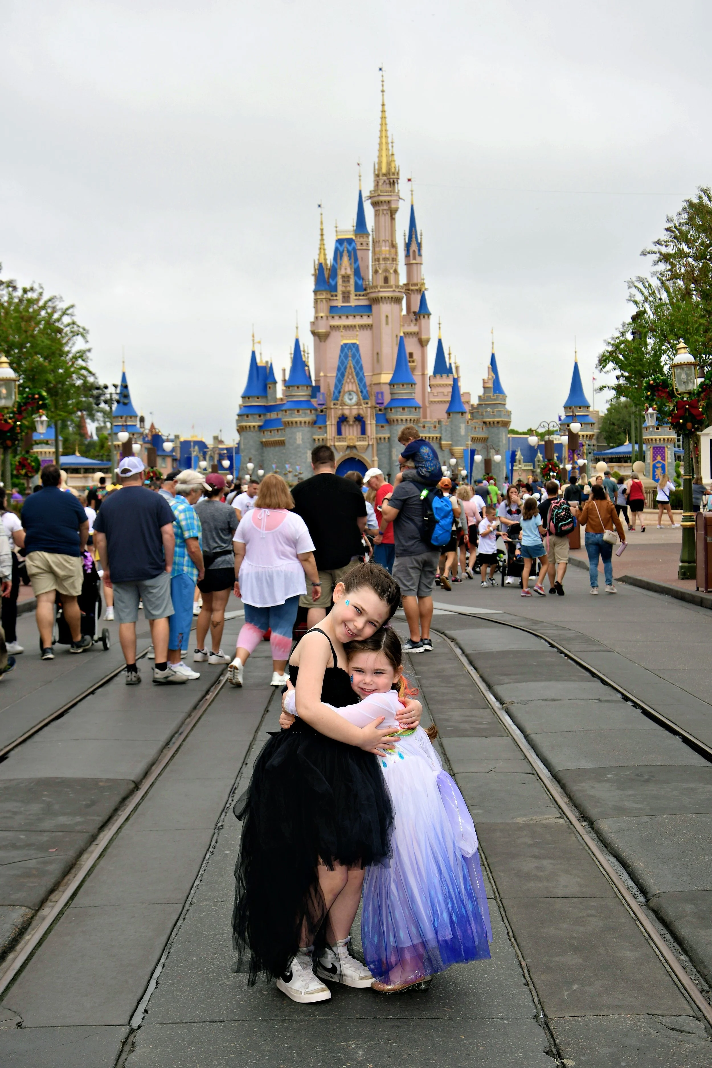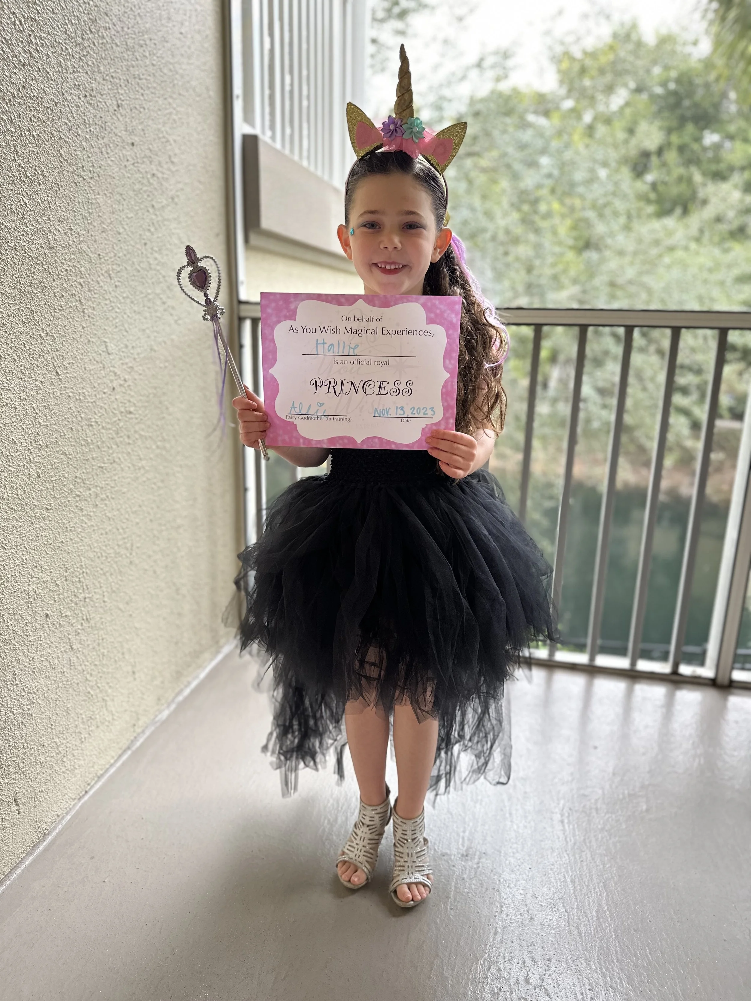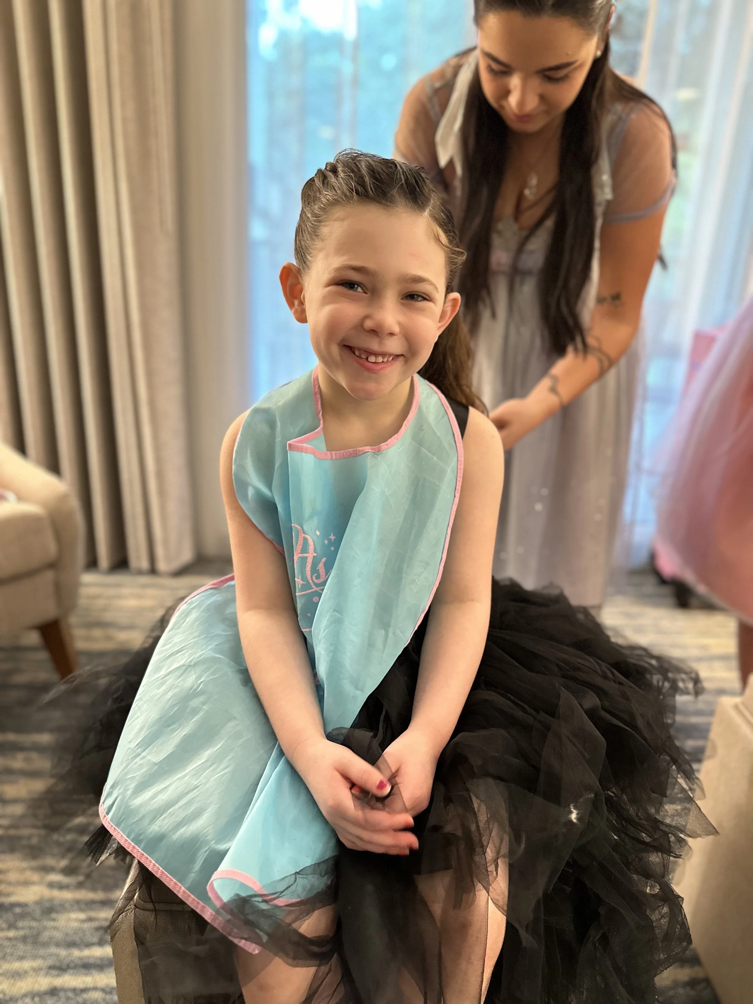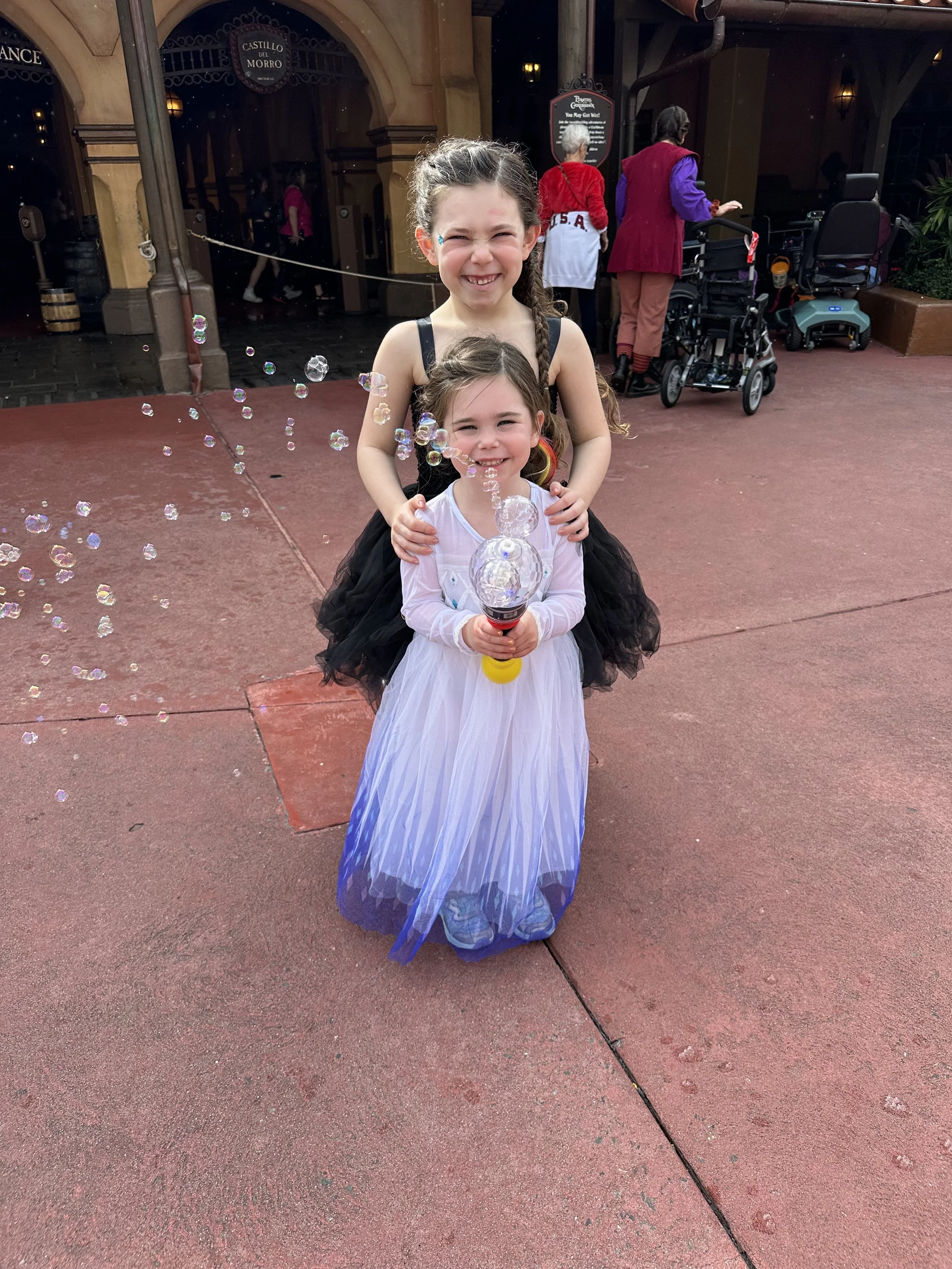 At least that’s what we heard at 8am when our two Fairy Godmothers arrived. Normally I would book the Bibbidy Bobbidi Boutique, but since Covid the one in Disney Springs closed and it’s impossible to get a reservation for the one in Magic Kingdom. Instead, we opted for one of the services that come to you! It was two young women dressed as fairy godmothers and they basically spent 45 minutes pampering the girls. It was the cutest thing and the girls really enjoyed it. We had let each girl decide in advance which princess they wanted to be. Madeleine chose Elsa and Hallie chose Sleeping Beauty, but the Sleeping Beauty costume never arrived and Hallie decided she just wanted to wear a black tutu. Then they each picked out the unicorn hairstyles, so they ended up being unicorn princesses.