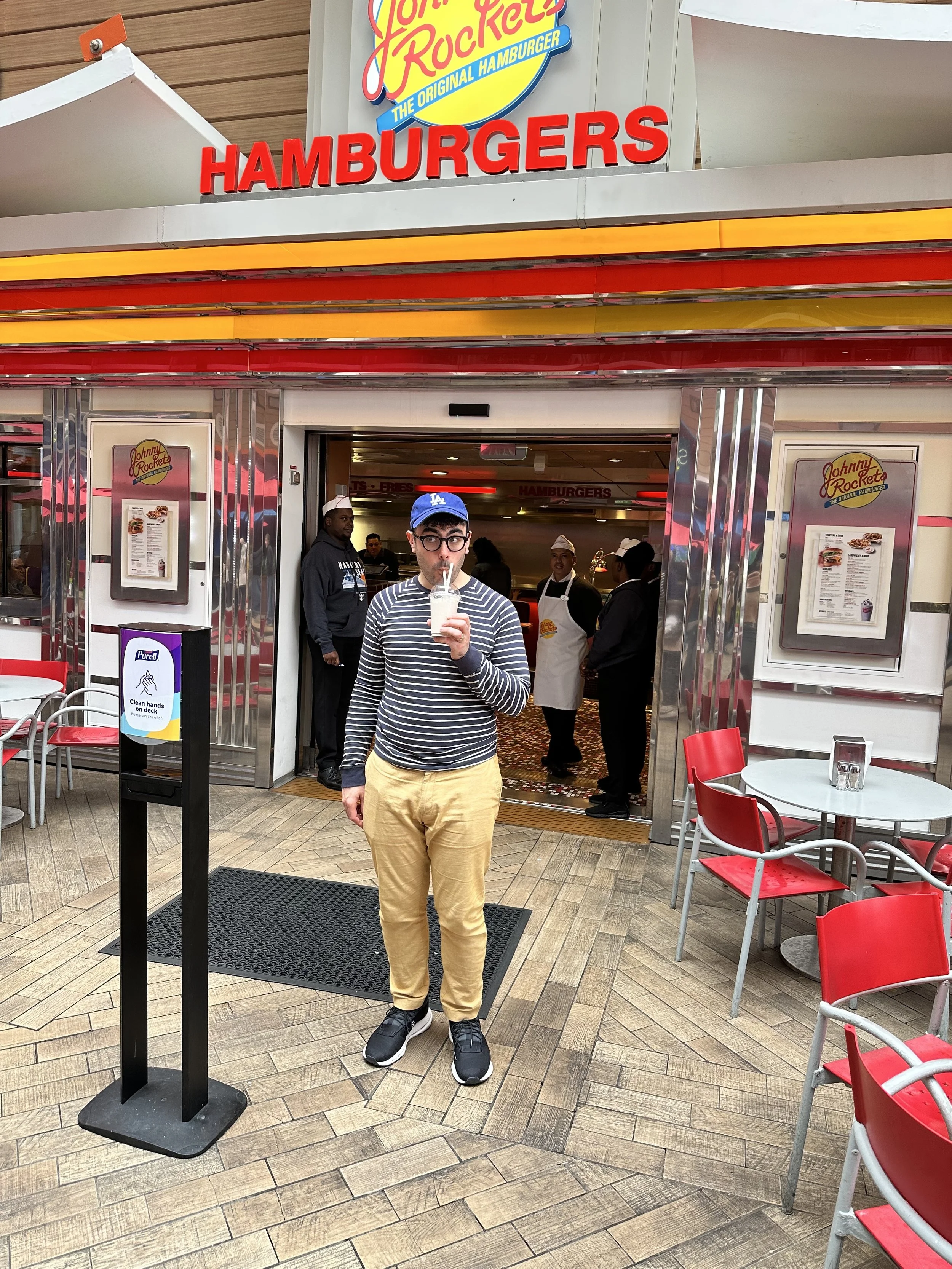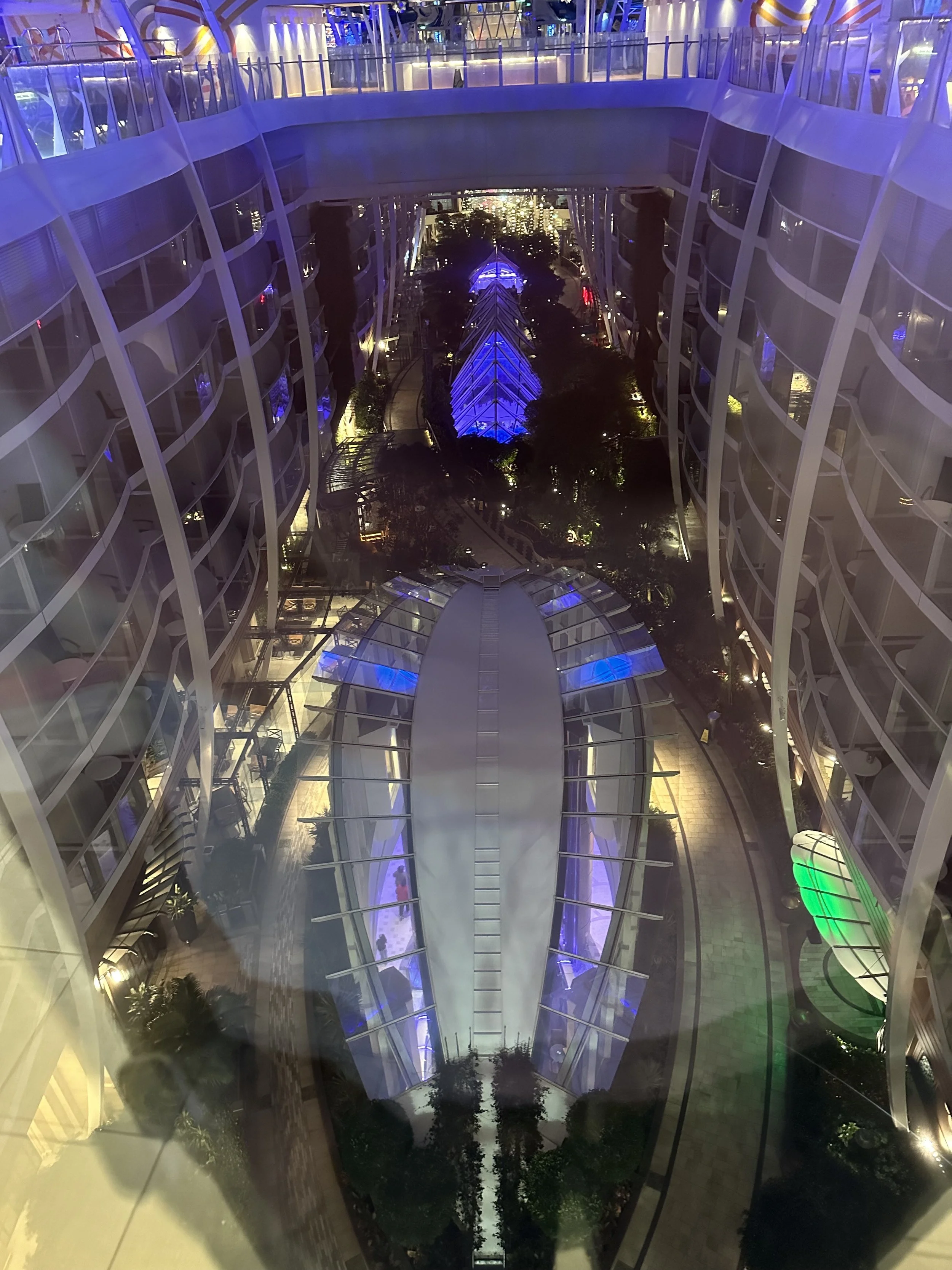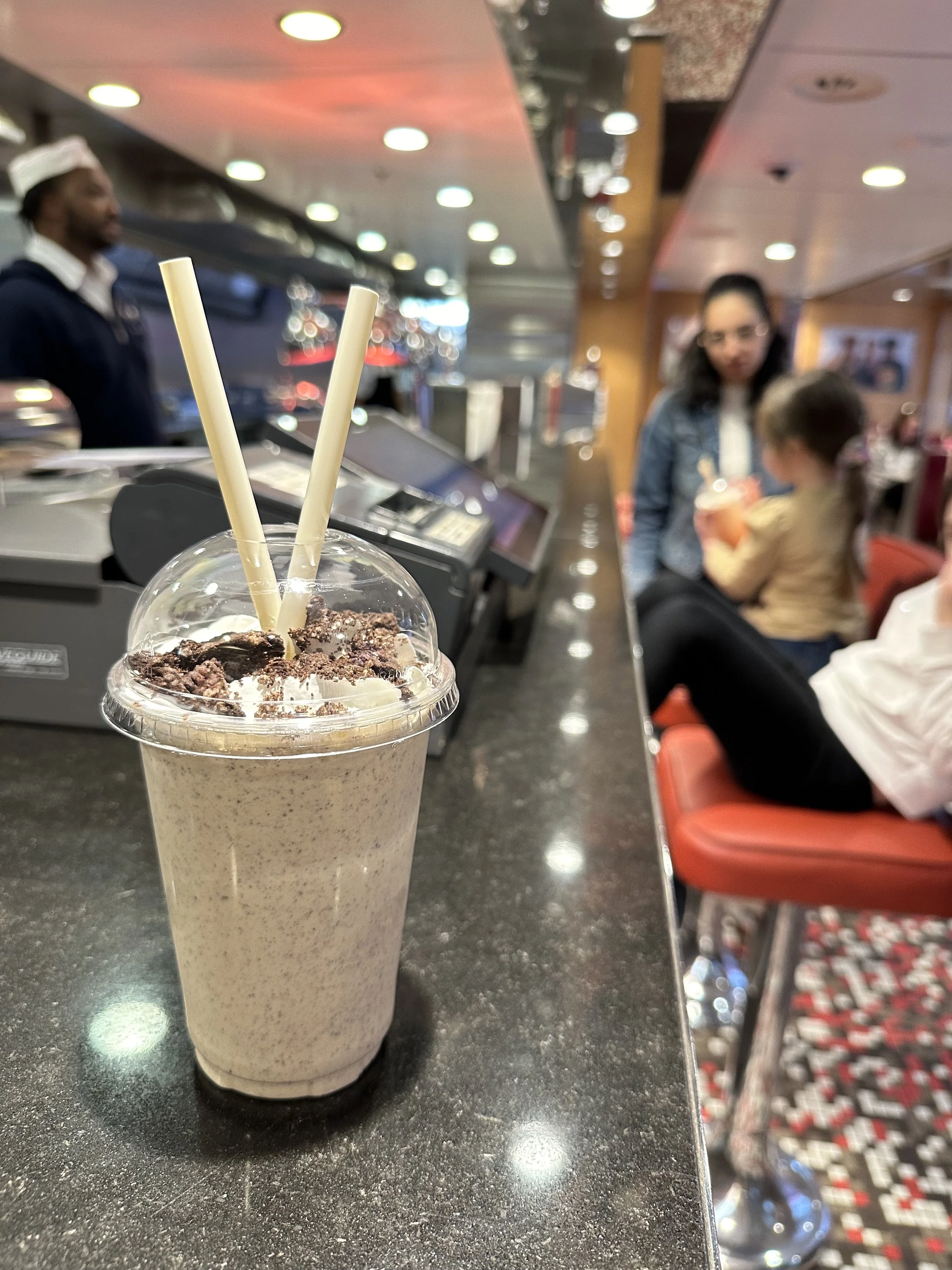 We went to our rooms, which are surprisingly spacious (in terms of cruise rooms). Our luggage wasn’t there yet, so we decided to explore the ship. A bit about the ship. We’re sailing on Royal Caribbean Harmony of the Seas, which is an Oasis class ship. Tzvi and I were on Allure of the Seas, a ship of the same class, so we remembered the layout (or at least I did). The ship is pretty massive and has several “neighborhoods” including the Boardwalk and Central Park (yes, a park with trees). There are three pools and a kids splash area, four water slides, a huge non-water slide that swirls around over the back of the ship and an outdoor “aqua-theater”. Unlike our most recent cruises, drinks weren’t included in our cruise fare, so Tzvi and I got the deluxe beverage package. One nice thing to find out was that the milkshakes at Johnny Rockets are included in the Deluxe Beverage Package. Starbucks Coffee on the other hand, is not (there is an actual Starbucks on board – not a ‘we proudly brew Starbucks’ (though they have that too), but an actual Starbucks). There are only two places to get a decaf cappuccino on this ship. I don’t get it.