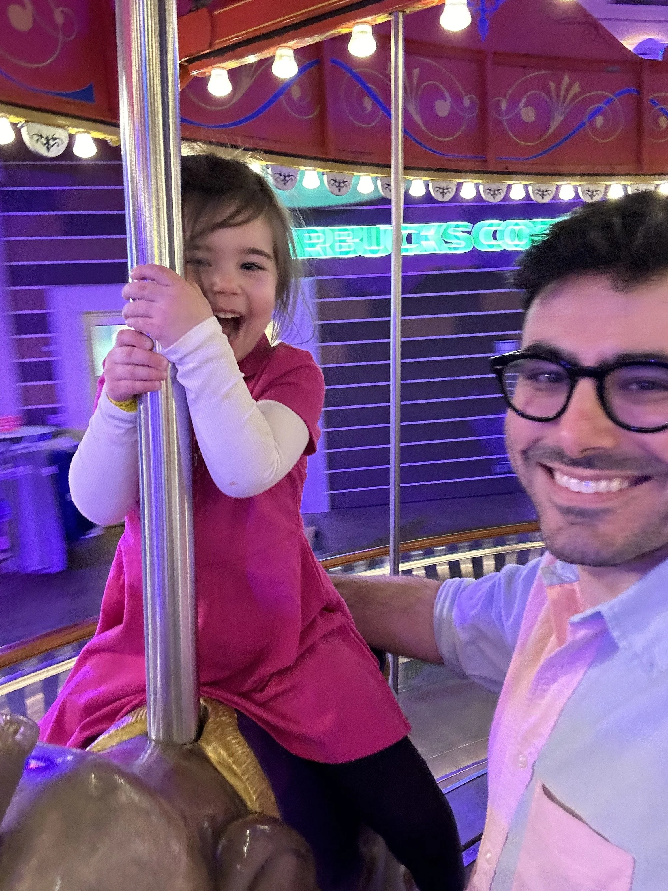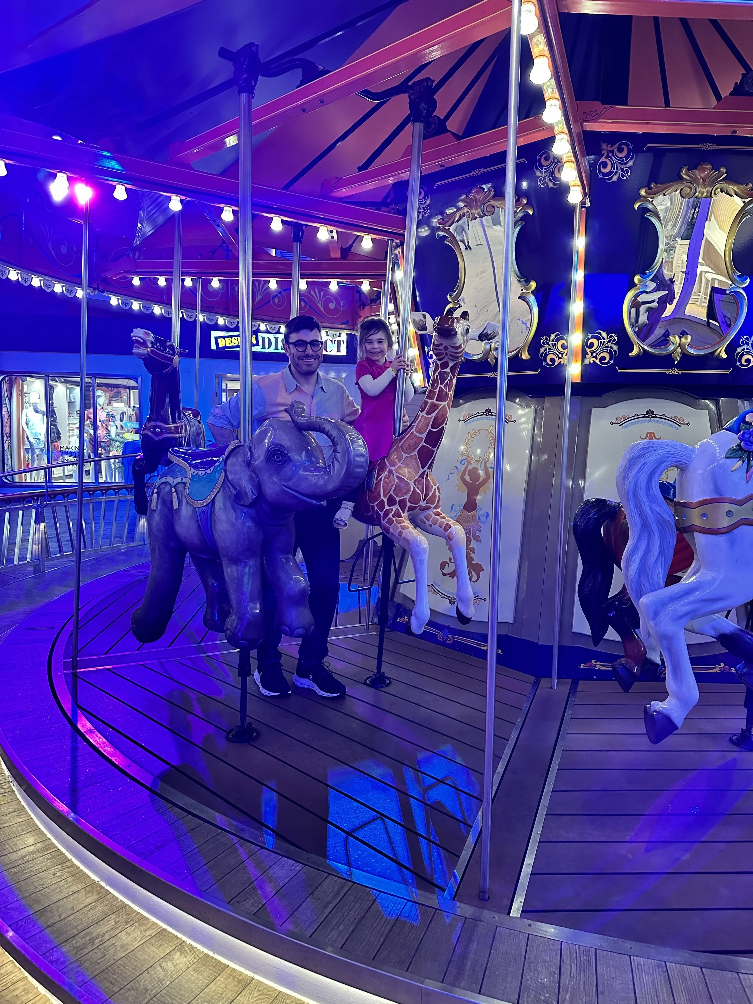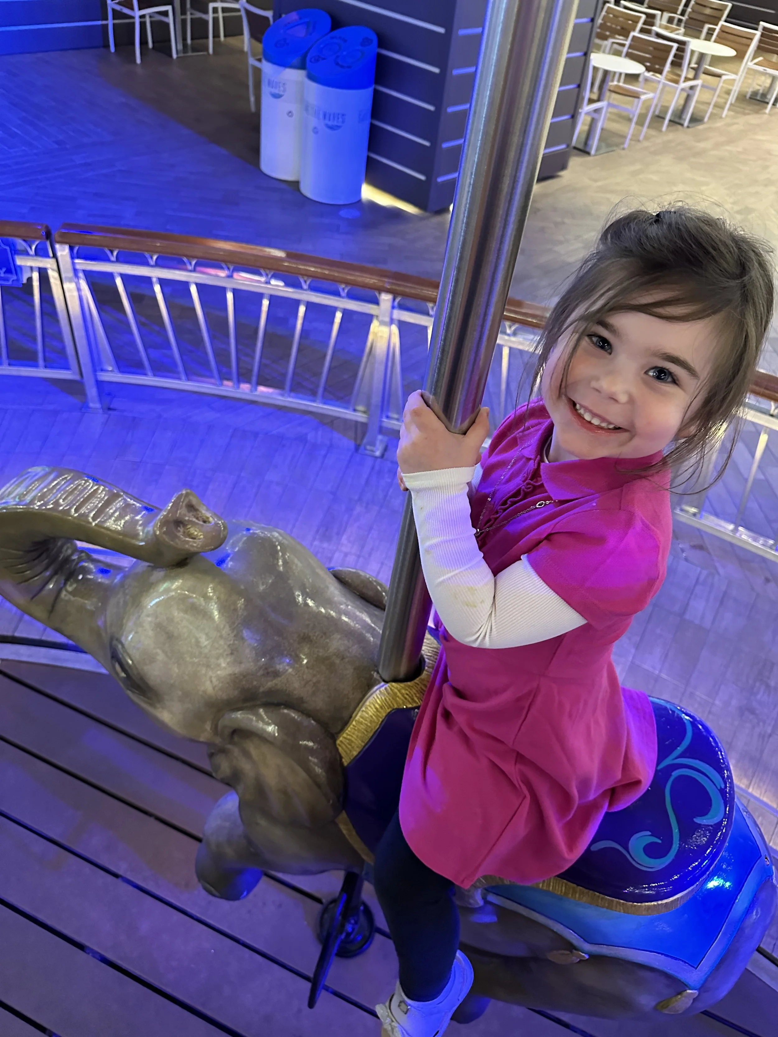 After dinner we walked around and saw more of the ship. I took Hallie for her first strawberry daquiri at one of the bars and Tzvi and Madeleine checked out the Boardwalk where Madeleine discovered the carousel. Except, she didn’t call it a carousel or merry-go-round, she called it “the ‘Merican Round.” And none of us corrected her. For seven days. And yes, there really is a full size carousel on this ship, and I think Madeleine’s mind was blown by the fact that she could just ride over and over again for the whole cruise.