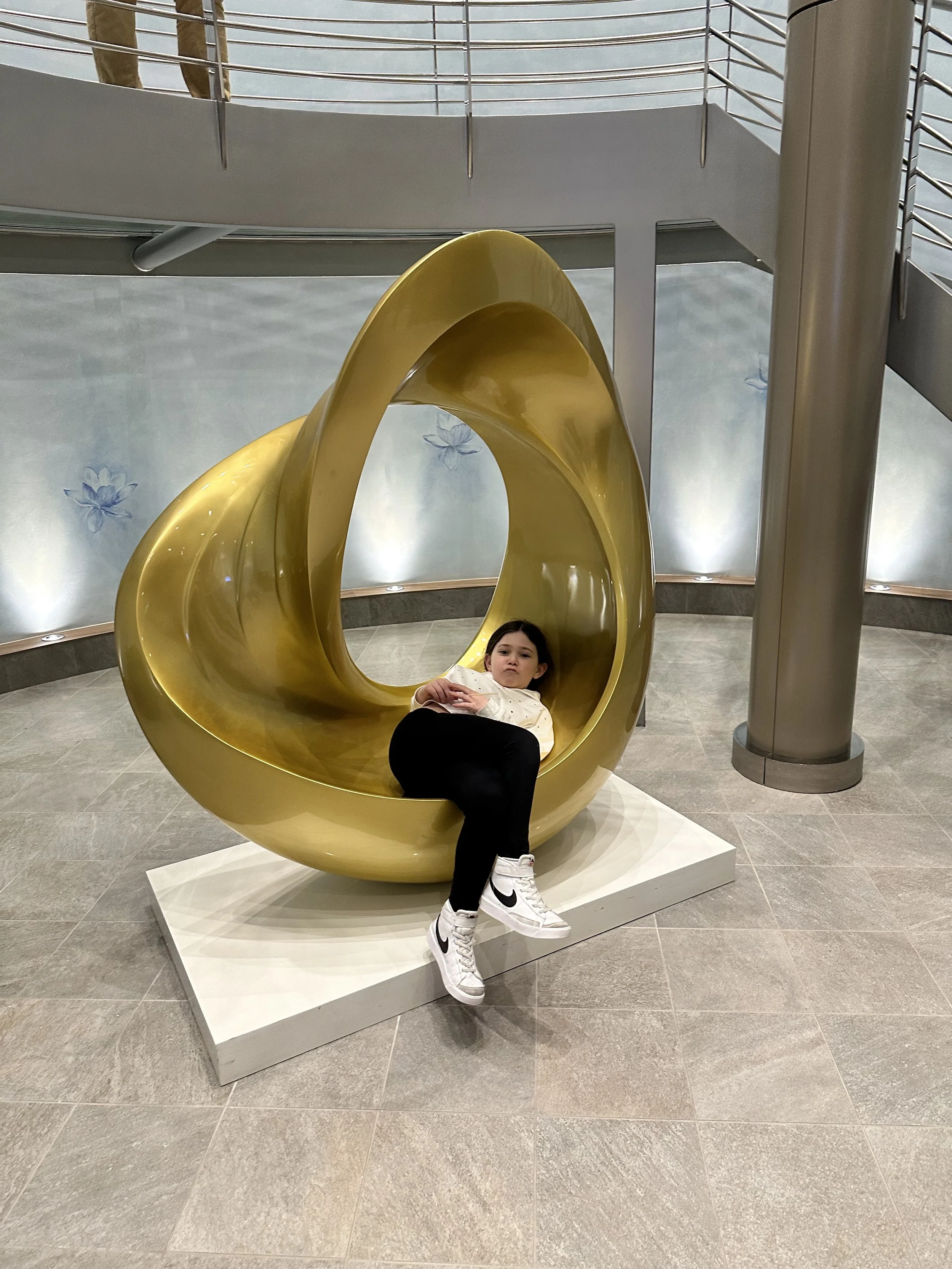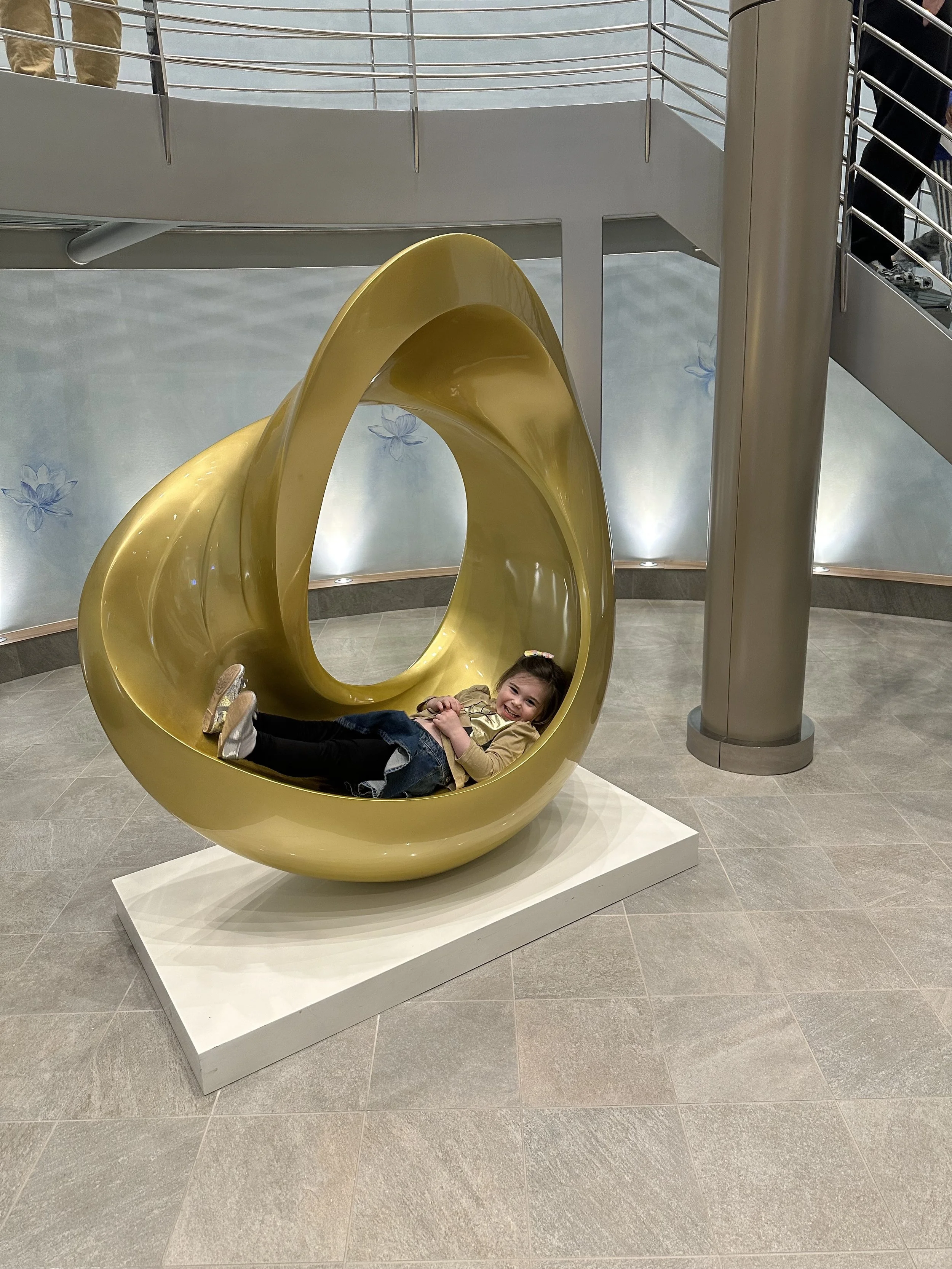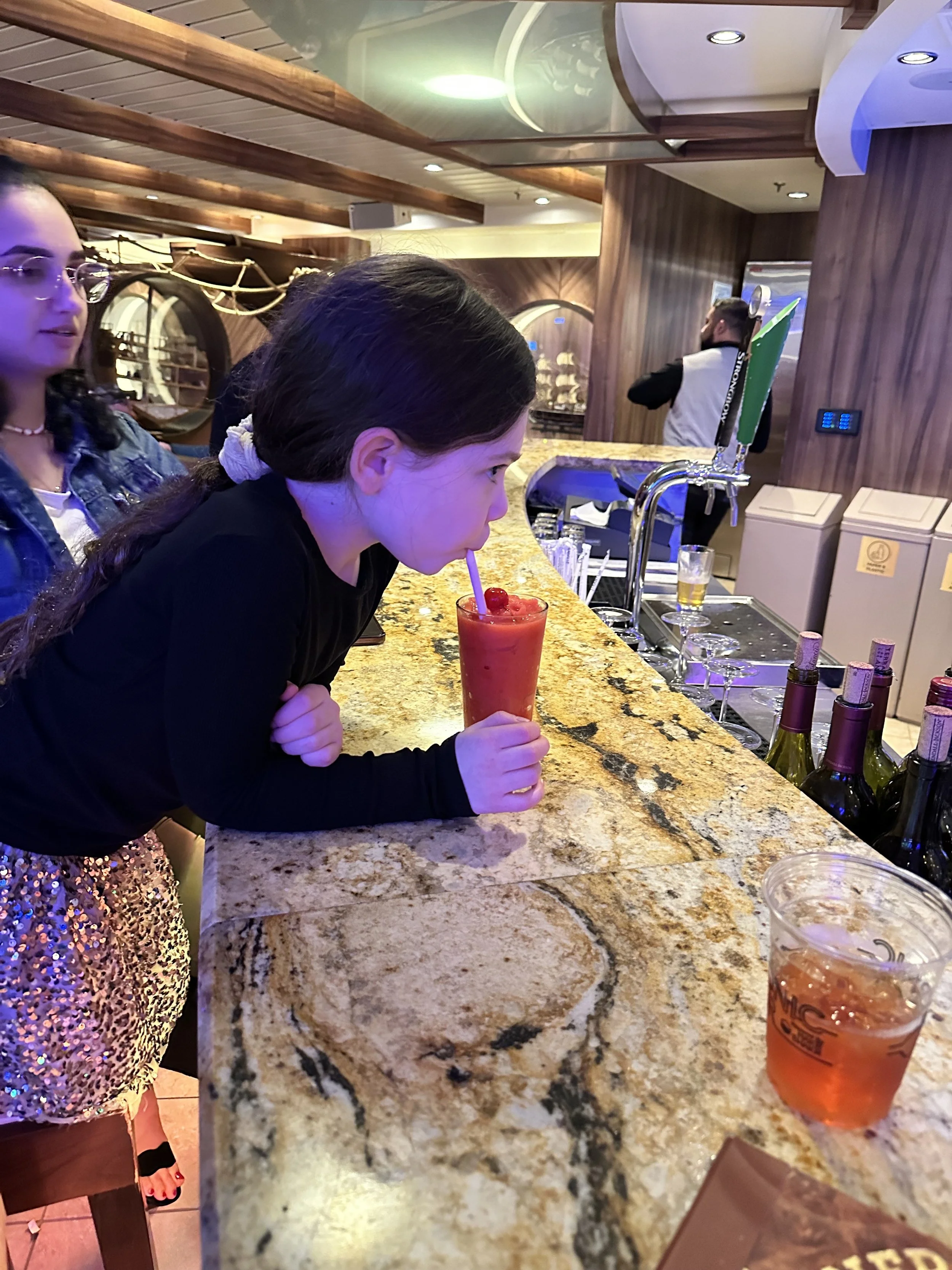 After dinner we walked around and saw more of the ship. I took Hallie for her first strawberry daquiri at one of the bars and Tzvi and Madeleine checked out the Boardwalk where Madeleine discovered the carousel. Except, she didn’t call it a carousel or merry-go-round, she called it “the ‘Merican Round.” And none of us corrected her. For seven days. And yes, there really is a full size carousel on this ship, and I think Madeleine’s mind was blown by the fact that she could just ride over and over again for the whole cruise.
