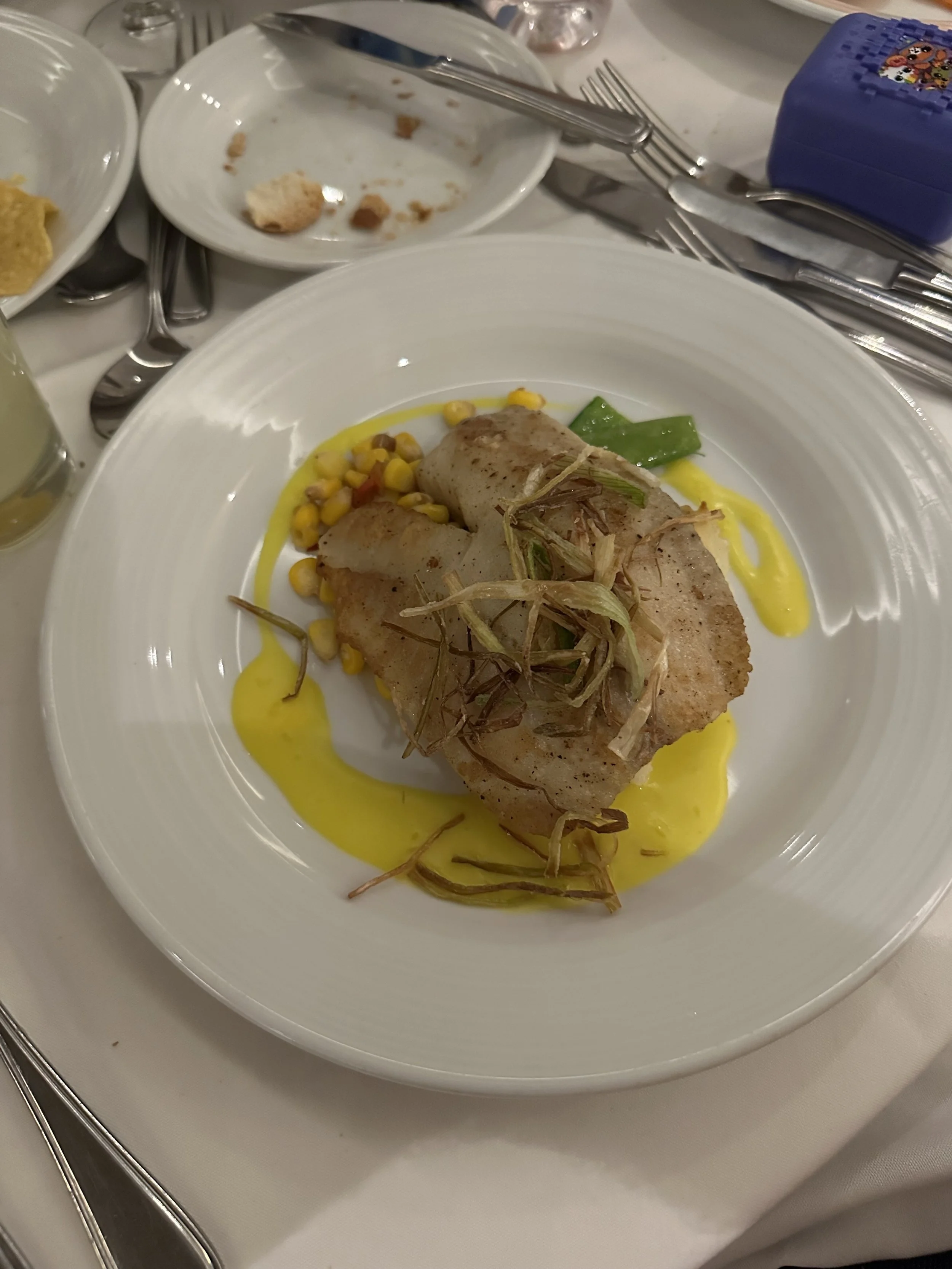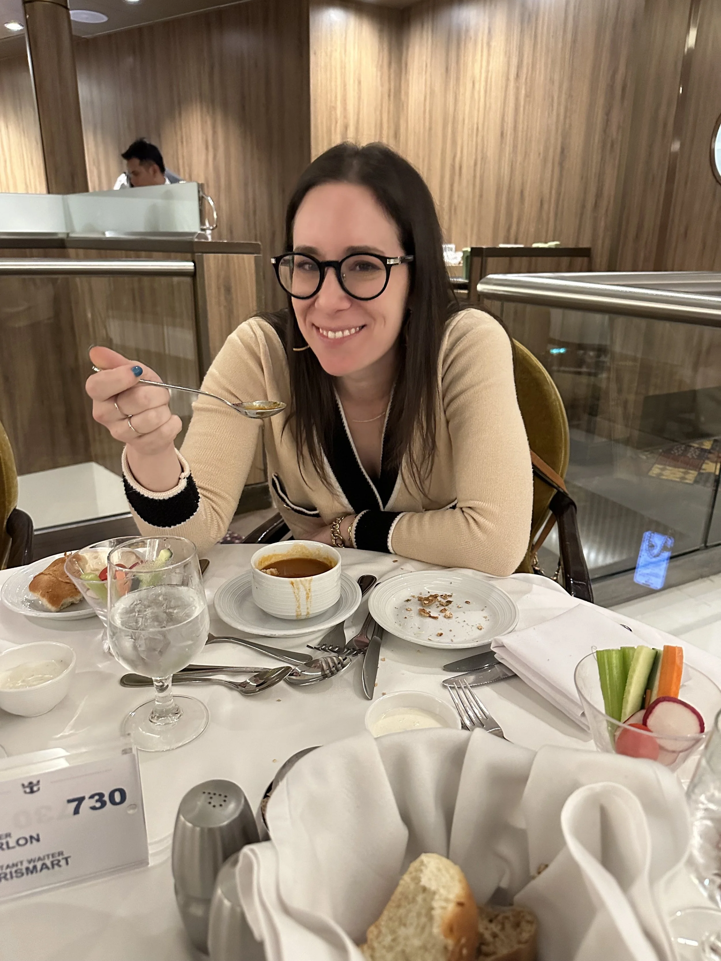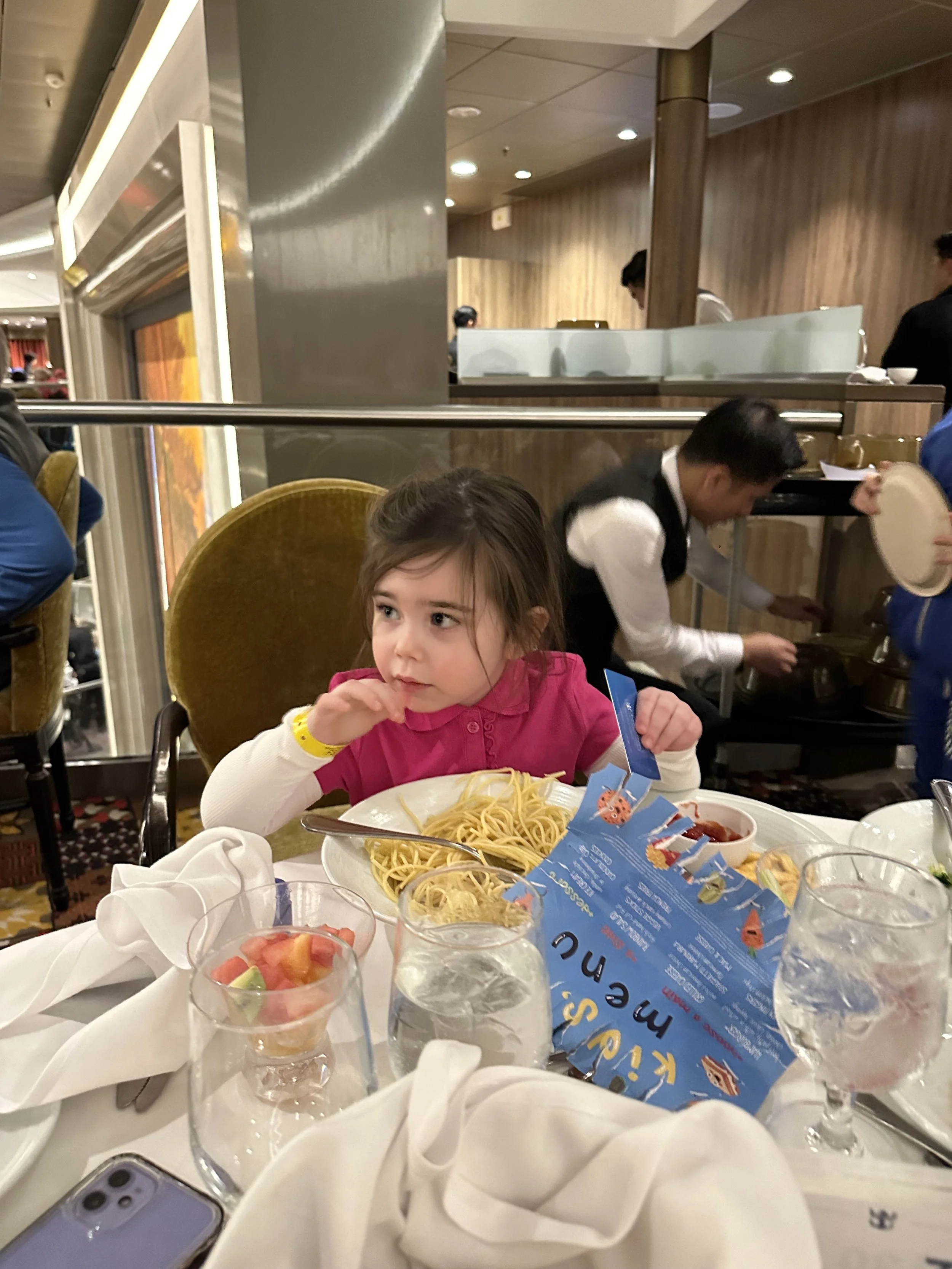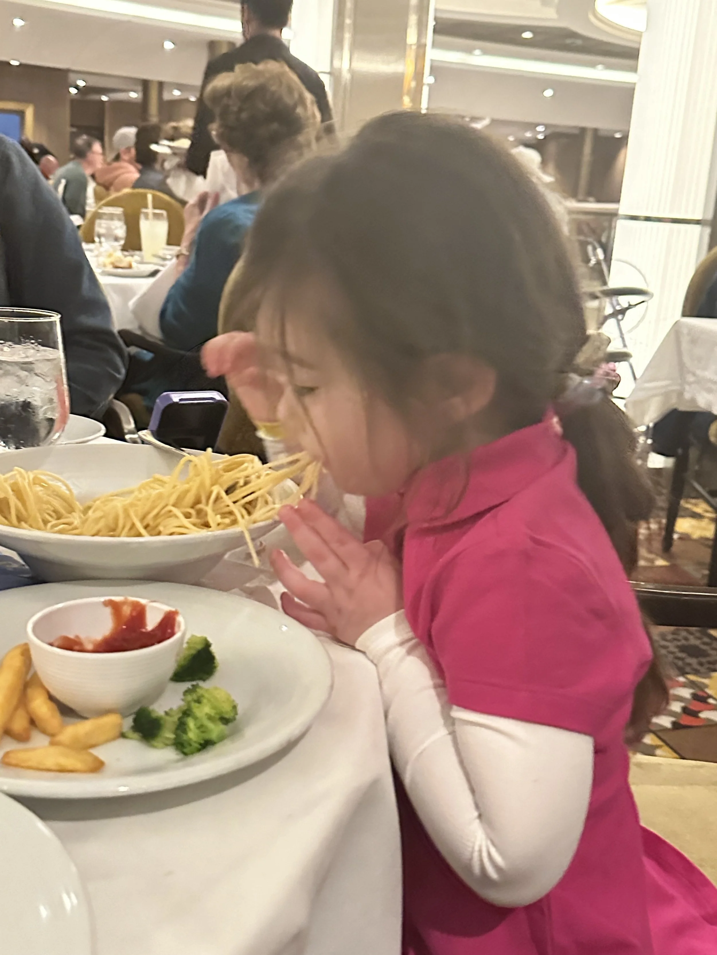 Before taking this cruise we had read that the included food (i.e., no extra charge) is sub-par, and the food you pay extra for is very good. That was certainly true. I still love the idea of eating in the grand-three-level dining room and having the same waiter every night, but even I have to admit the days of this cruise standby are probably coming to an end. It just wasn’t what it used to be, especially when it comes to the food. On Royal I think they really don’t put too much effort into the dining room food because they want you to eat in the specialty restaurants. We had a tomato soup, which kind of just tasted like tomato sauce. Tzvi had halibut and I had salmon. Madeleine ate all of the noodles.