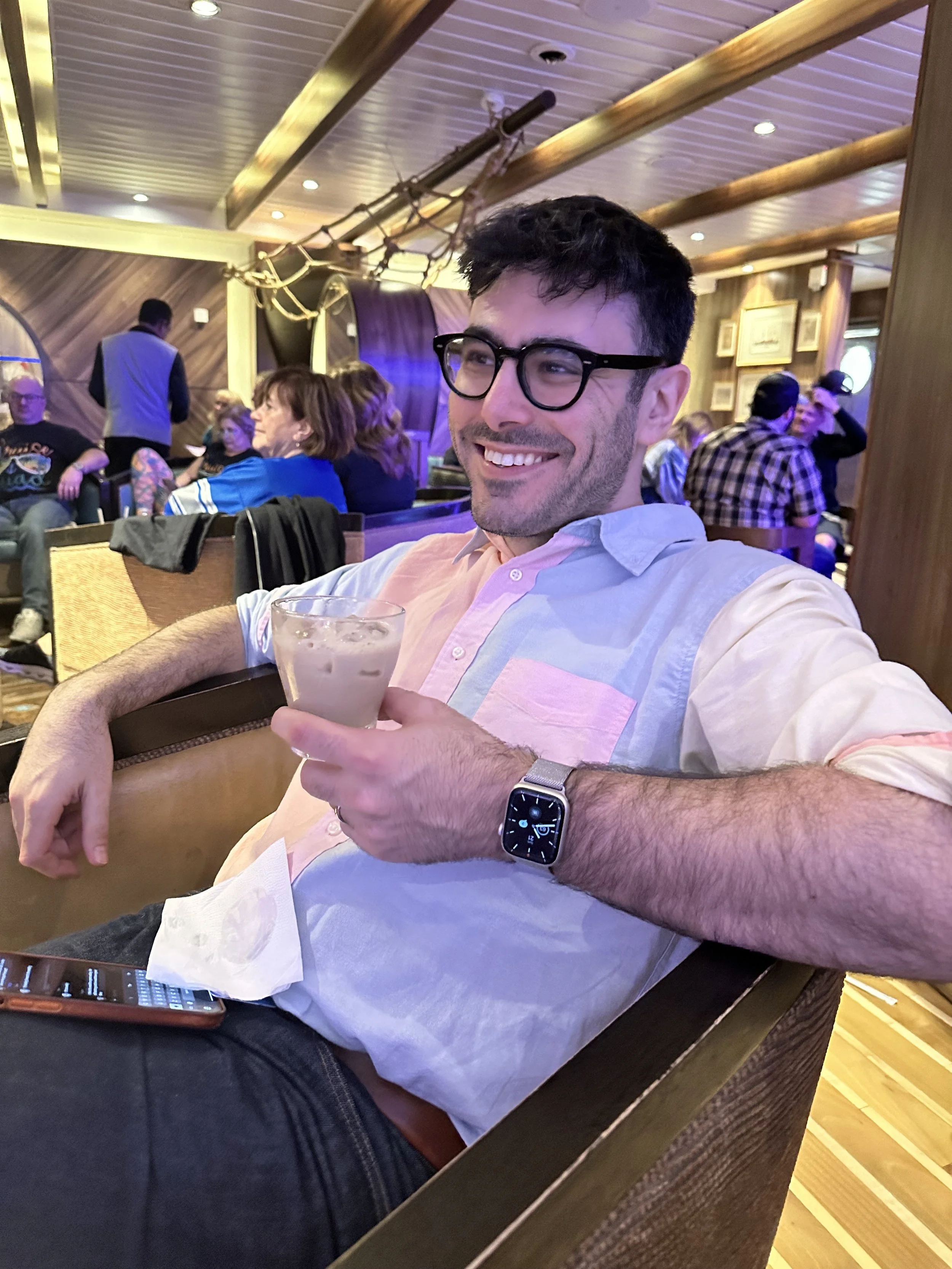Tzvi and I figured that this would be like our last cruise, where we would end every night drinking cappuccino and kahlua and cream, eating whatever the dessert of the day is and discussing the day’s events. Unfortunately, there’s just nowhere to do that on this ship. We had to get the cappuccino at the Café Royal on the Royal Promenade, which is the one place that makes decaf cappuccinos (the other being the spa, which was closed). Then we had to go to another bar to get a Kahlua and Cream, which was delicious because you can’t screw that up. But there was nowhere to get cake. Café Promenade did have some desserts but they just did not look good.