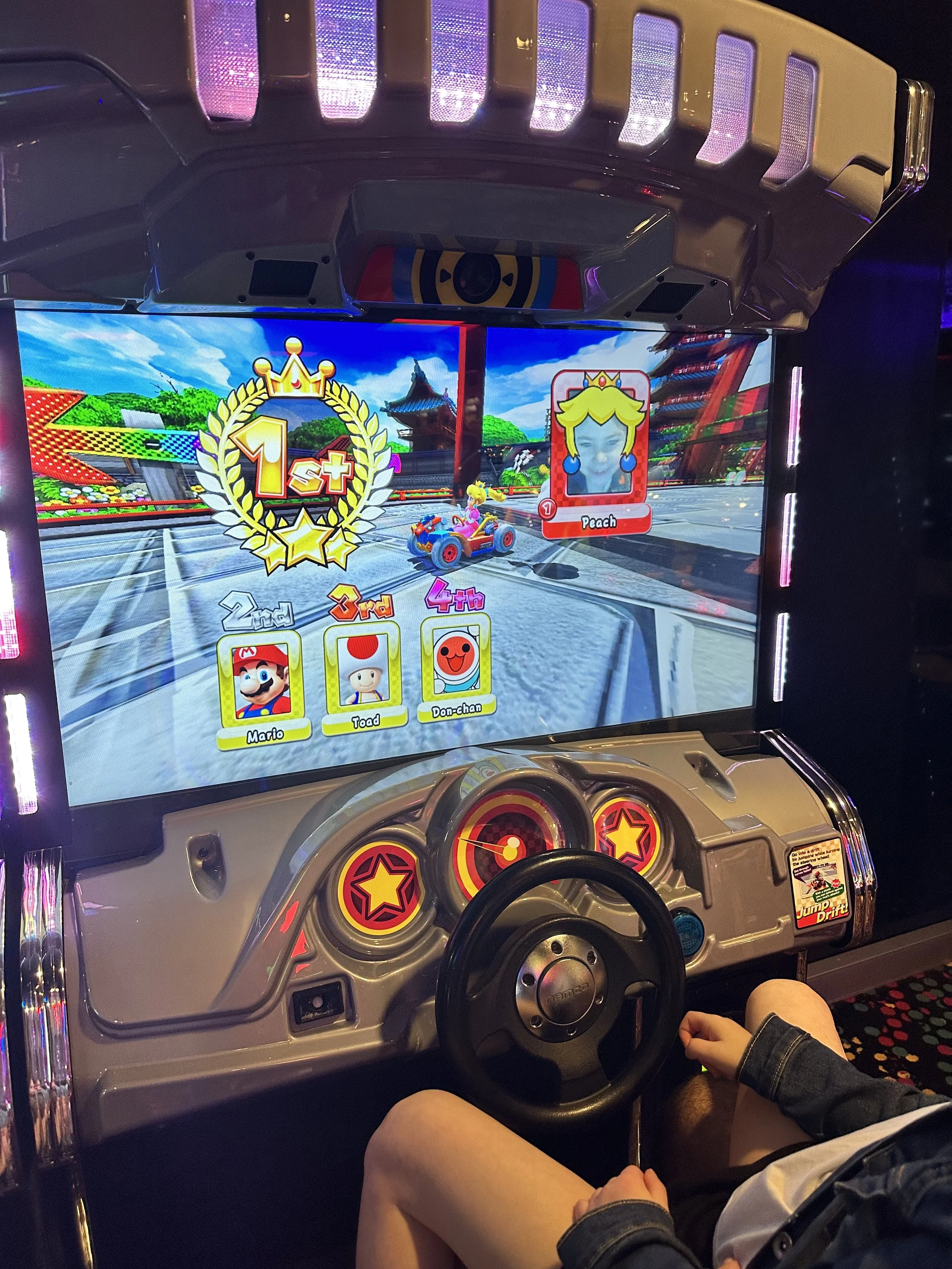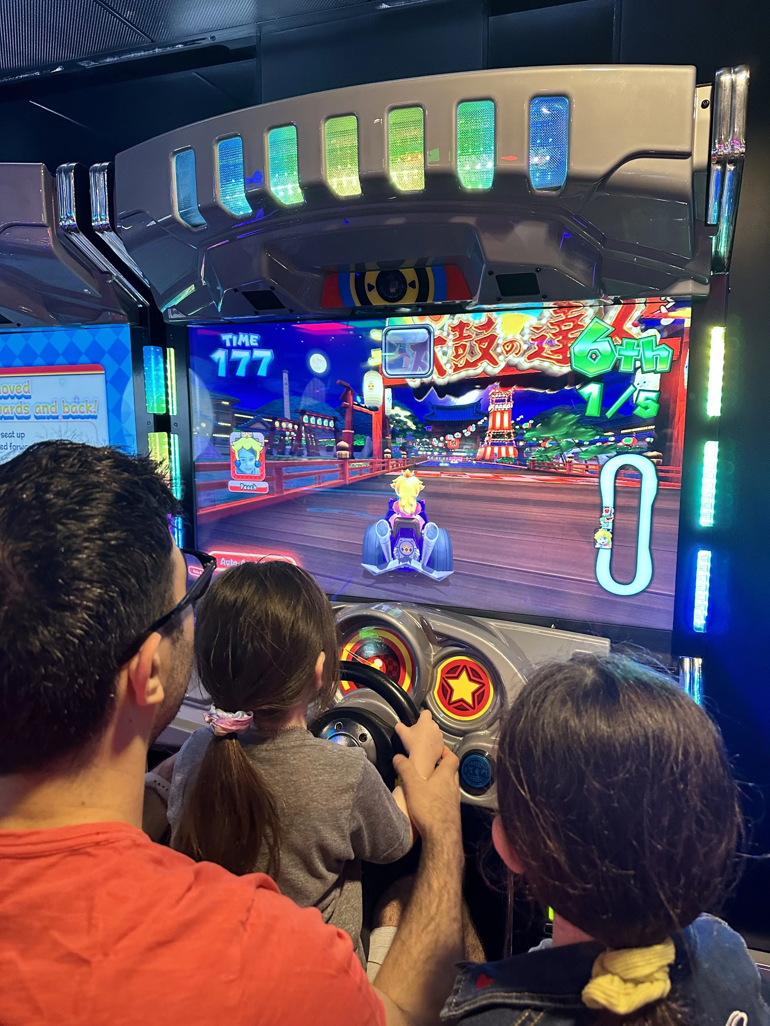Then it was raining and windy so we explored more of the inside areas. We found the arcade where we played air hockey, Hallie injured her finger on the puck, and then the girls wanted to play Mario Kart.After that we went to Broadway Musical trivia, which we didn’t do very well in, and then it was lunchtime. We went upstairs to the buffet only to find a long, long line. They basically said it was too crowded so they let people in 15 at a time. I don’t get it. Don’t make a ship for 6500 people if you can’t handle it. The real problem was that everyone was inside because of the meh weather. We got the same table we had for breakfast.