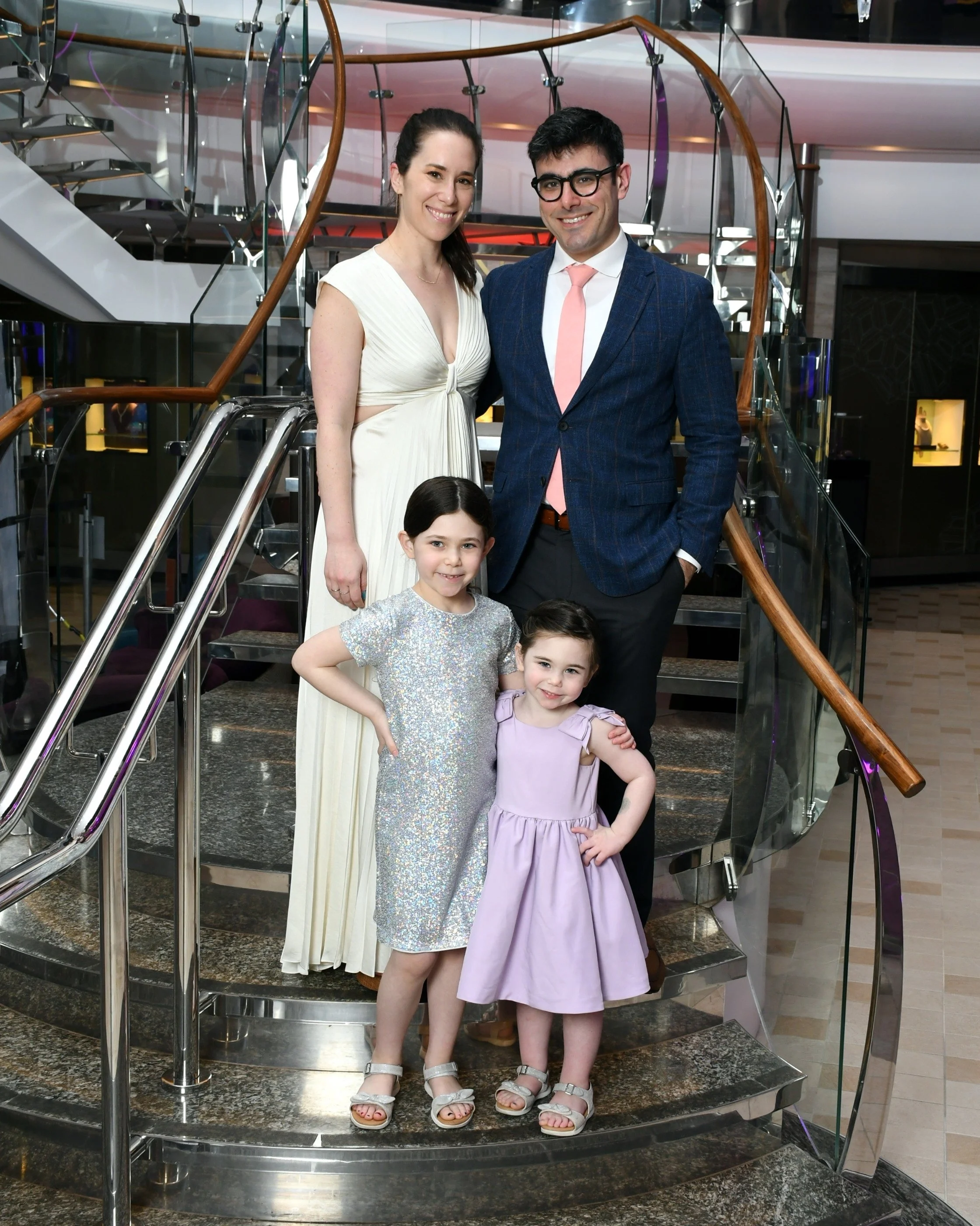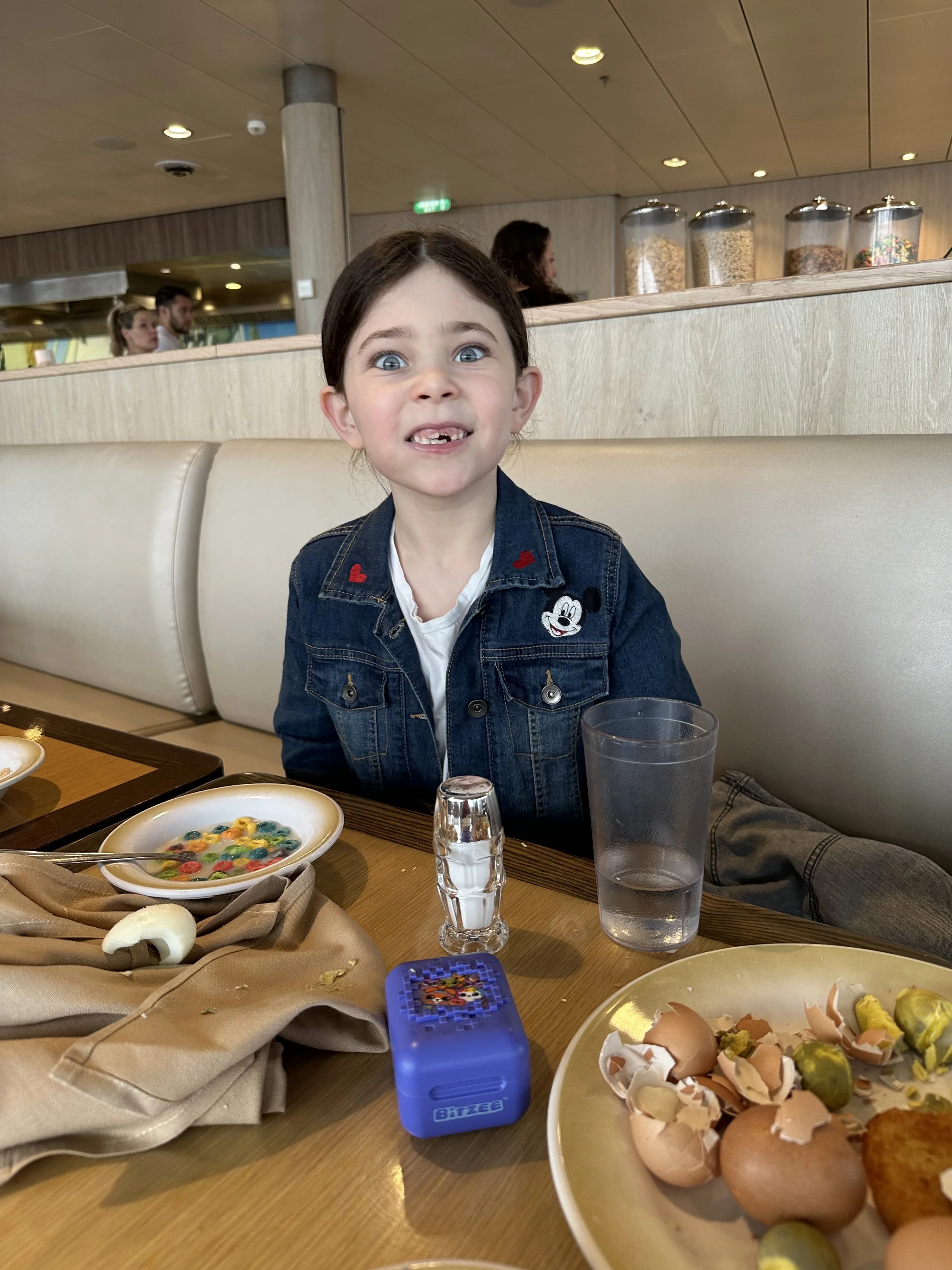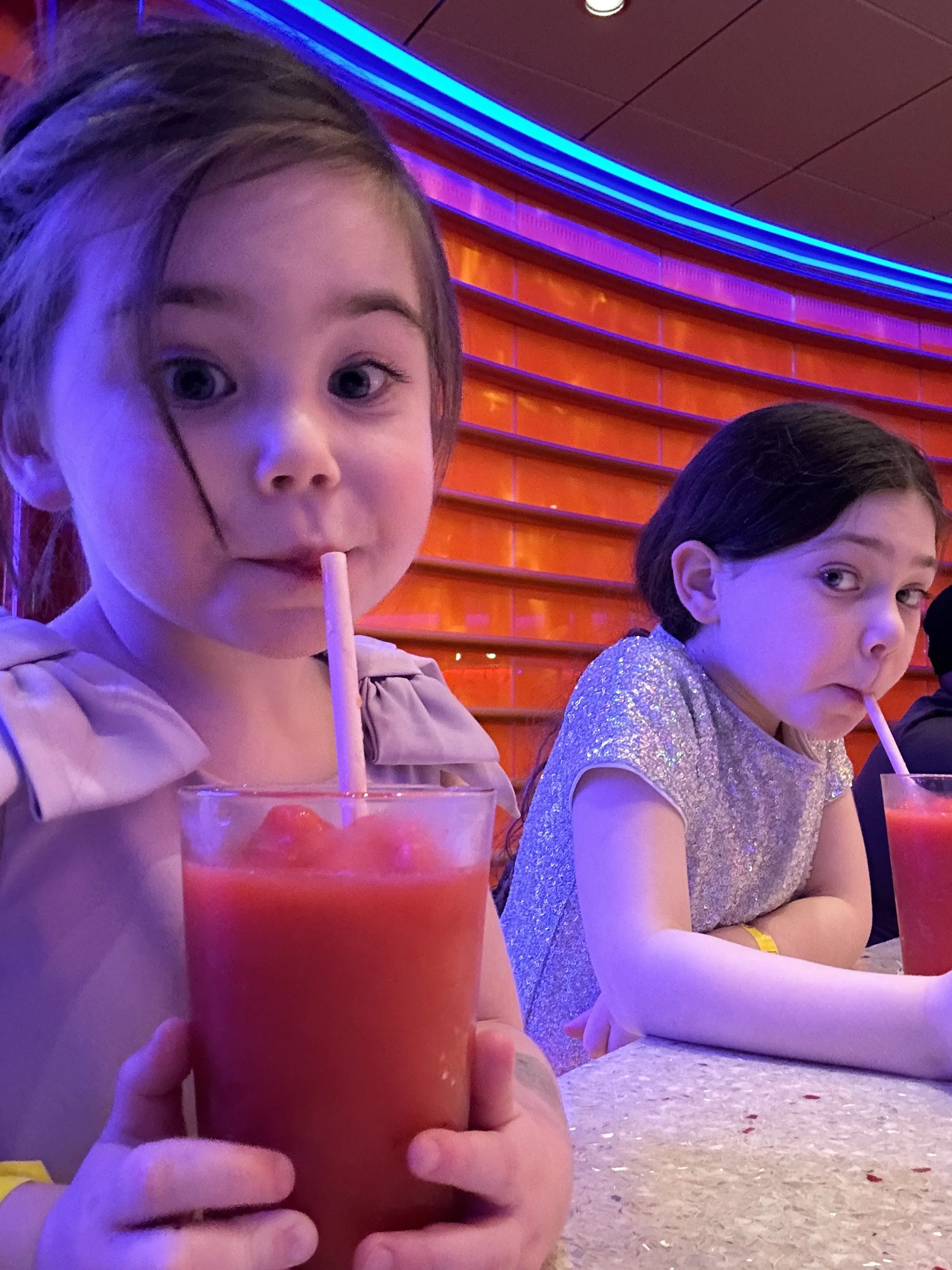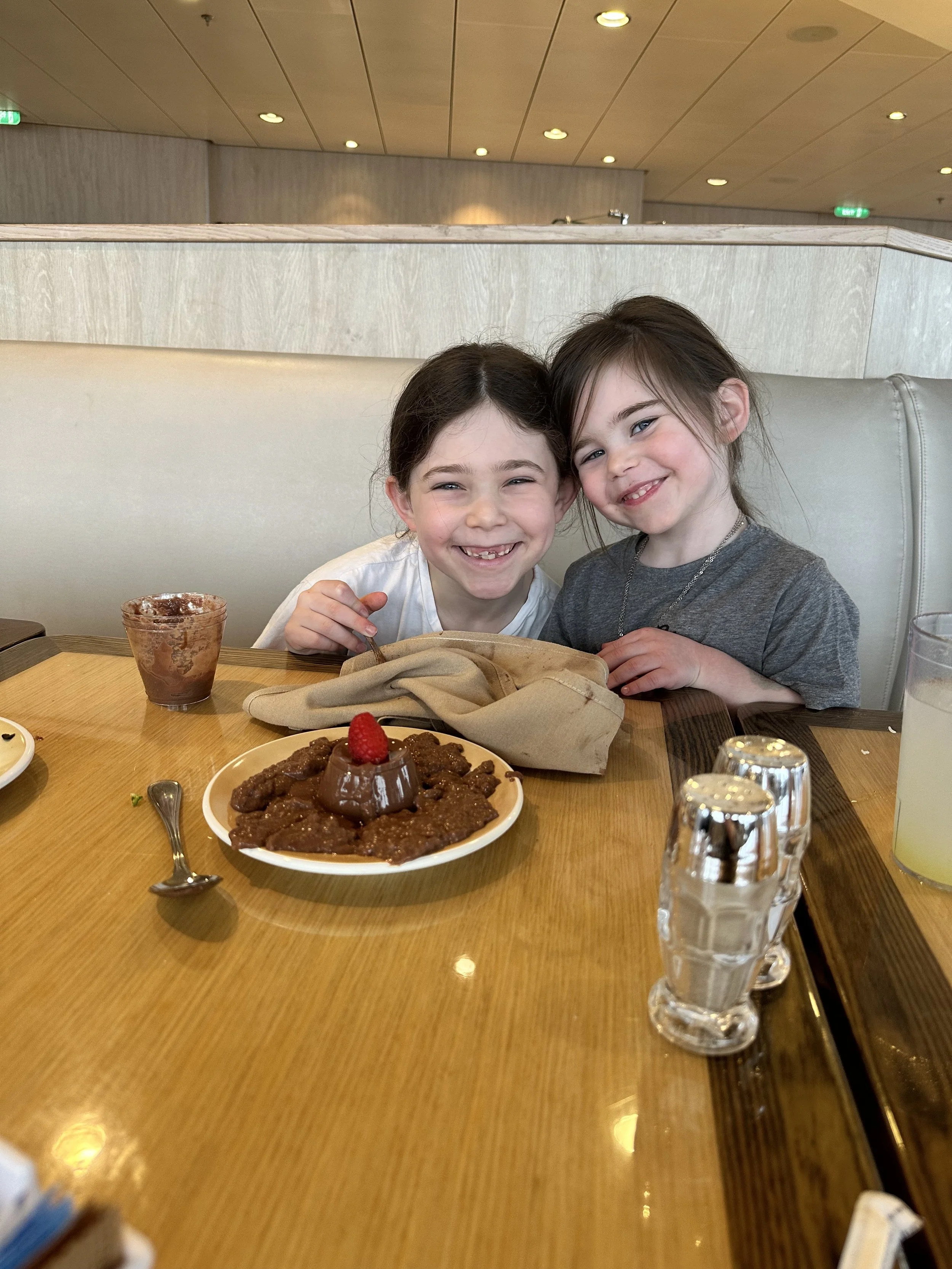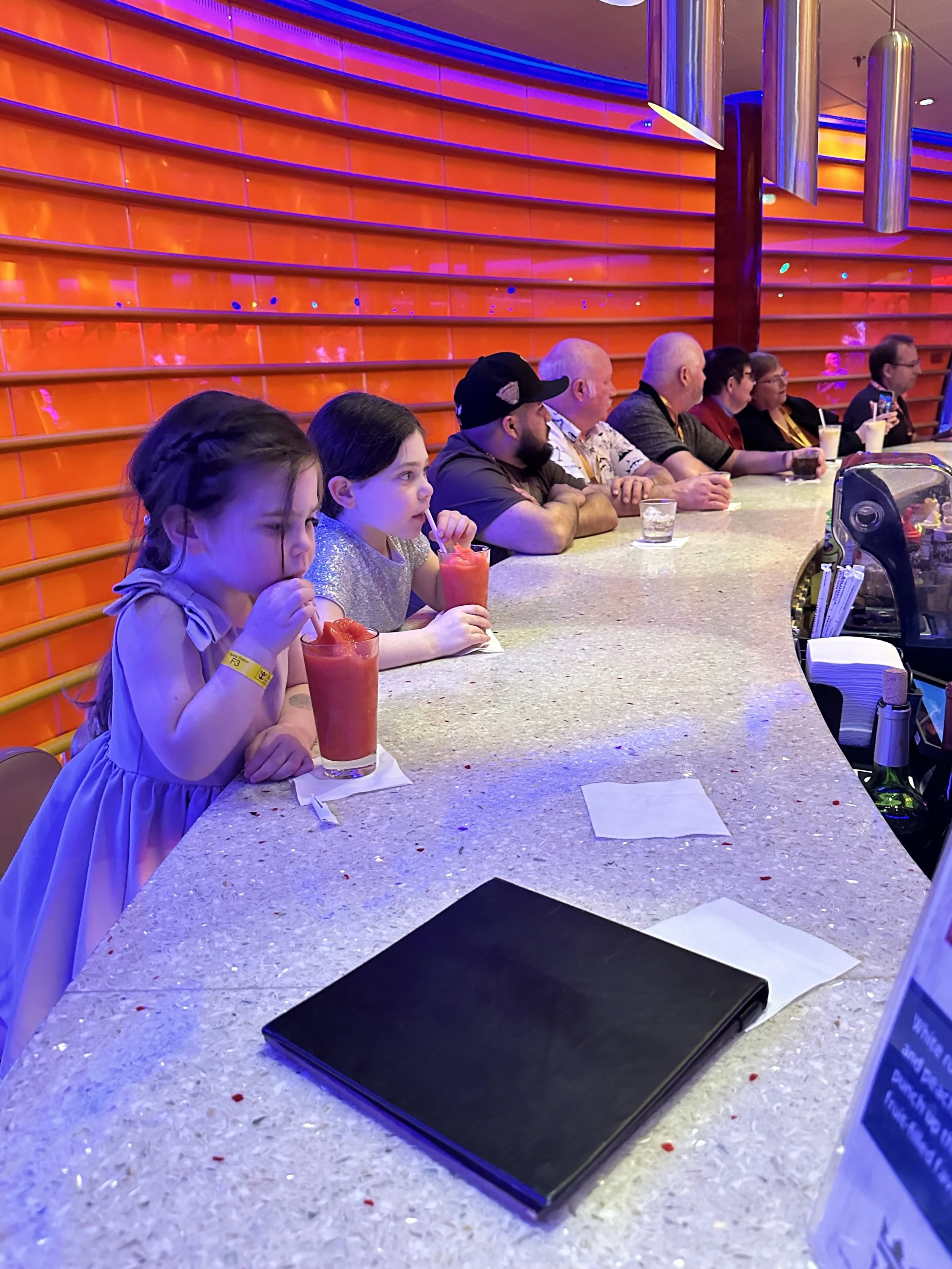 We tried to go for a snack but the buffet closed at 8:30! I don’t get it. People like to eat on cruises. Why are they starving us? Instead we took the girls to one of the bars on the promenade and they got strawberry daquiris. At some point we realized Madeleine had lost her white sweater. Tzvi thinks she left it at dinner and they probably swept it up with the white napkins and sent it down to main laundry. Either we’ll never see it again or that’s more free laundry.