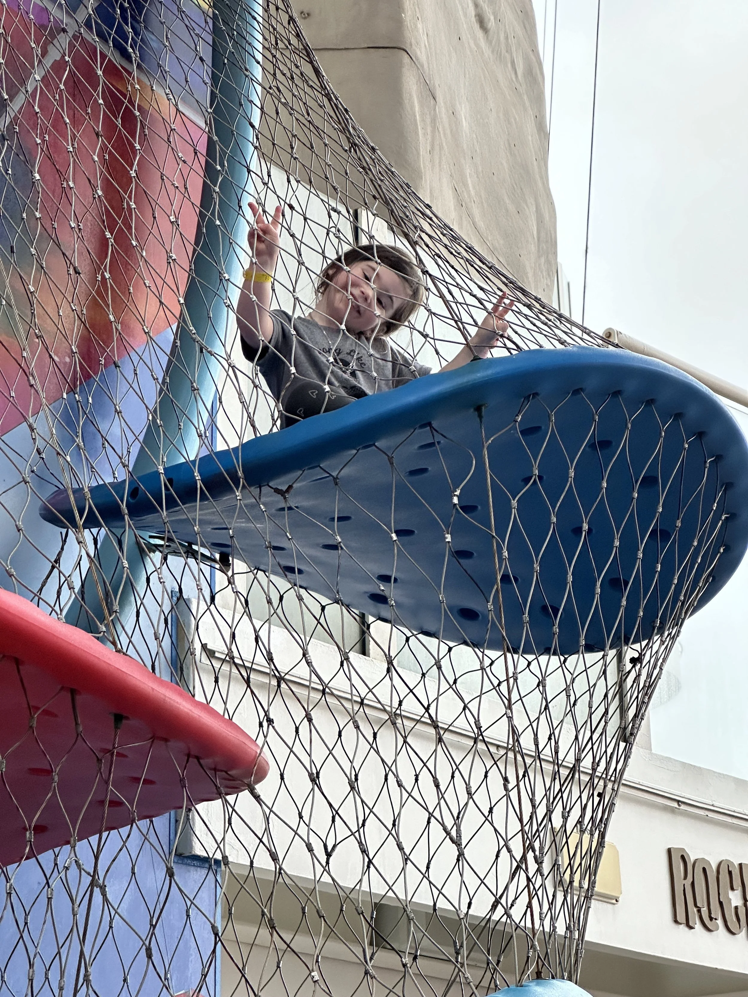 While we did that, Tzvi took Madeleine to the Boardwalk. They rode the ‘merican round several times, and then Madeleine discovered the climbing wall, which she absolutely loved.