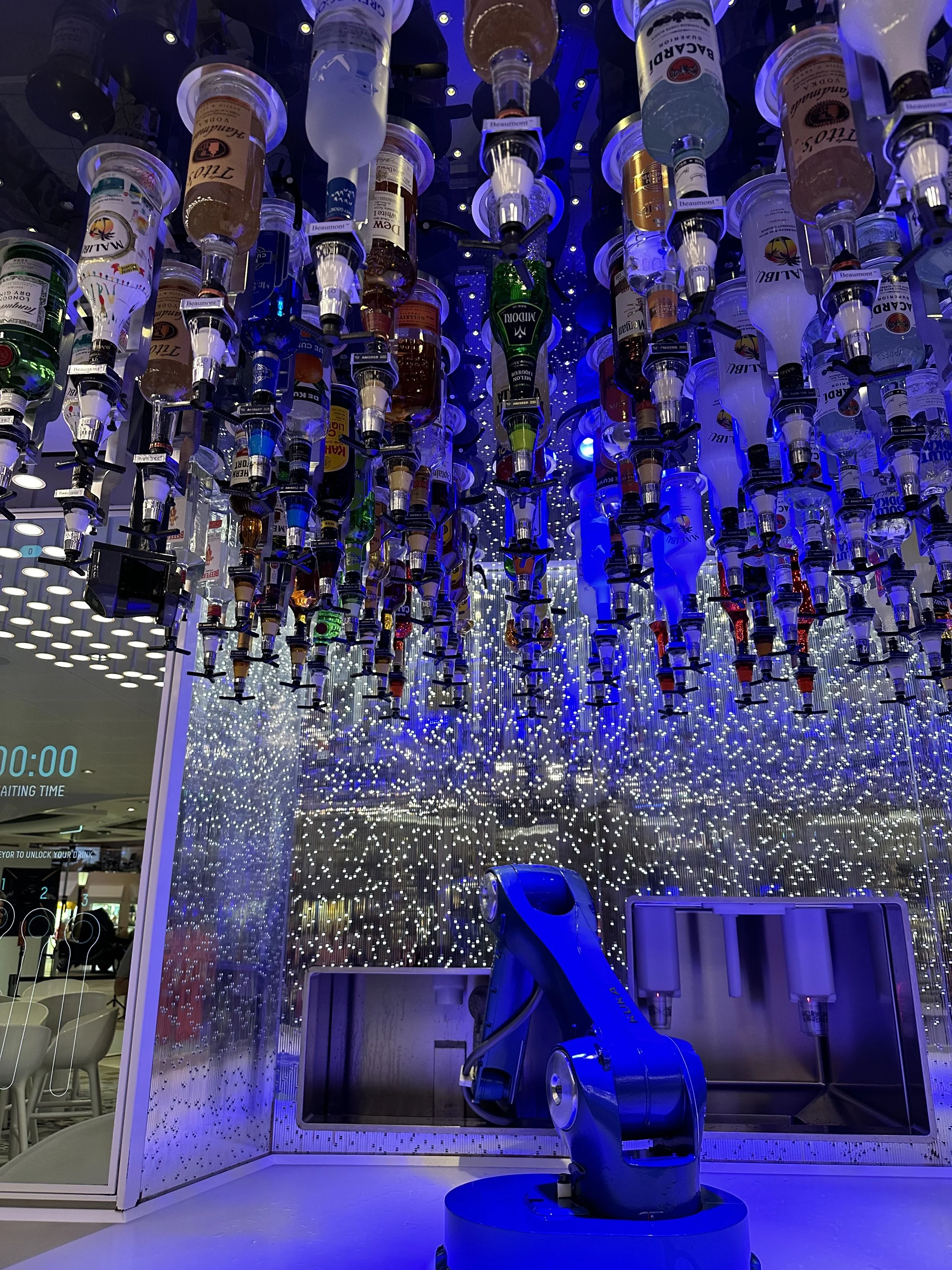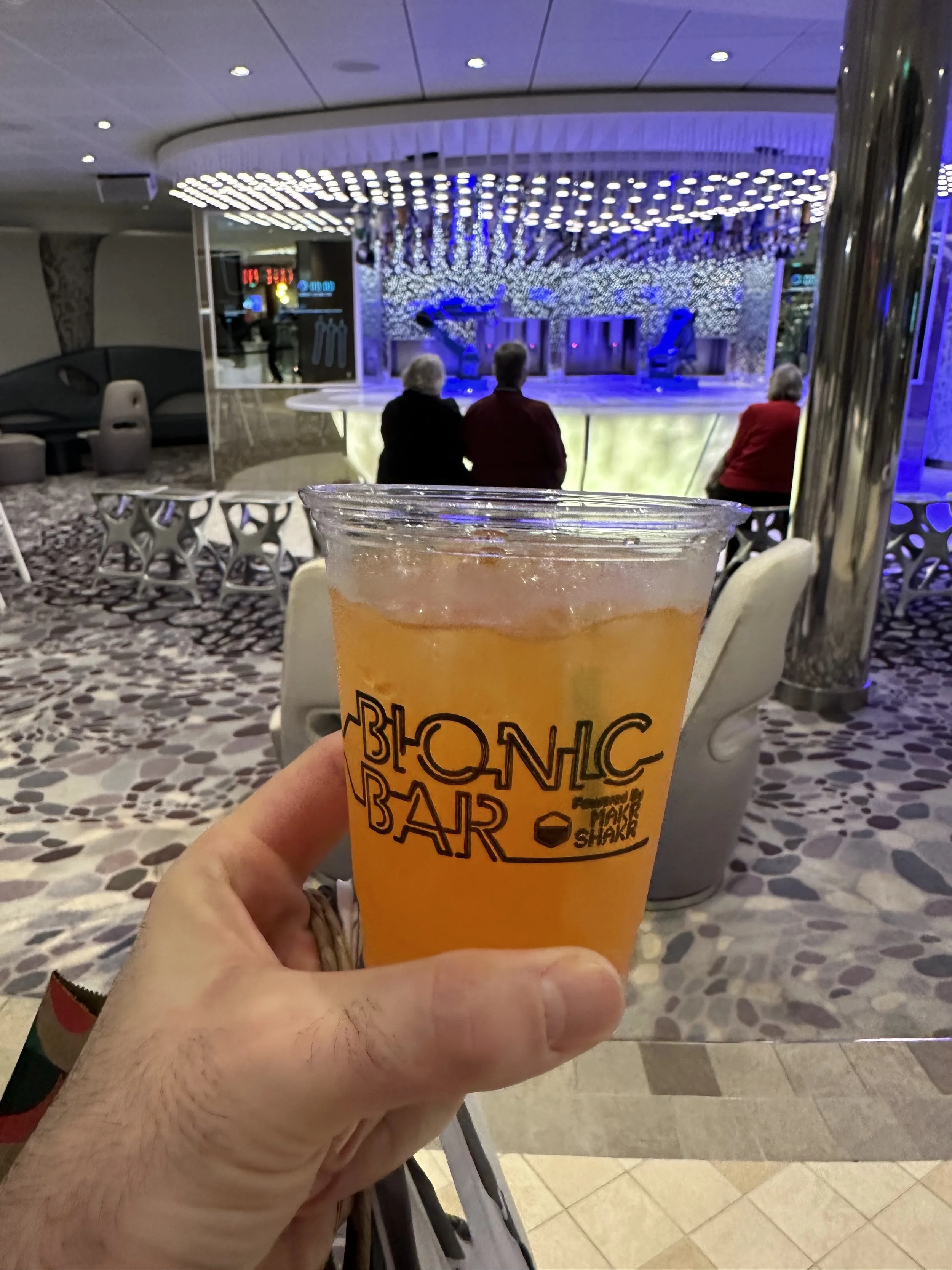 I met back up with the kids on the Boardwalk and we got milkshakes, this time strawberry and a vanilla malt. Before heading back to the room we made a stop at the Bionic Bar. It’s basically this robotic bar where you use a table to order what you want (you can choose from premade drinks or make your own recipes) and then the robots mix everything. Tzvi made up a drink that I did not like but he said was okay.