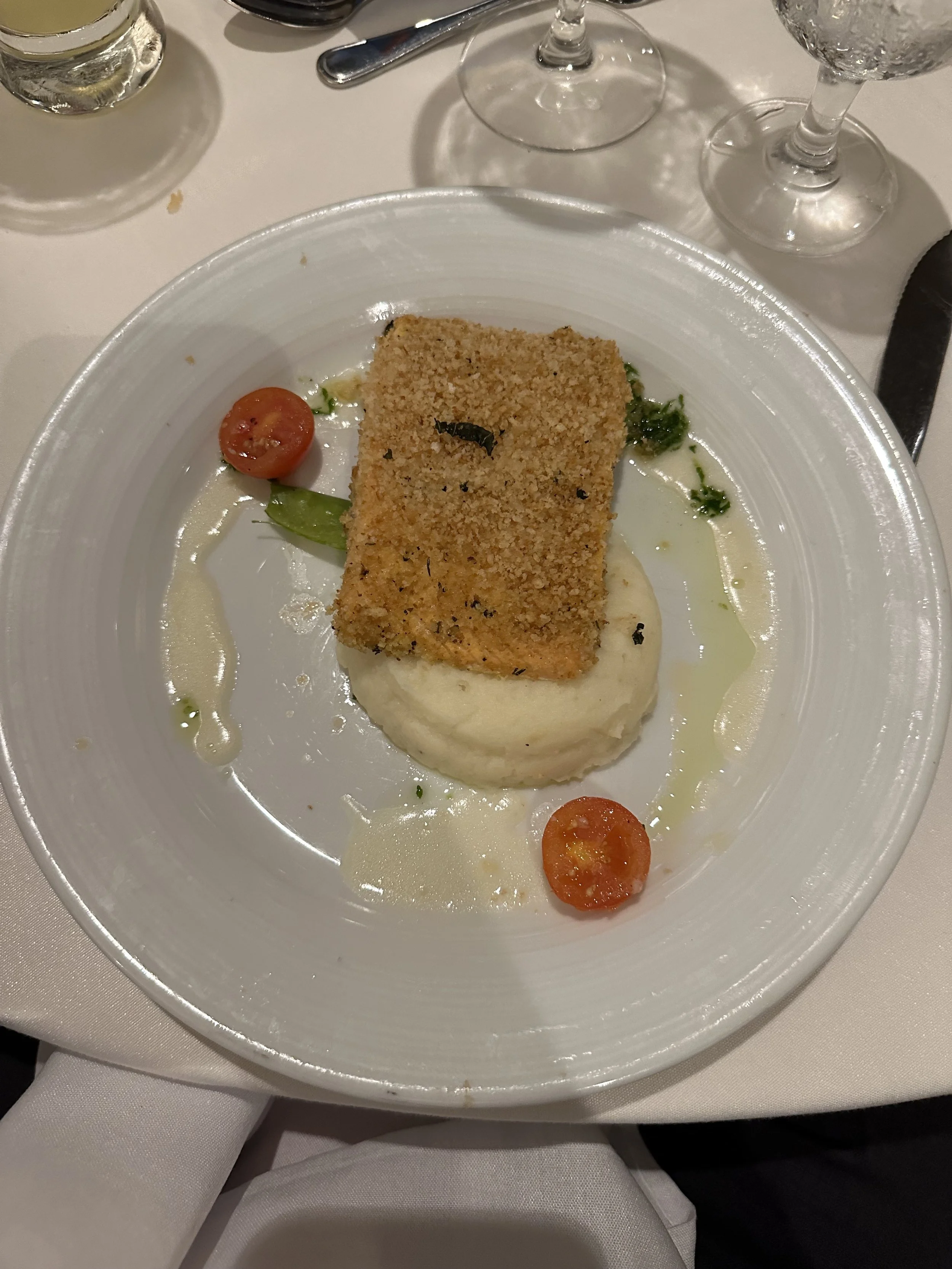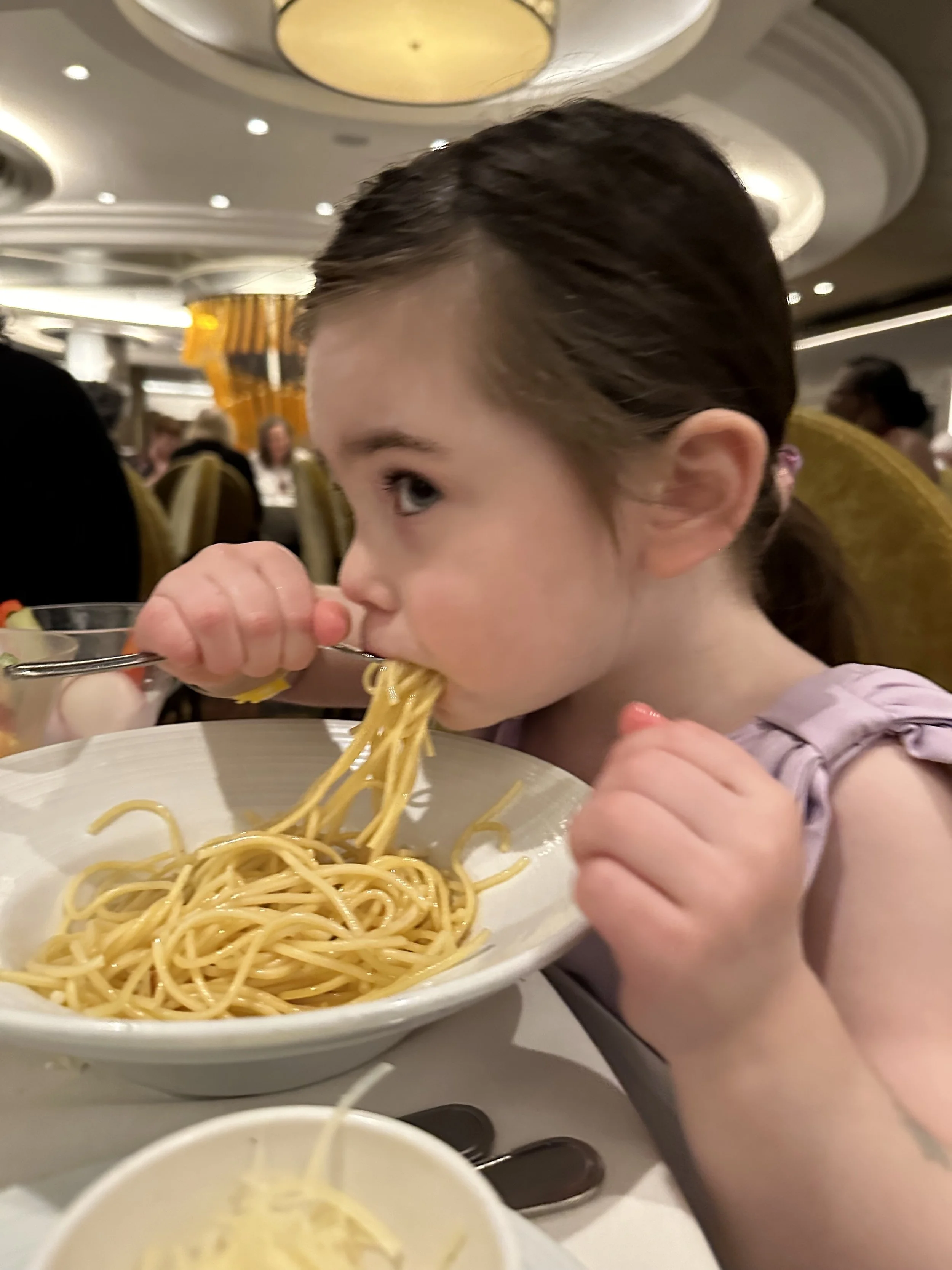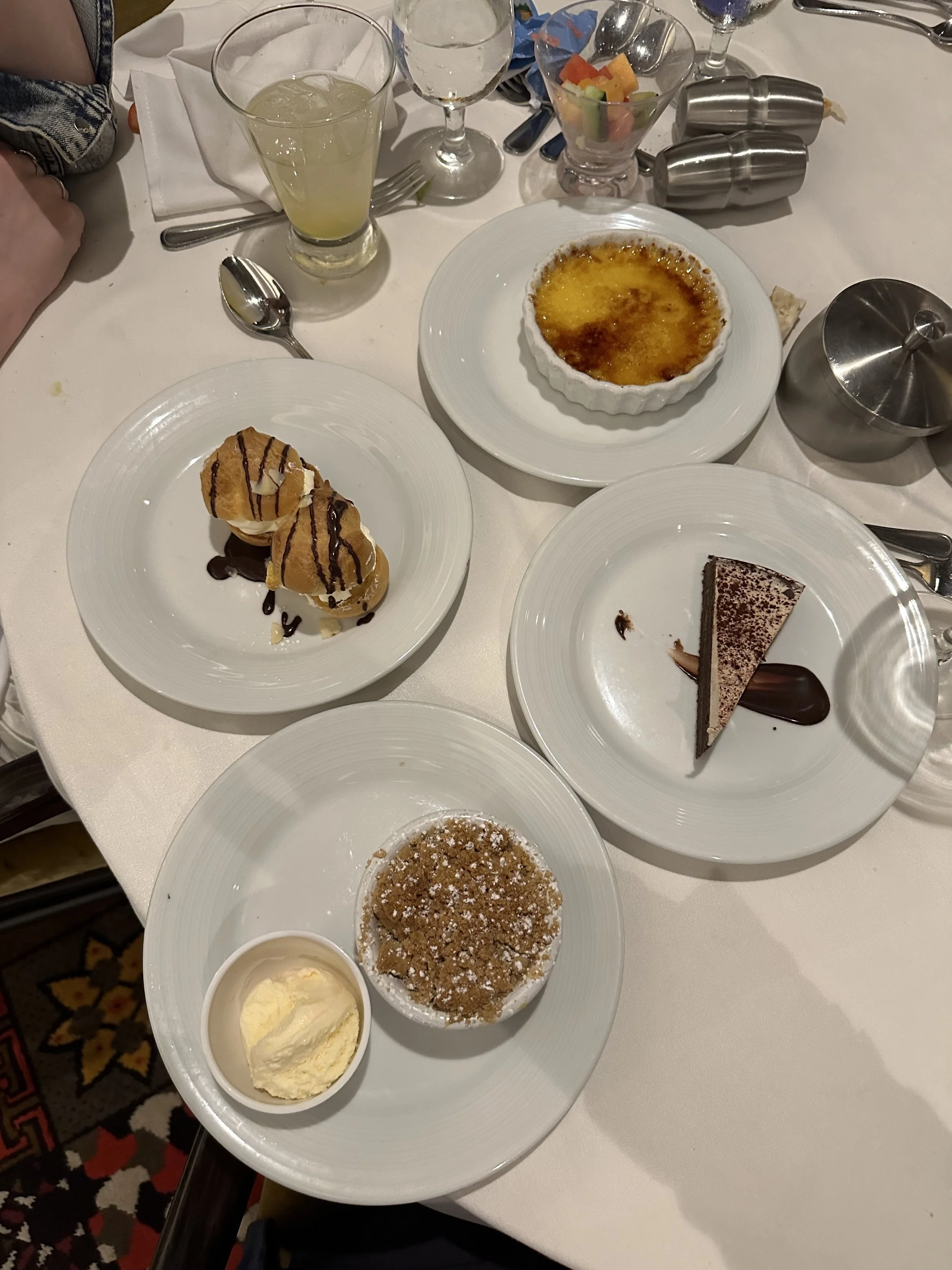 Then it was time to get ready for dinner! Early bird special once again. Tonight was formal night, which is always fun. Dinner was actually delicious. I had butternut sqaush soup and salmon. We also shared a vegan risotto and tried all of the desserts, but the good one was the apple crumble. Again, Madeleine had all of the noodles.