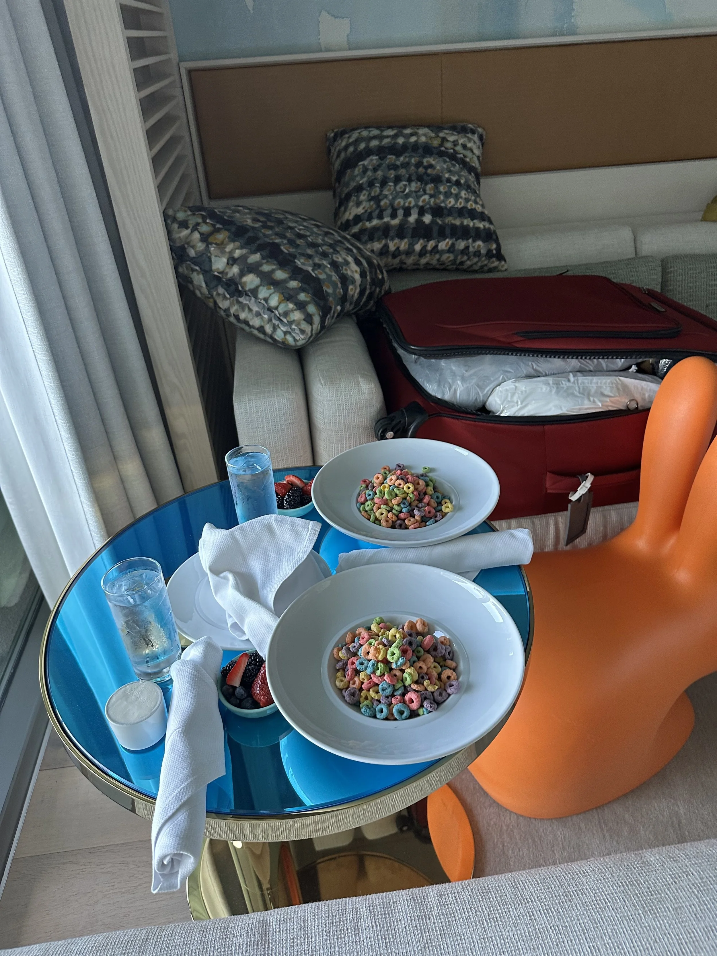 We made the hour-long drive and pulled up at The Conrad at the Evermore Resort. The Evermore is a new resort (only a year old). It’s not on Disney property but it’s right next door. The resort is huge and most of it is vacation homes or apartments. The Conrad is the one true hotel on the property (Conrad is Hilton’s highest-end brand). We booked three rooms (two connecting and one additional for my parents) with a combination of cash and Tzvi’s Hilton free night reward and points. Because Tzvi is a Hilton diamond member, he got an email a few days prior saying that one of his rooms had been upgraded. When he called, they said they were only able to upgrade the single room, but that they could probably upgrade the connecting rooms when we checked in.