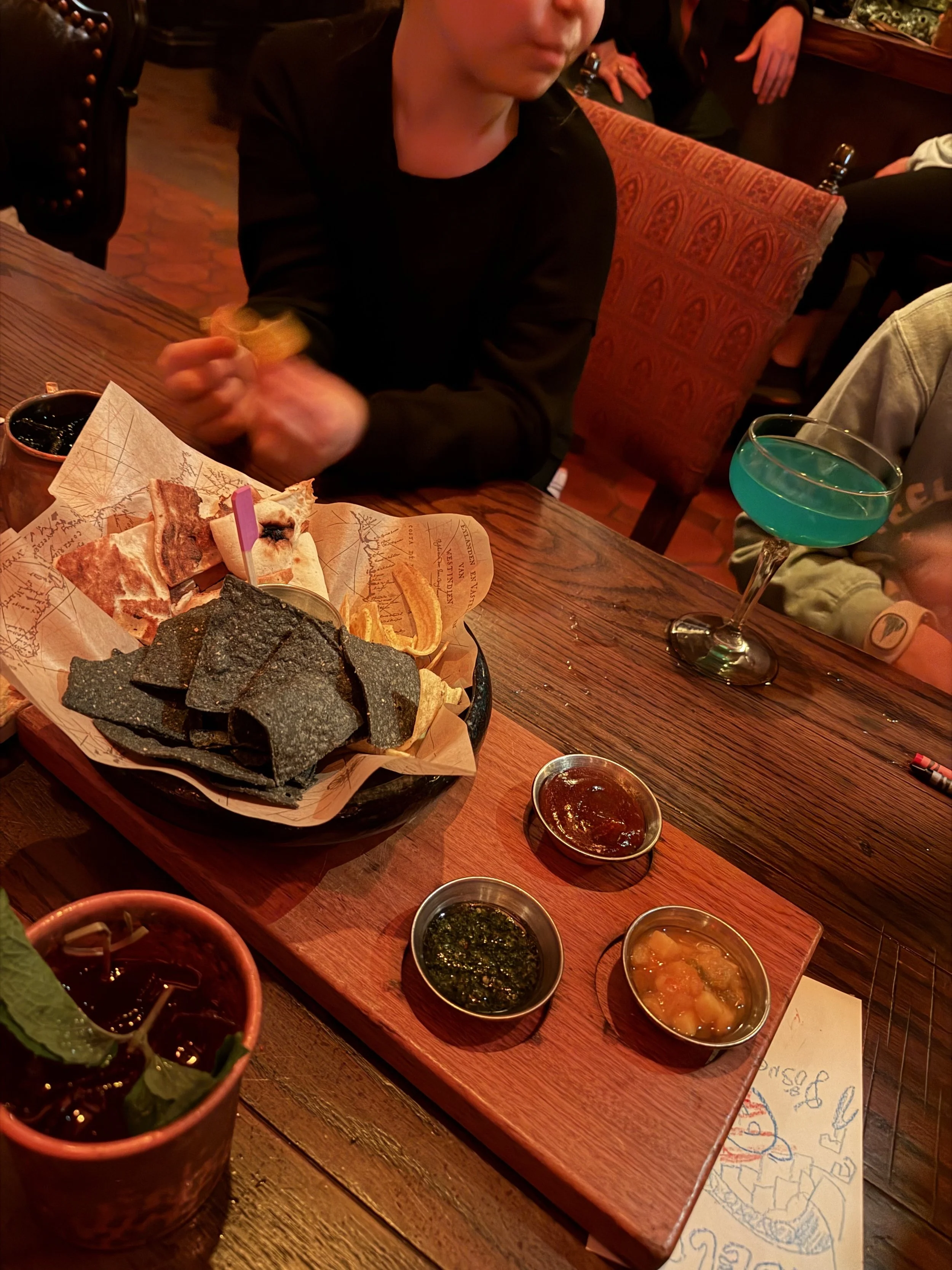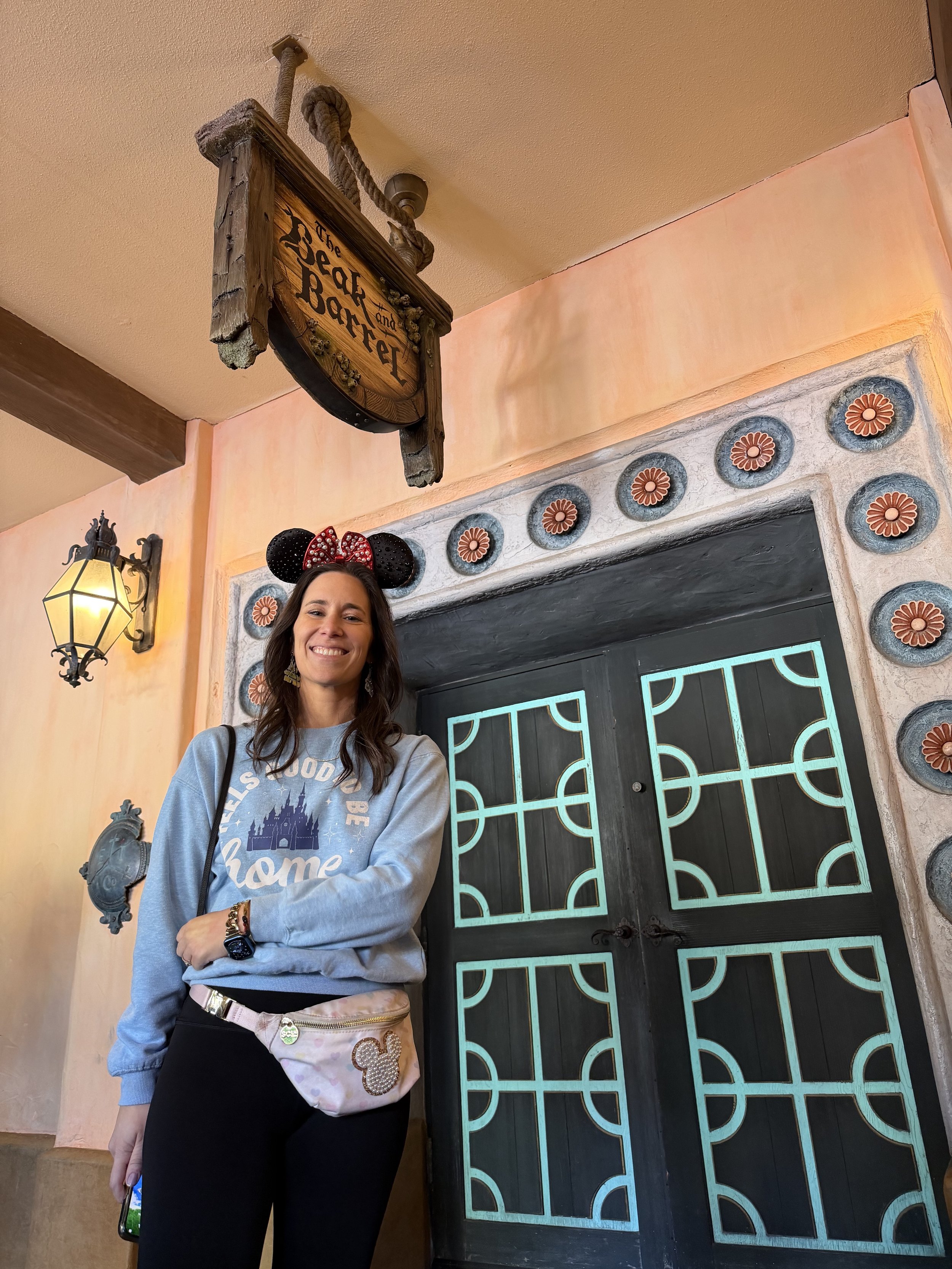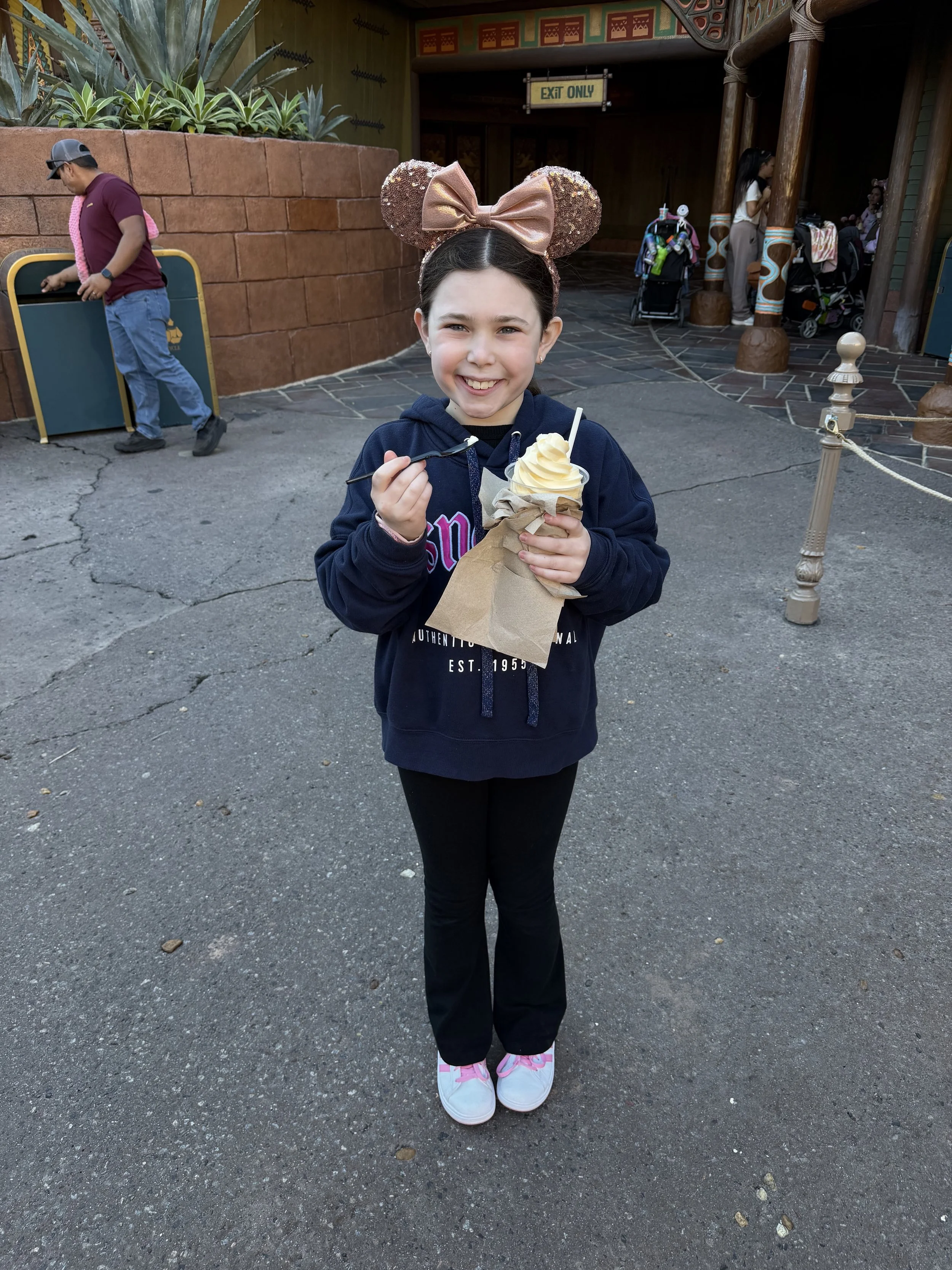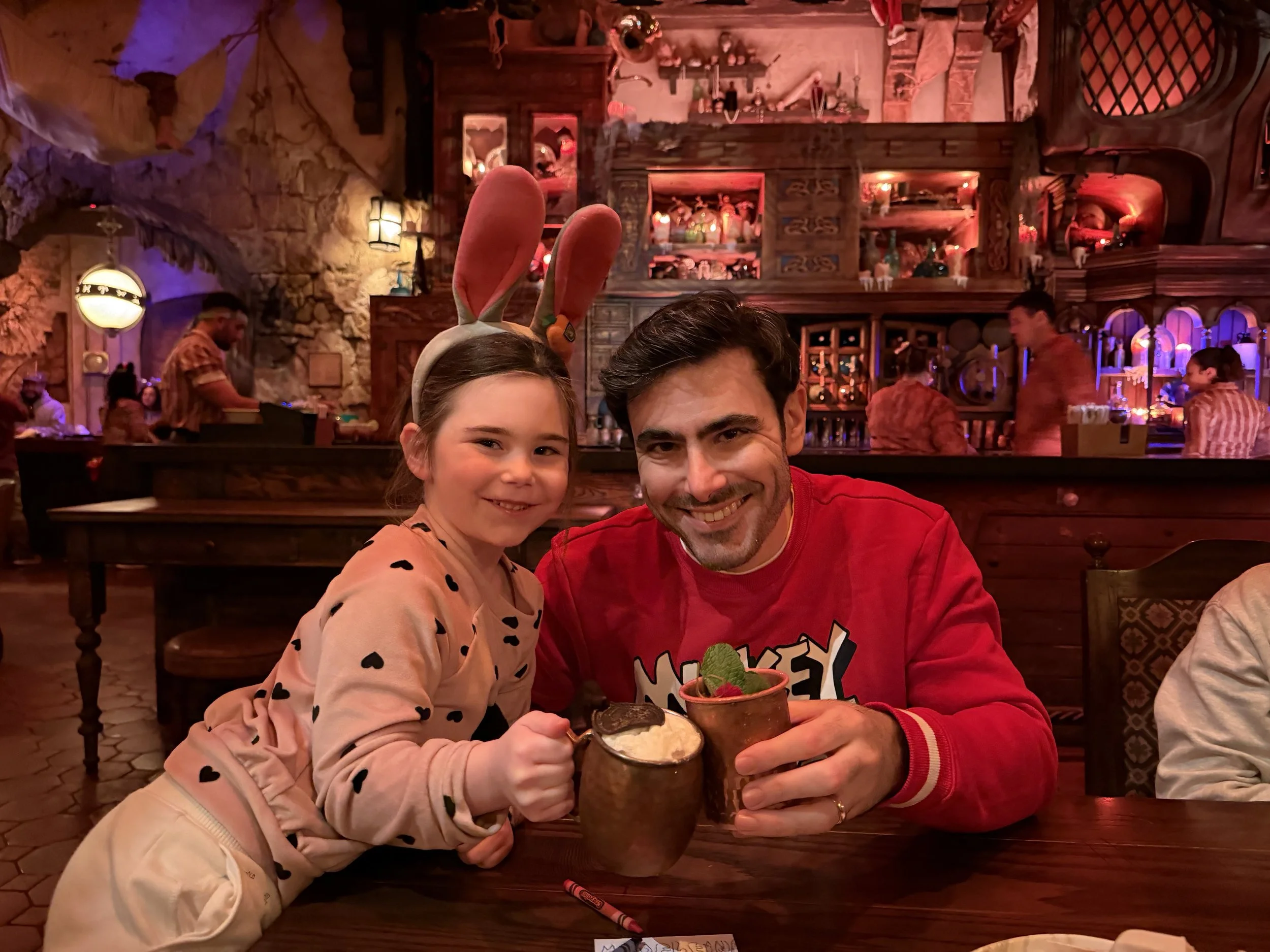 We all met up at Pirates where we tried the new Beak and Barrel (Pirates of the Caribbean-themed) bar. We got a bunch of alcoholic and non-alcoholic cocktails, and none of them were very good. We also had some chips and dip that were fine. The space is very cool and I could see it being a really nice pitstop on a hot day, but not somewhere I need to run back to. After the bar we rode Pirates. For years Madeleine has refused to go on the ride because she's too scared. So it was a big deal that she went on it today, and she was very proud of herself. We told her we would buy her a present for it, and she has been thinking long and hard about what she wants. She hasn’t stopped talking about what she’s going to use her present for.