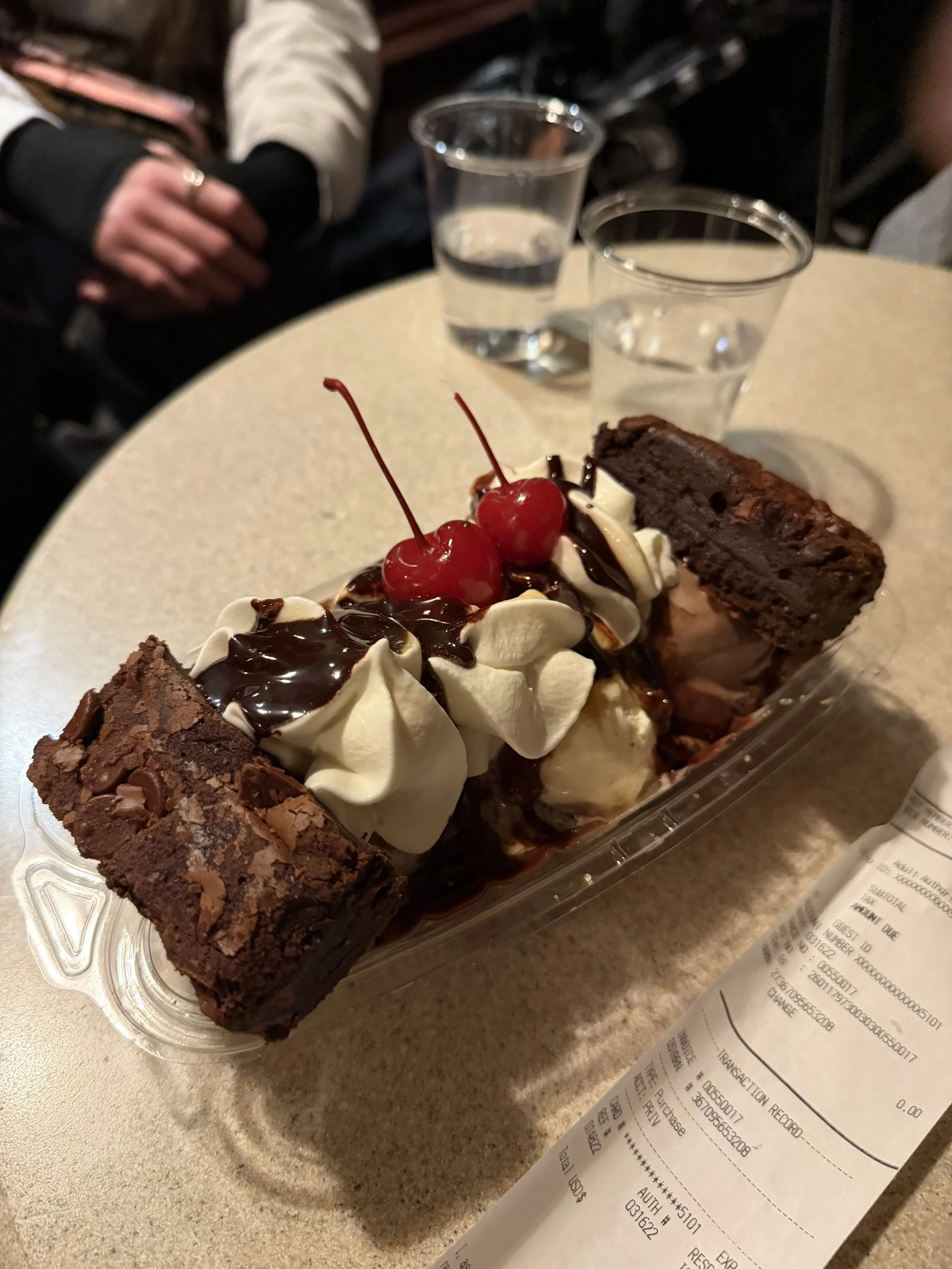 We ended the night at Ghirardelli with a chocolate brownie sundae, which we had been waiting forever for because our buzzer never buzzed. When we finally checked, it turned out they never actually attached the buzzer to our order, so it had just been sitting there for a while. Why does this keep happening to us?