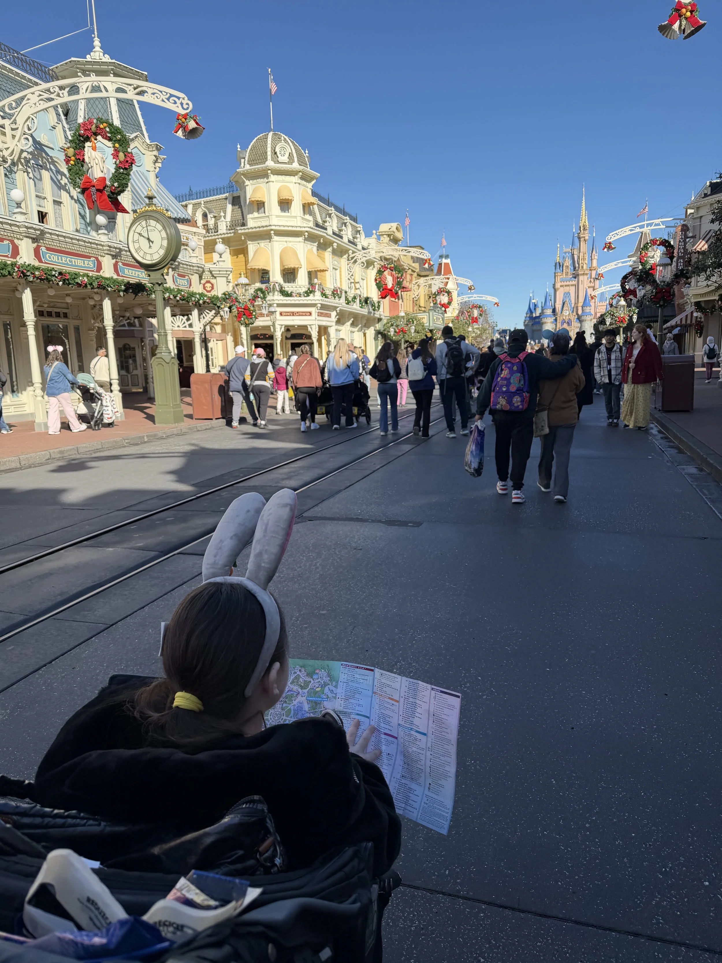 As soon as we got into the park, we immediately noticed that all the Christmas decorations were still up. I’d noticed it the day before too, but it was much more glaring here. There’s a huge Christmas tree right as you enter Magic Kingdom, and they’re still playing Christmas music. I find this absolutely ridiculous. It’s mid-January. It’s time to let it go. It doesn’t always have to be a holiday celebration. (I later found out through Instagram that the decorations were still up because they were filming a Hallmark movie for next Christmas.)