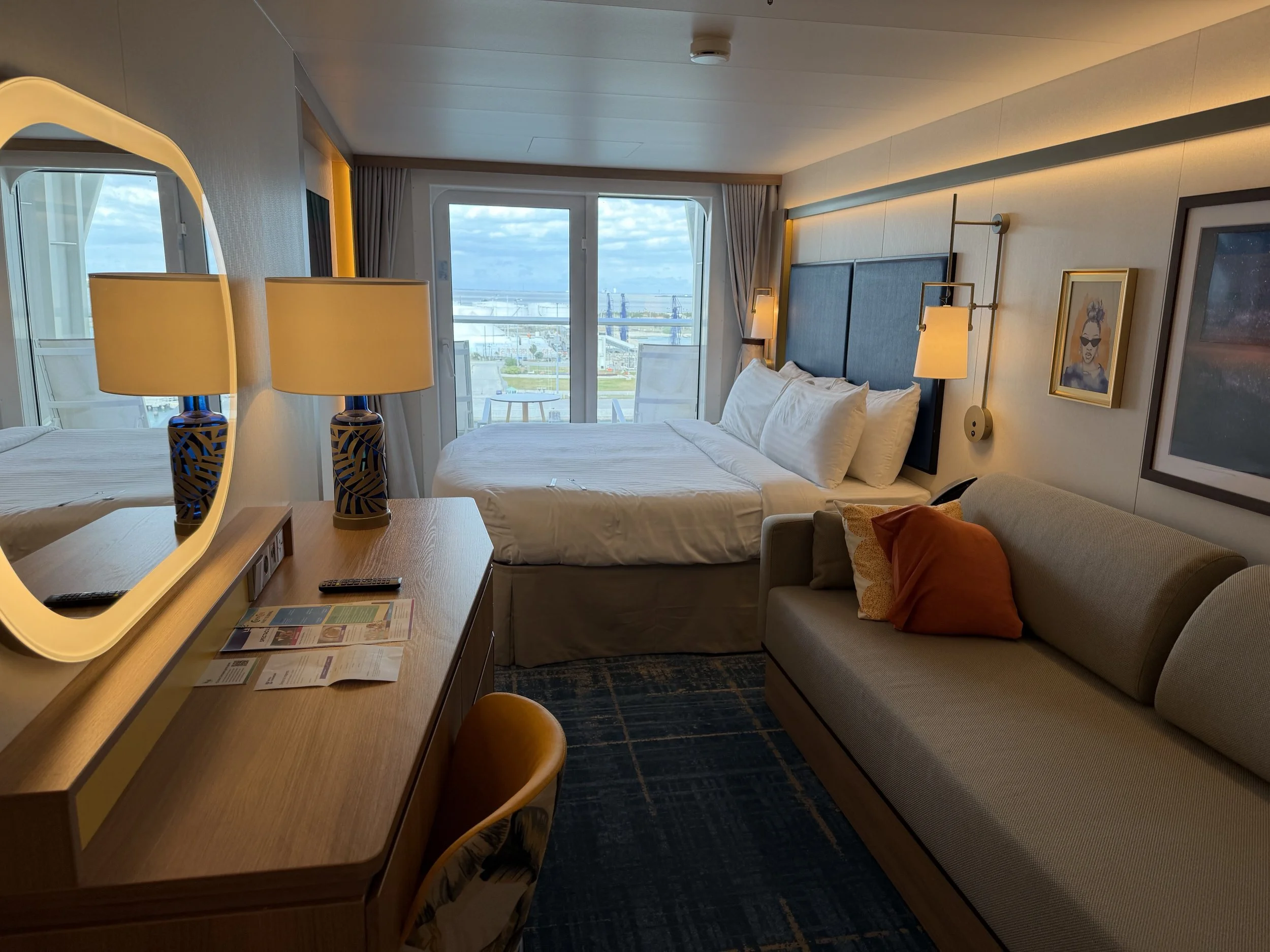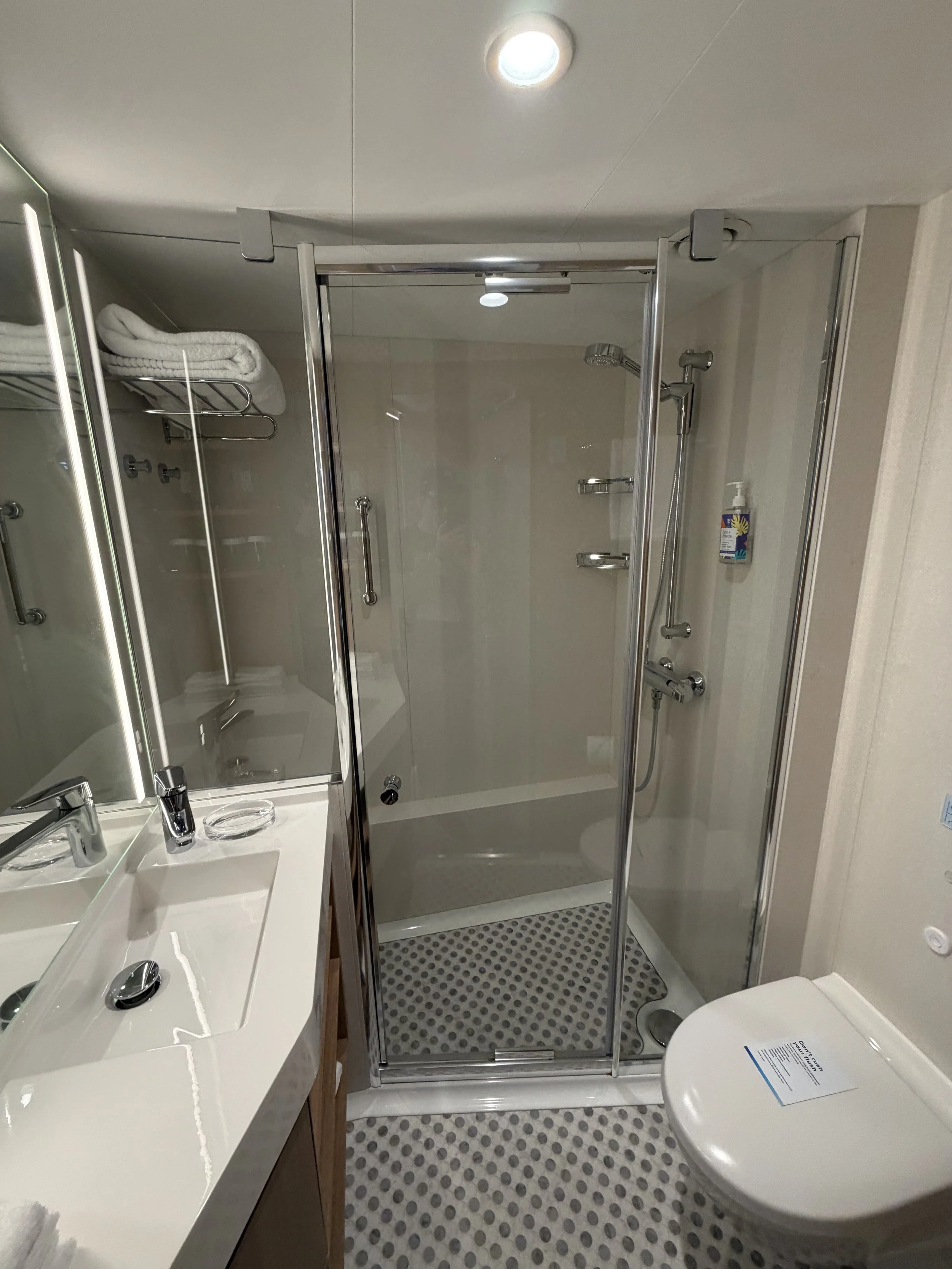 We did our muster station drill, checked in with our assigned person, and then went to our room. We only had to wait about four minutes for it to be ready, and then our luggage showed up shortly after. Again, super impressed with how fast everything happened. The rooms are really nice, and the connecting setup is different than usual. Instead of just a door between the two rooms, there’s an outer door in the hallway, and both of our rooms open inside that space. So we can leave our individual room doors open and just keep the outer door closed, which is great. The rooms are nice and pretty spacious, especially the bathroom which has the biggest shower I’ve ever seen on a Royal Caribbean cruise ship and even has a seat.
