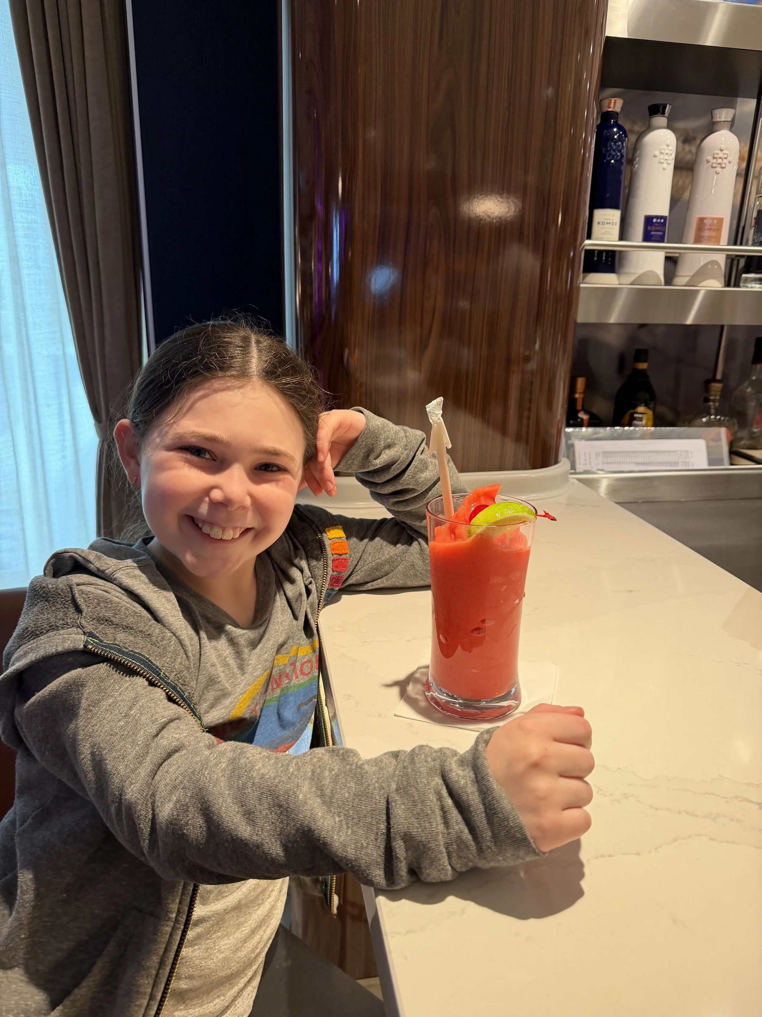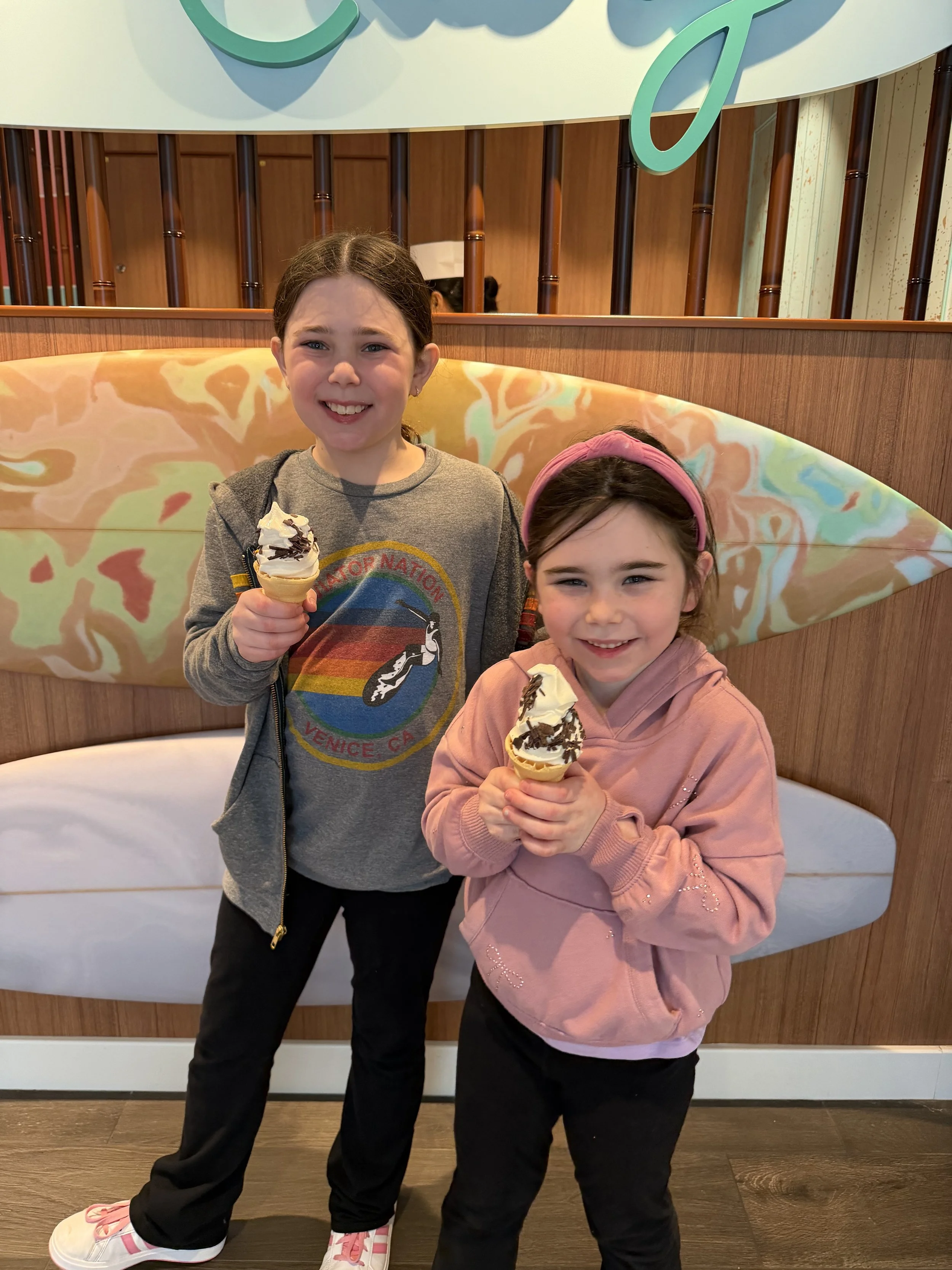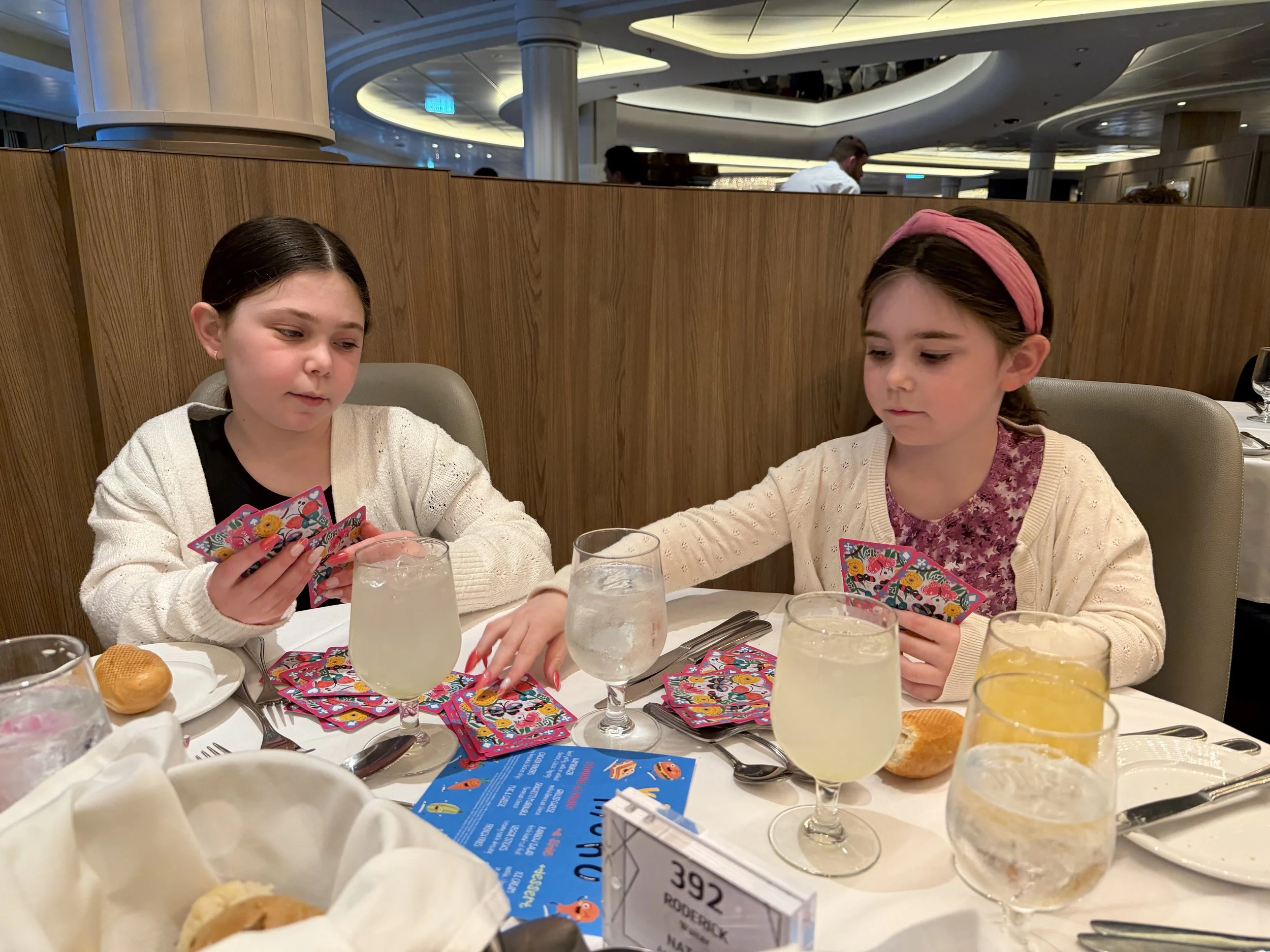 We went to the buffet for a quick lunch. It’s a huge buffet, but there was plenty of seating and nothing felt too crowded. After that, we checked in at the kids’ club—which the kids will probably never go to—and then walked around the ship a bit. We went back to the room, unpacked, and changed for dinner. We did some more exploring, but it was cold outside, so some of the outdoor areas were closed.