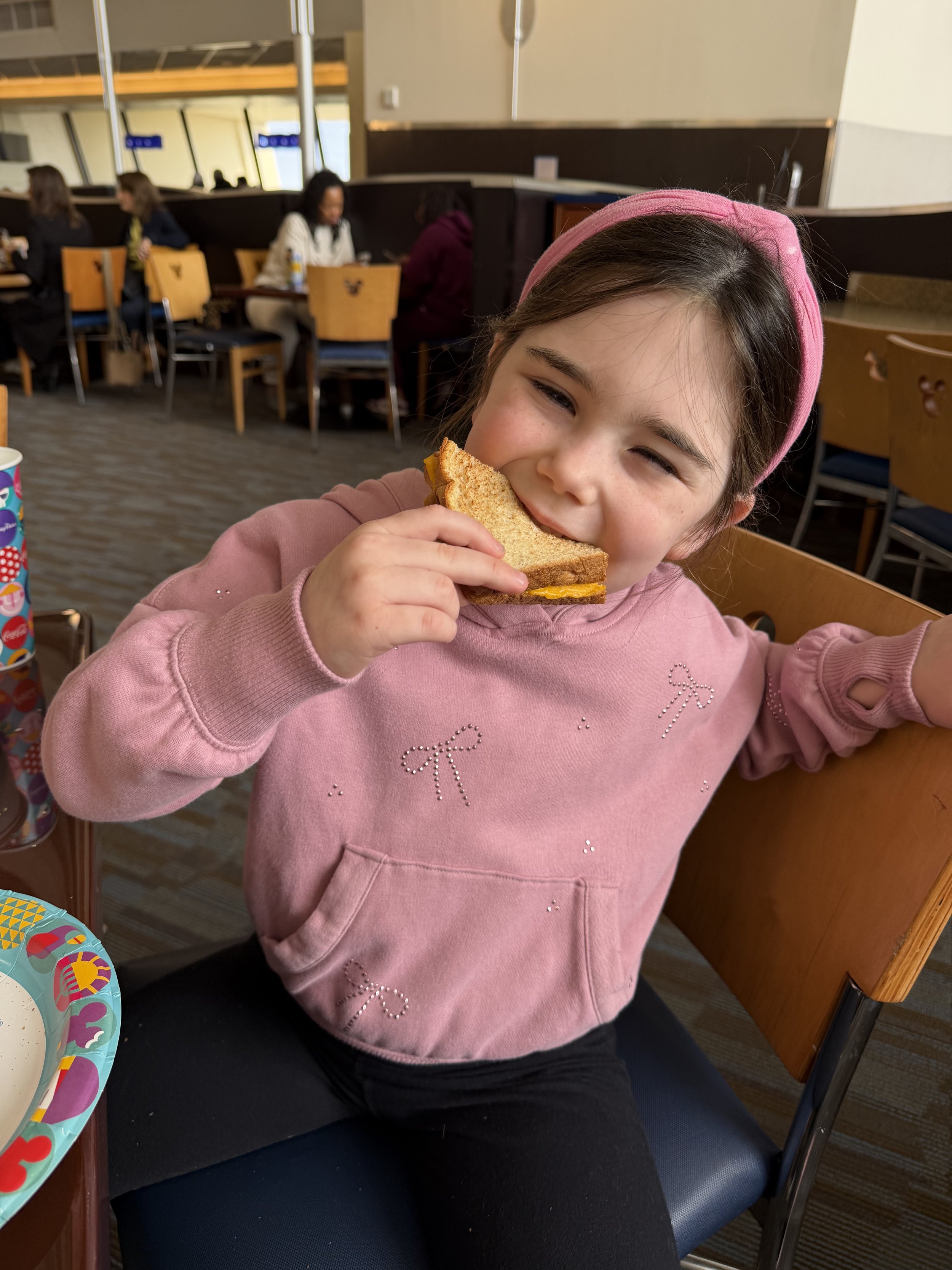 We had a 5:00 p.m. dinner time, and earlier I had told someone there was absolutely no way we were making it at five. I think we got there around 5:15ish. Our table is in a pretty decent spot. Our waiter, Roderick from the Philippines, mentioned that they had tried to seat everyone who requested kosher near each other, and we were very grateful to be on a different floor. Interestingly though we seem to have been put in an Asian section of the dining room. In our little corner there are six tables, and we are the only non-Asian family. Not sure what that’s about. Dinner was actually pretty good—well, good for dining room food, I’d say. I got the Indian vegetarian option. Tzvi and Hallie both got the halibut, although Hallie didn’t love it. Madeleine had grilled cheese and really enjoyed it. Dessert was some kind of cake that was just okay.