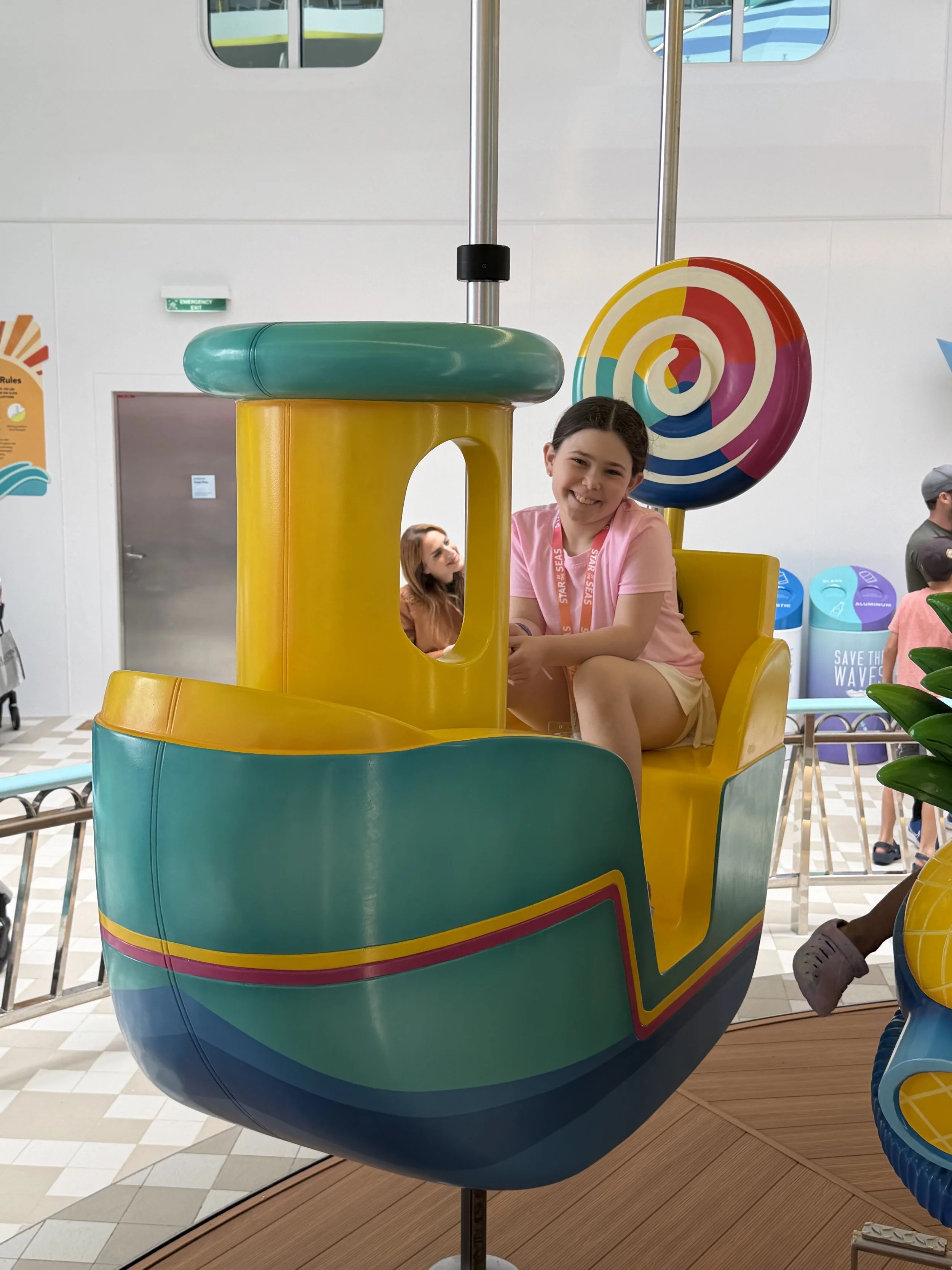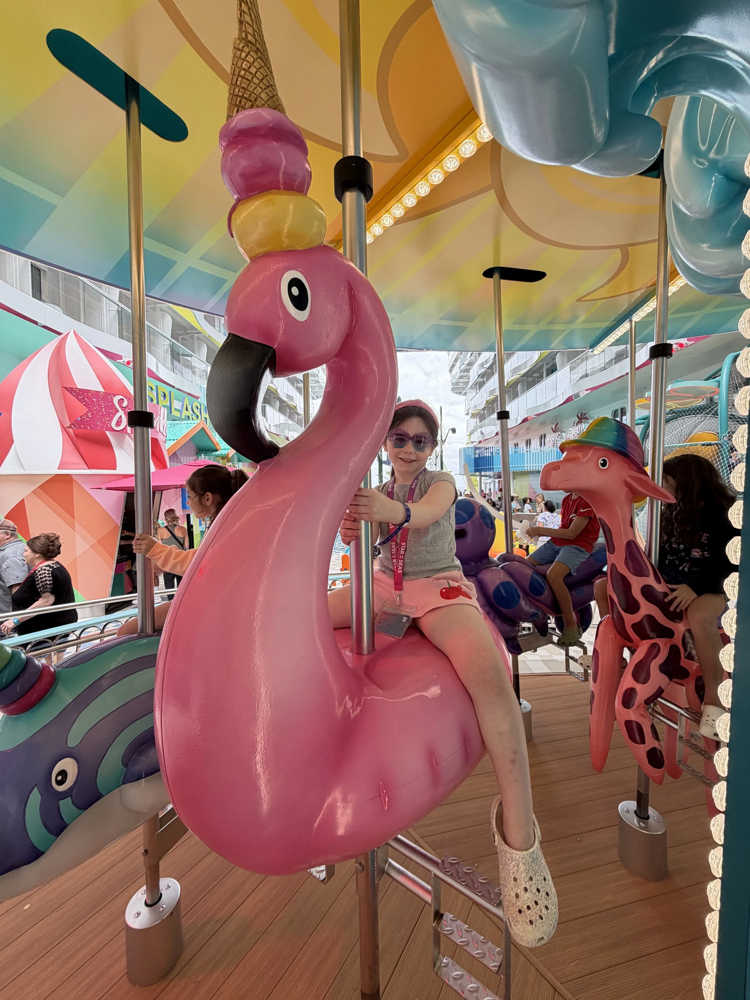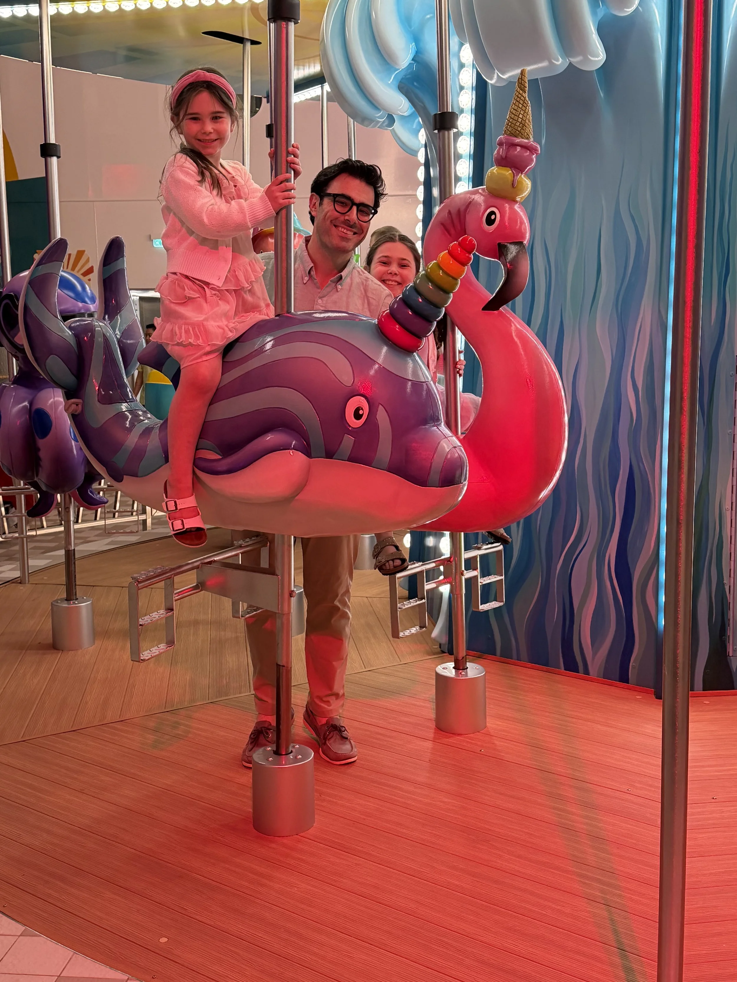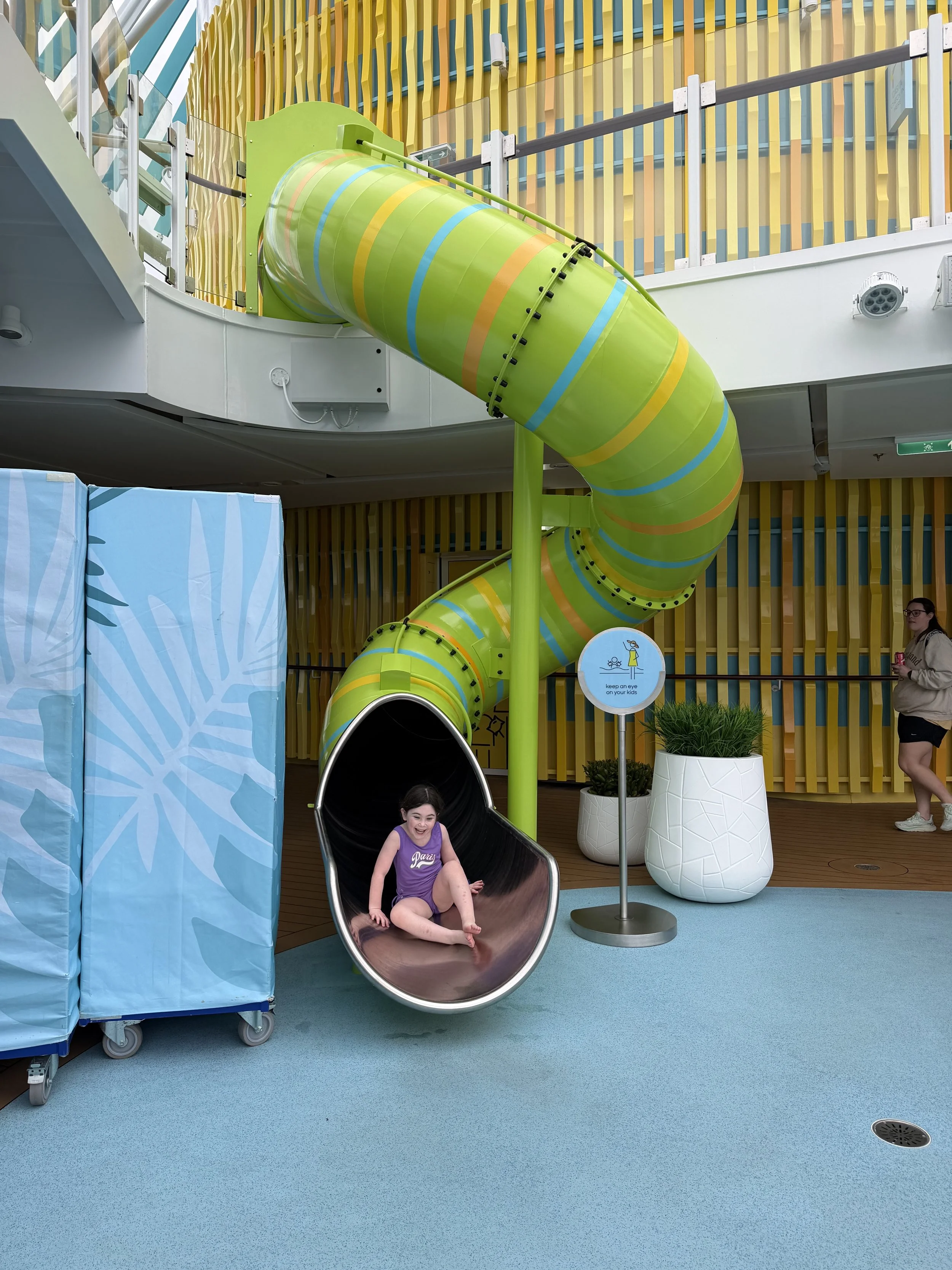 Tzvi took the girls to Surfside. They climbed on the wall, rode the carousel again and played air hockey in the arcade. Then we met back up and all hung out by the pool. There’s this green dry slide that takes you from Deck 16 to Deck 15, and Madeleine became completely obsessed with it. She had a really great time going on that over and over, like twenty times.