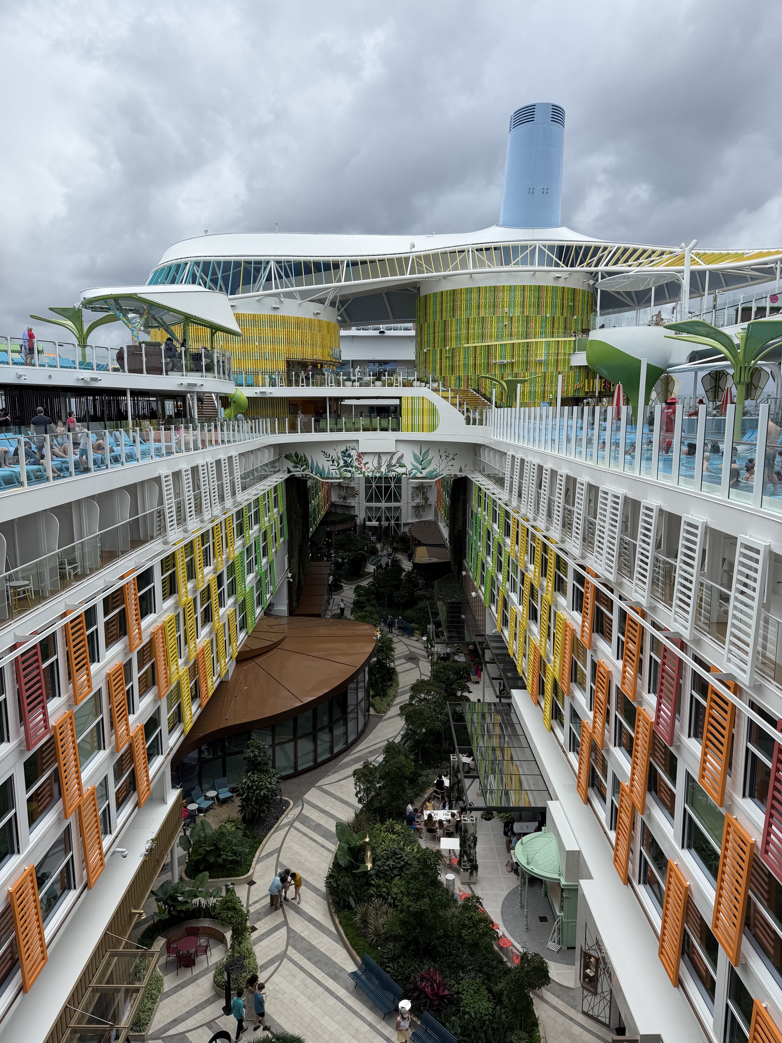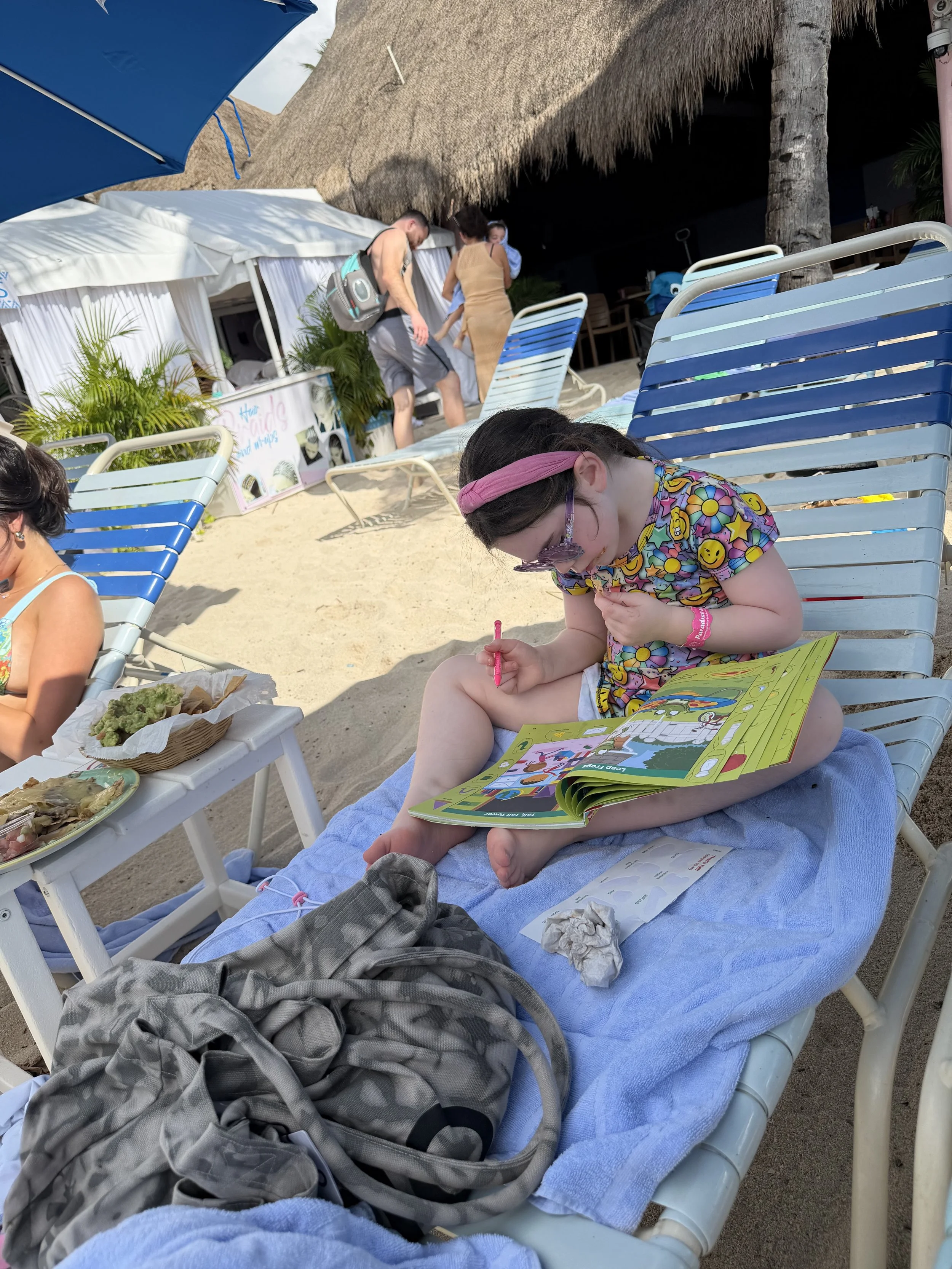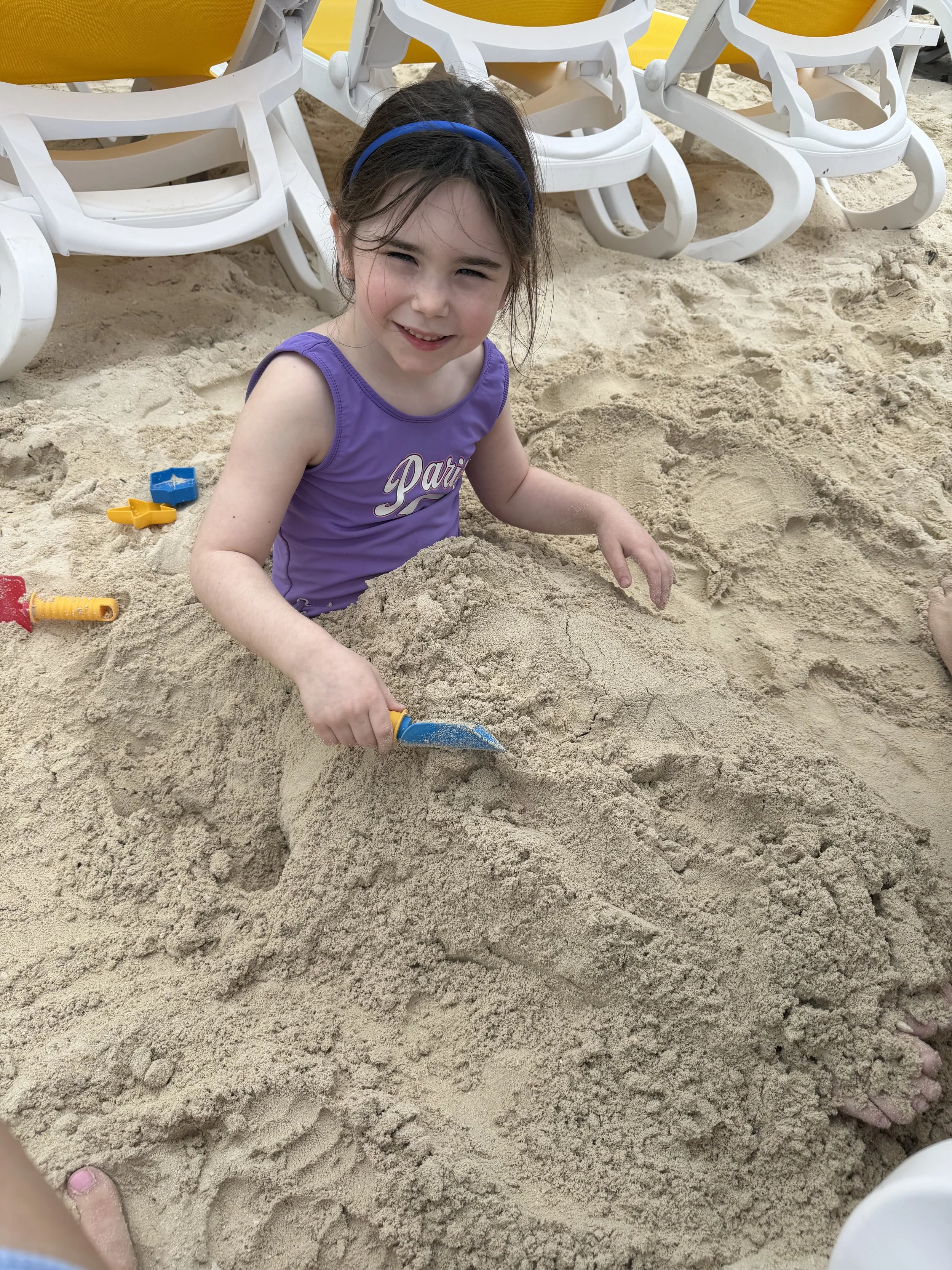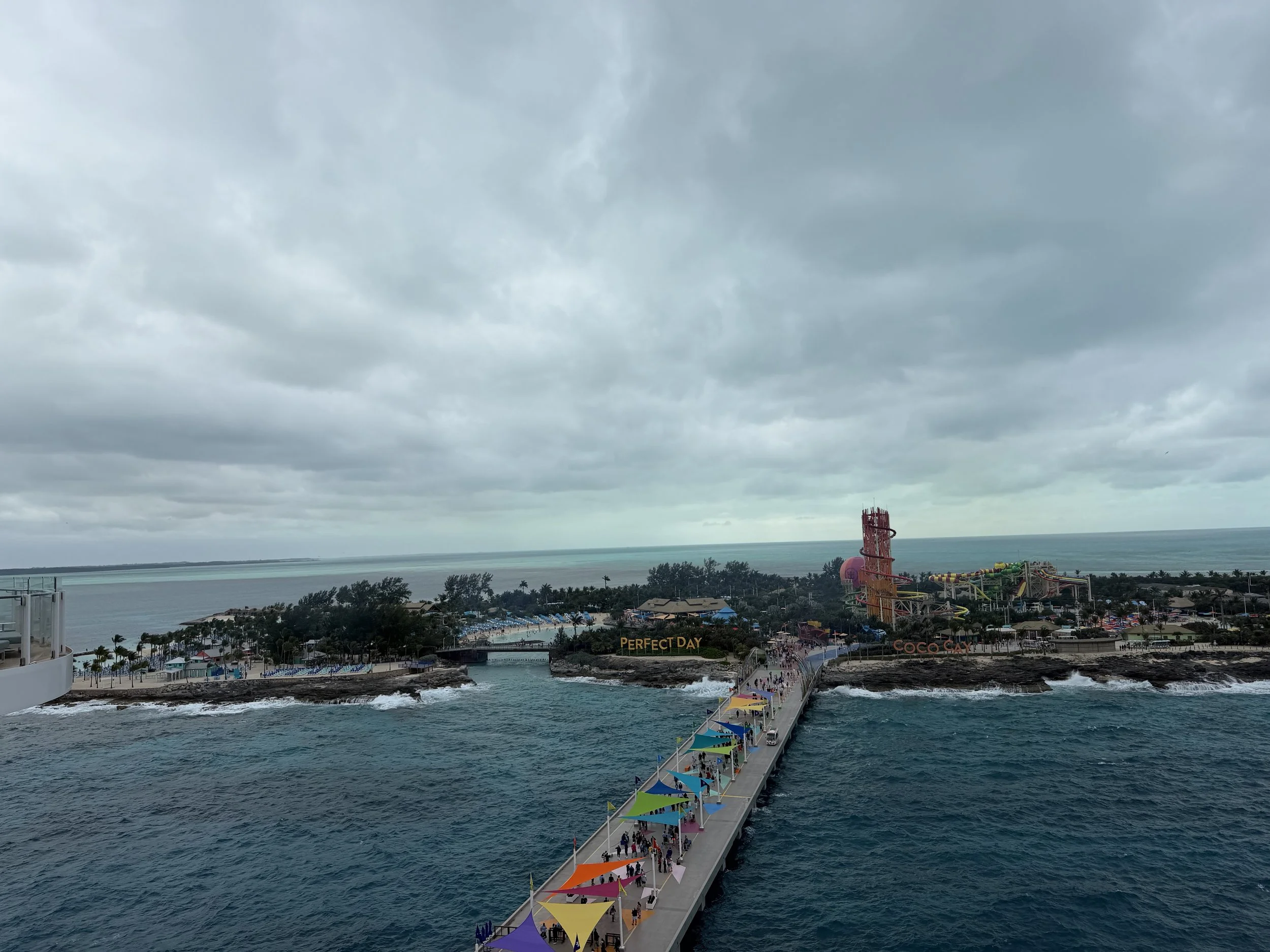Today was supposed to be our “Perfect Day at CocoCay,” Royal Caribbean’s private island. Except it was cloudy and about 65 degrees, which is… not exactly “perfect” beach weather. Still, we decided we had to get off the ship, so we packed up, got off, took a tram to the beach, and basically sat on a cloudy beach for a couple of hours. For lunch we got veggie burgers, which were actually not bad.
