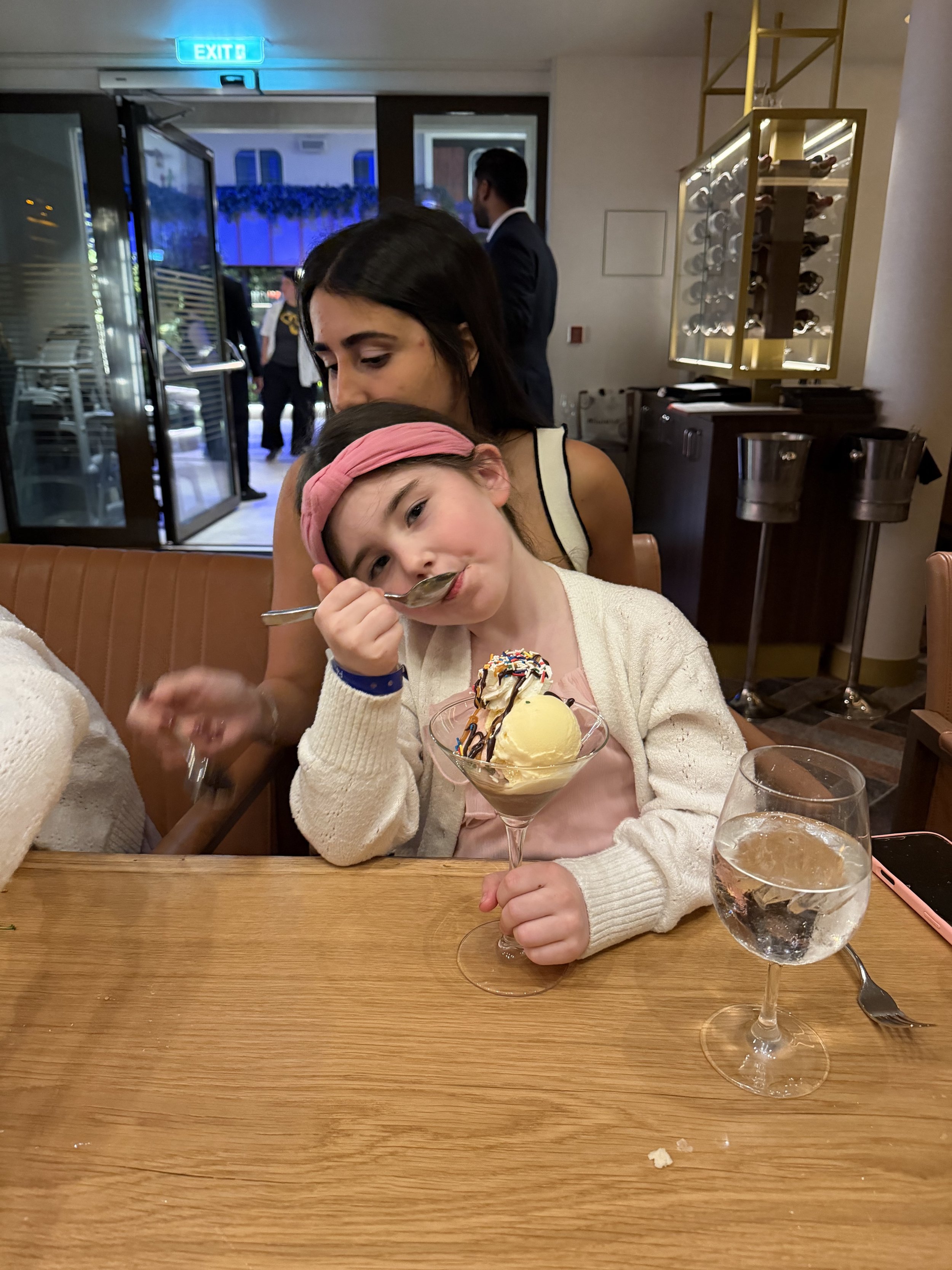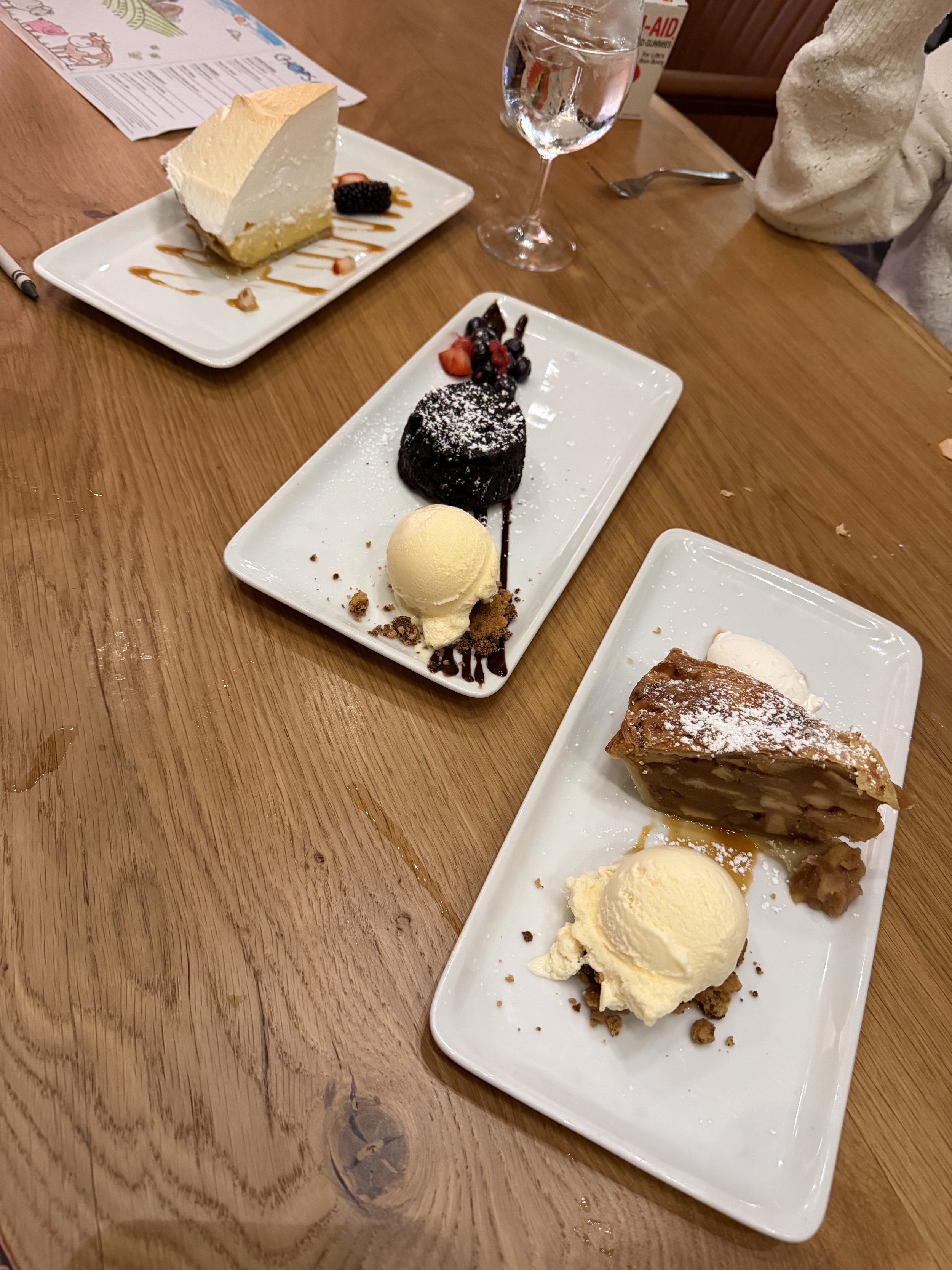 Dinner was excellent. We had salads, salmon and branzino, and everything was really delicious. For dessert, we had key lime pie and a warm chocolate cake. It was all very well done, and we had a really nice time there. Tzvi managed to eat what he wanted, which was a win.