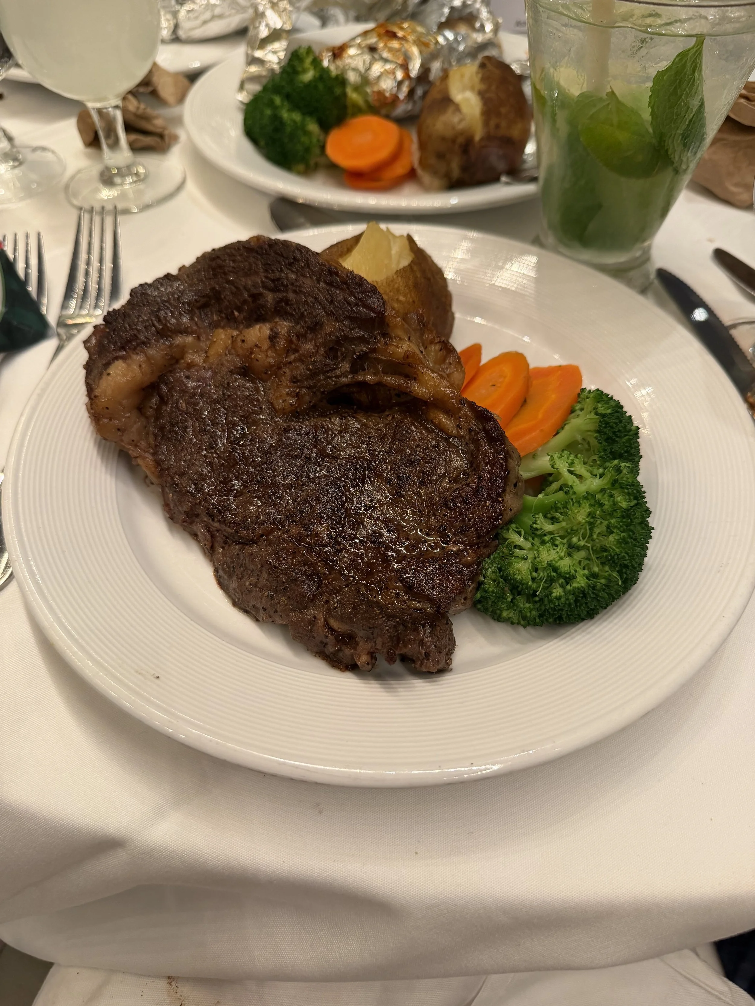 For dinner, we went to a specialty restaurant—Chops Grille, the steakhouse. We don’t usually go there because we always think, why bother? It’s expensive because you’re paying for steak, which we’re not getting. But we knew we couldn’t do too many meals in the dining room, so we decided to try it. When we walked in, they sat us at this massive table meant for about ten people, which felt very strange for just five of us. But honestly, it worked out great—we had tons of room and a lot of food.