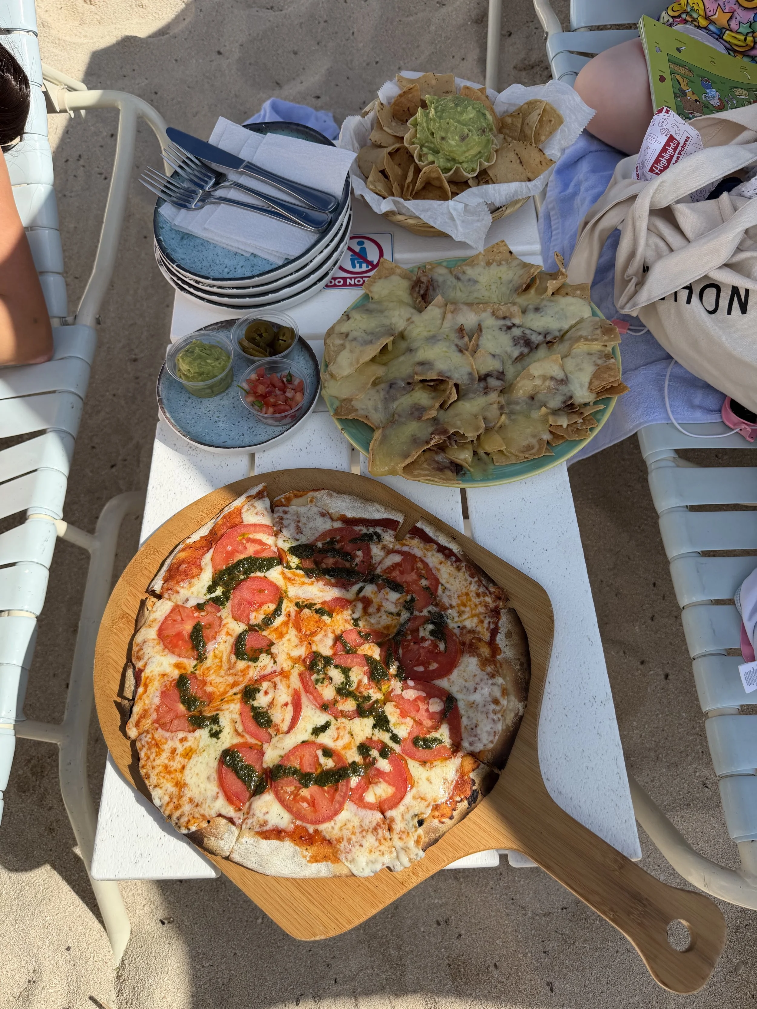This was actually the first time we’ve gone somewhere in a foreign port that wasn’t a ship-booked shore excursion. We just got on a taxi line and went. The ride was about 11 minutes, and we arrived at the beach club. It was actually pretty great – mostly clean, good service, not gross, and decent food. We were seated near Renee, and we had a really nice time. The beach club had a pool and a beach, and it was just a very pleasant way to spend the day. For lunch we ordered nachos (Tzvi was really testing that stomach, but he figured you’re not in Mexico every day). The kids had pizzas, because what else would they eat.