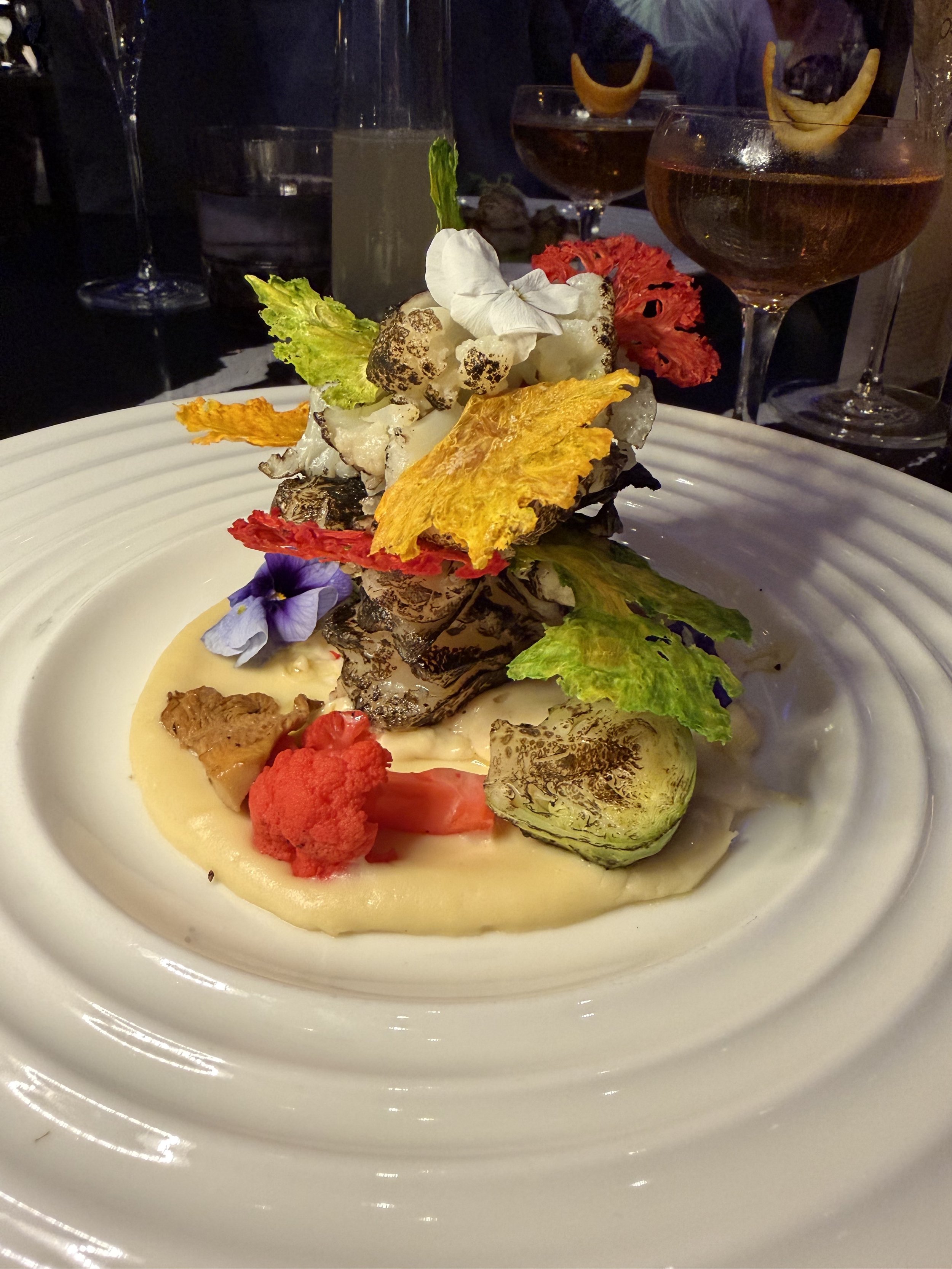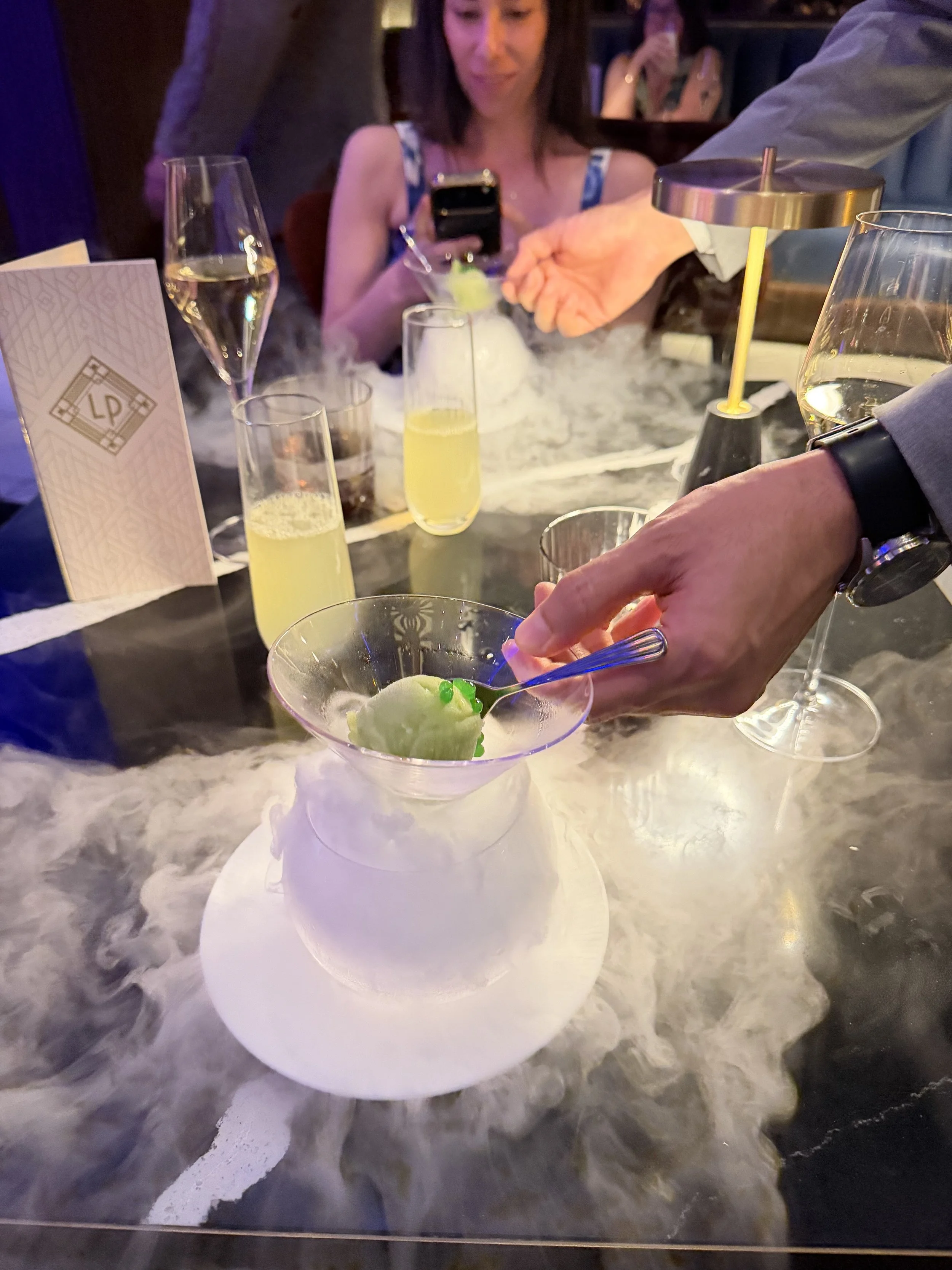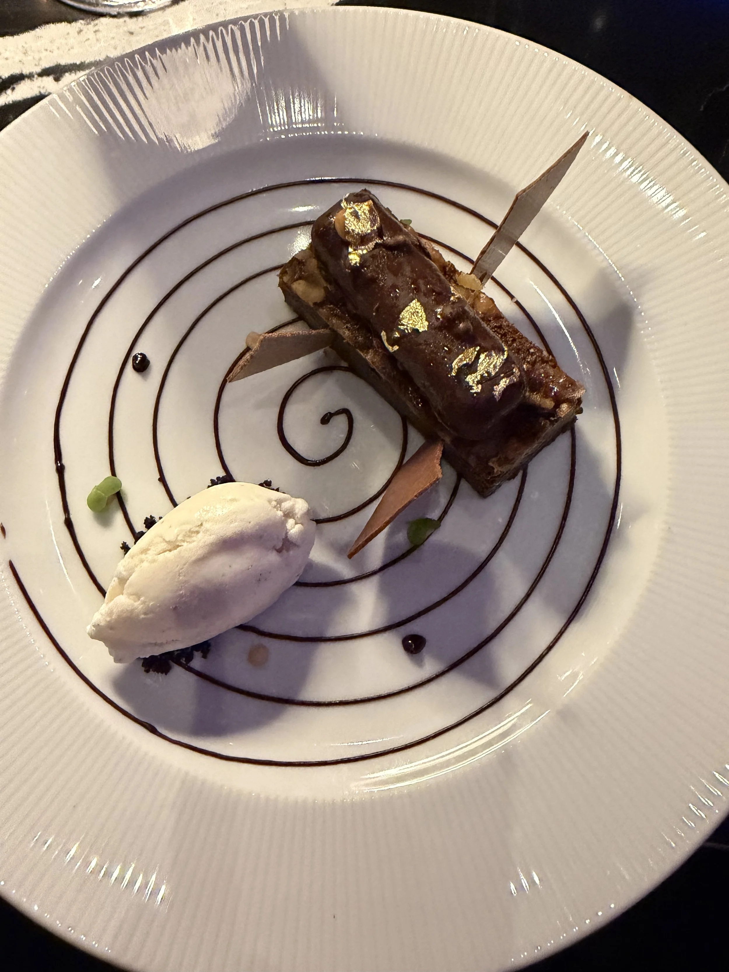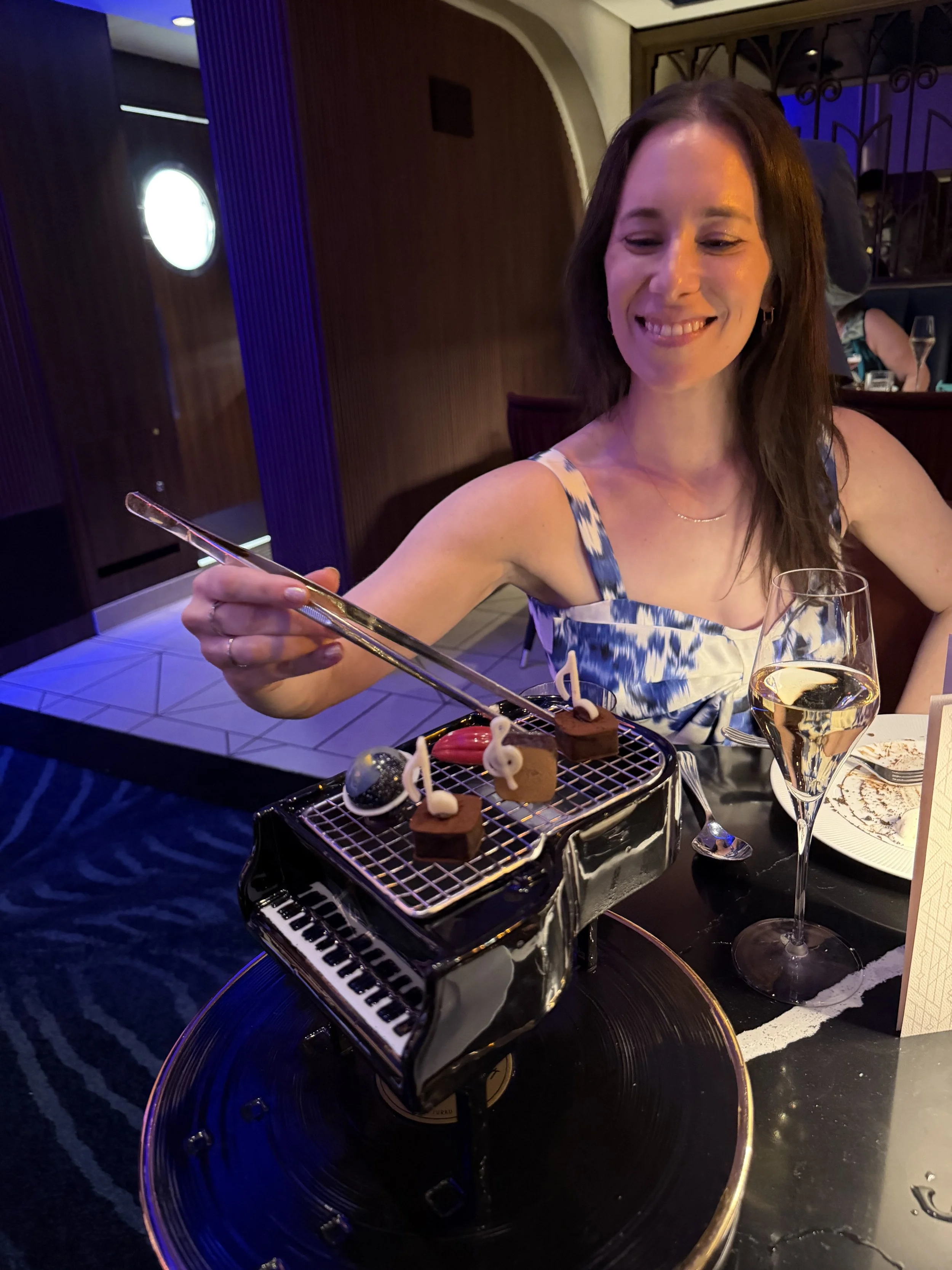 The food was delicious—fine dining, really well done. There was a lot of smoke produced from liquid nitrogen, which was cool. Also, it was a small space with a limited number of tables and they only do two seatings each night. The music was nice, though I could have done without it being loud the entire 2.5 hours. But that could also have been because our table was literally right next to the musicians. The space itself was very cool, the service was fantastic, and overall it was an excellent experience. The only issue was that mid way through the meal the boat started really rocking. After dinner Tzvi asked one of the musicians if it was hard to perform when the ship was rocking so much and he said “well this is the rockiest it’s been since I’ve come on board!”. Lucky us.