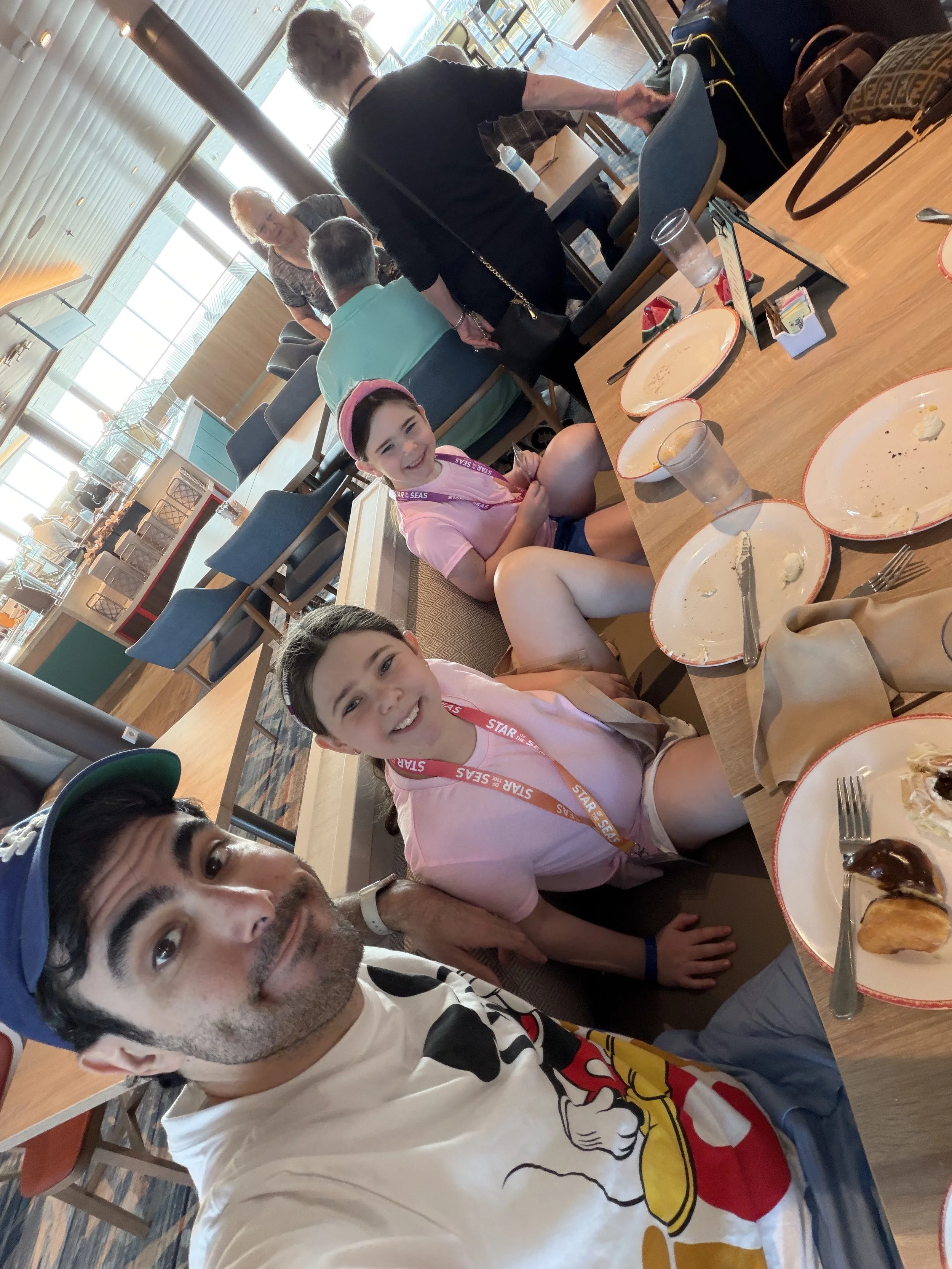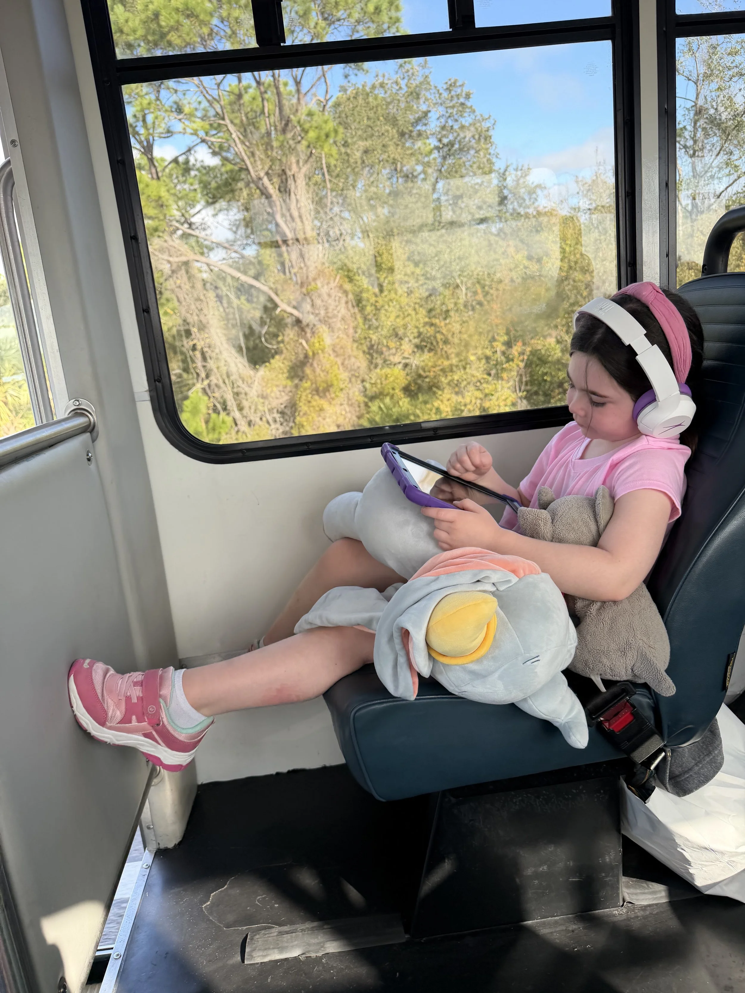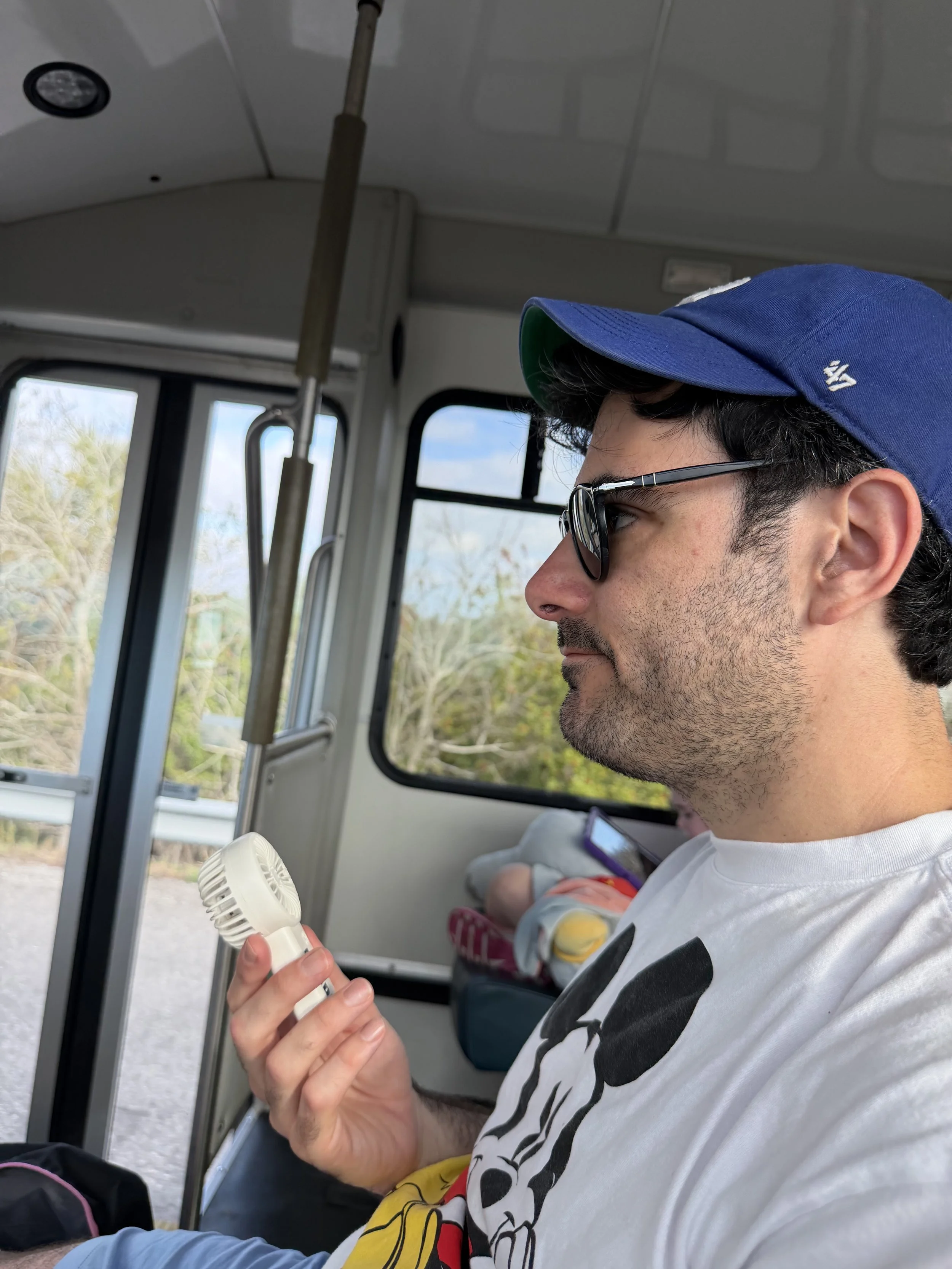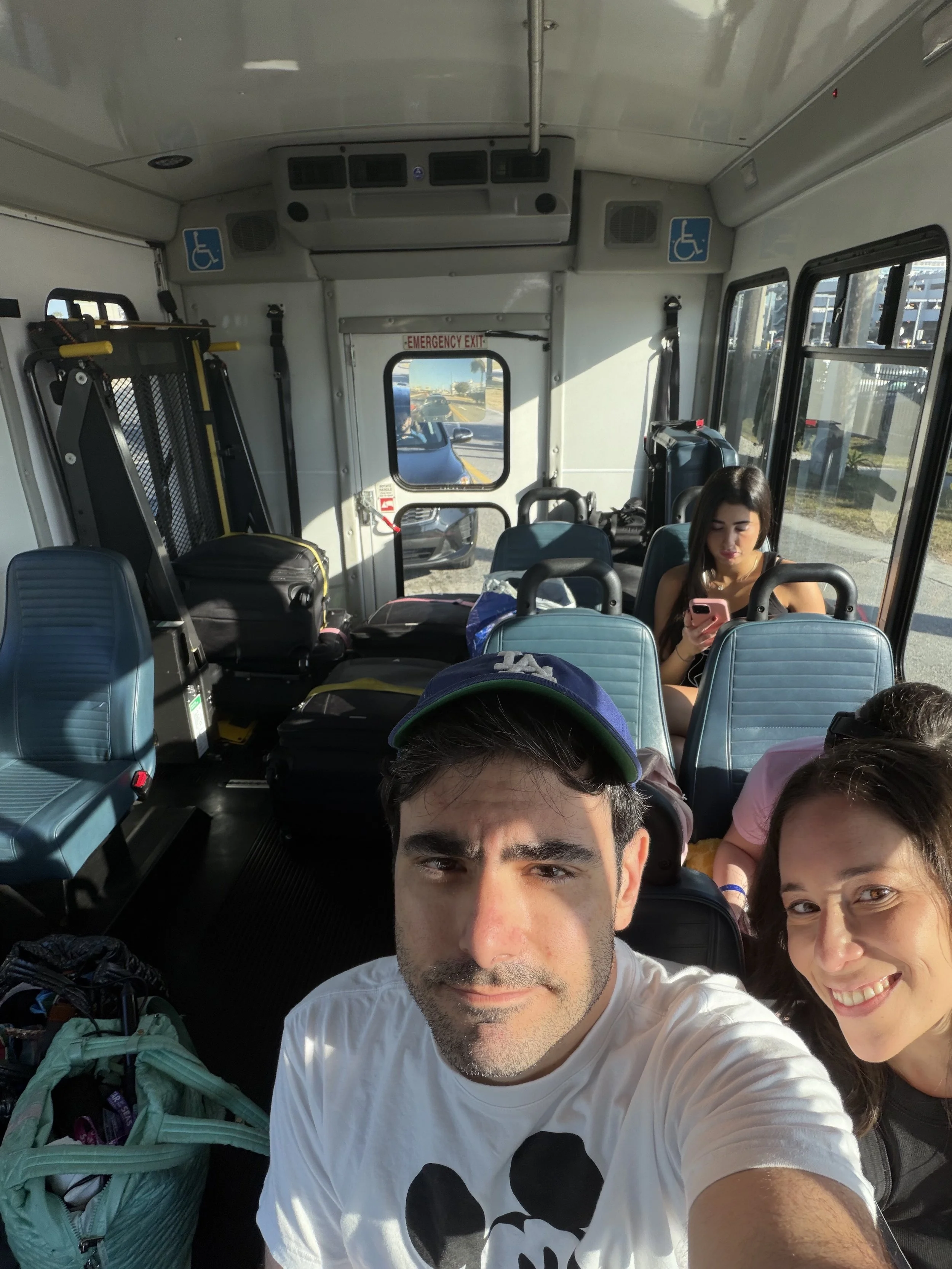 Next challenge: our driver. We tried calling him and quickly realized he only spoke Spanish. Thankfully the porter spoke a little Spanish, so we handed him the phone. It still took a while to locate the driver because no one could quite understand where he was. I understand it’s Florida, but it feels a little crazy to send a driver who speaks zero English to pick up cruise passengers. Eventually we spotted our ride, and it turned out to be basically one of those access-a-ride minibuses, the kind that fits wheelchairs and has about ten seats. Plenty of room for us, but no air conditioning. And did I mention that after last week’s cold spell Florida turned to a heat wave and it was around 80 degrees outside? To make things worse, it seemed the driver couldn’t get his minibus over 60 mph (the Florida highway speed limit is 70), so our hour ride turned into an hour twenty-five minutes. Even coach buses were passing us. And just when we thought we were almost there and this ride was over, the driver almost pulled into Disney’s Animal Kingdom. At the last second Tzvi started yelling “left, left!”—which, of course, he didn’t understand—but somehow from the frantic gesturing he figured it out and turned. Thank God.