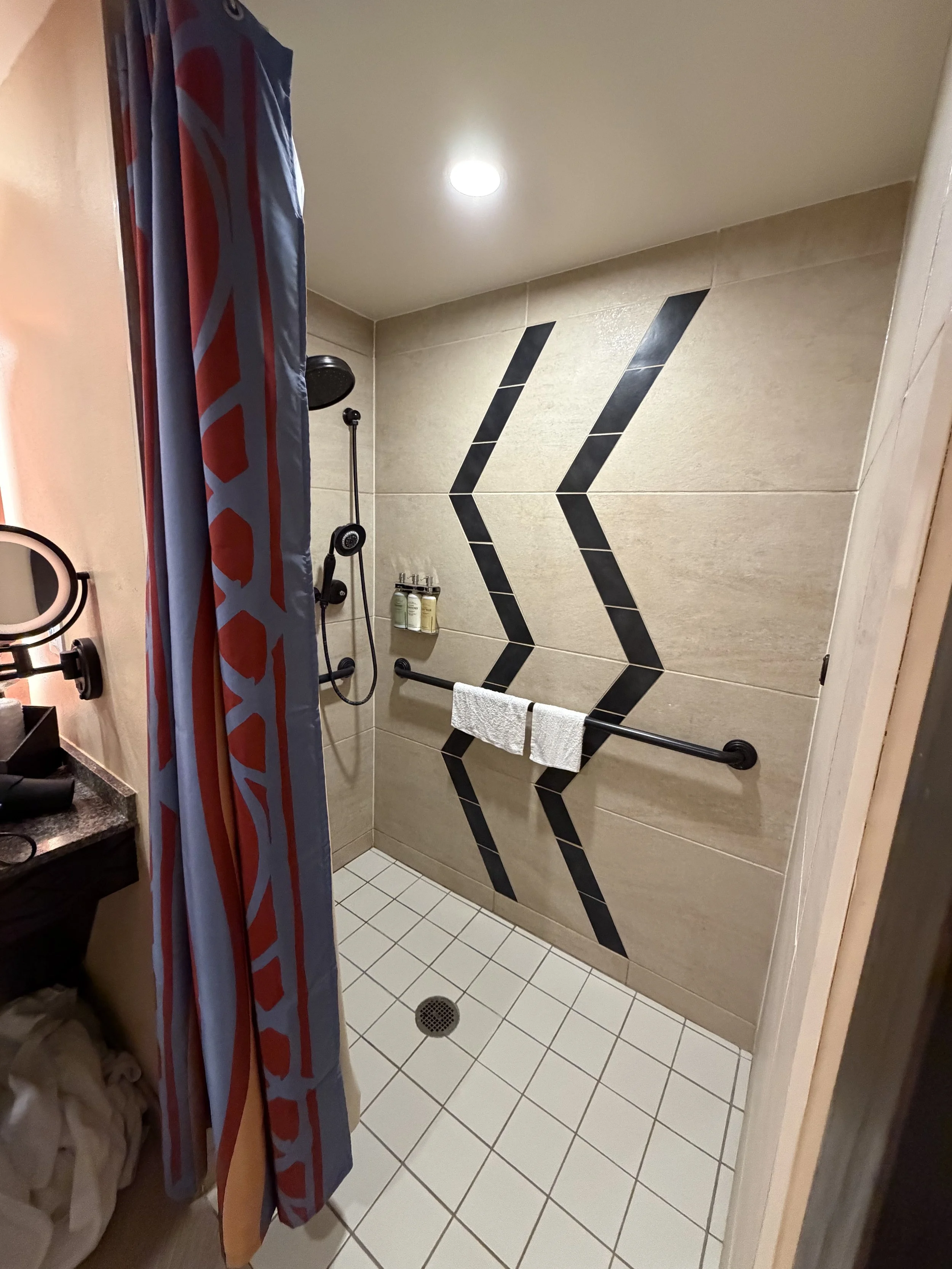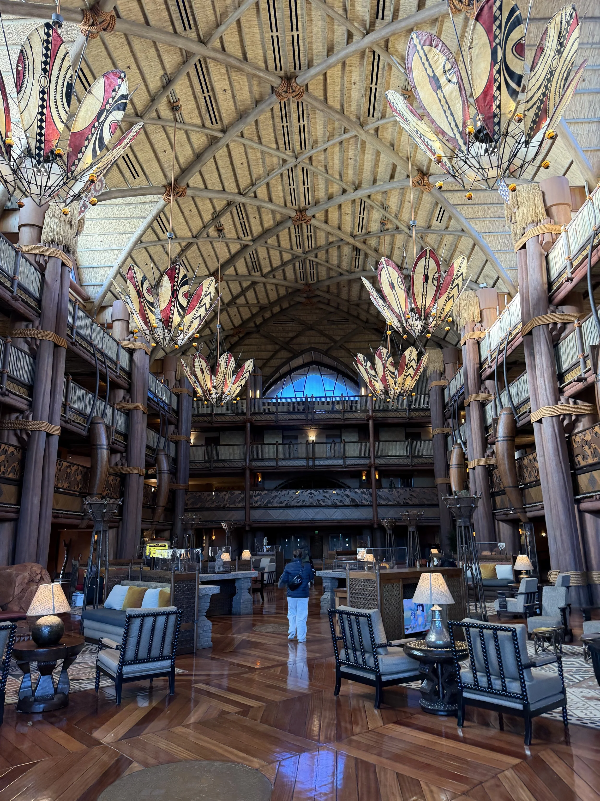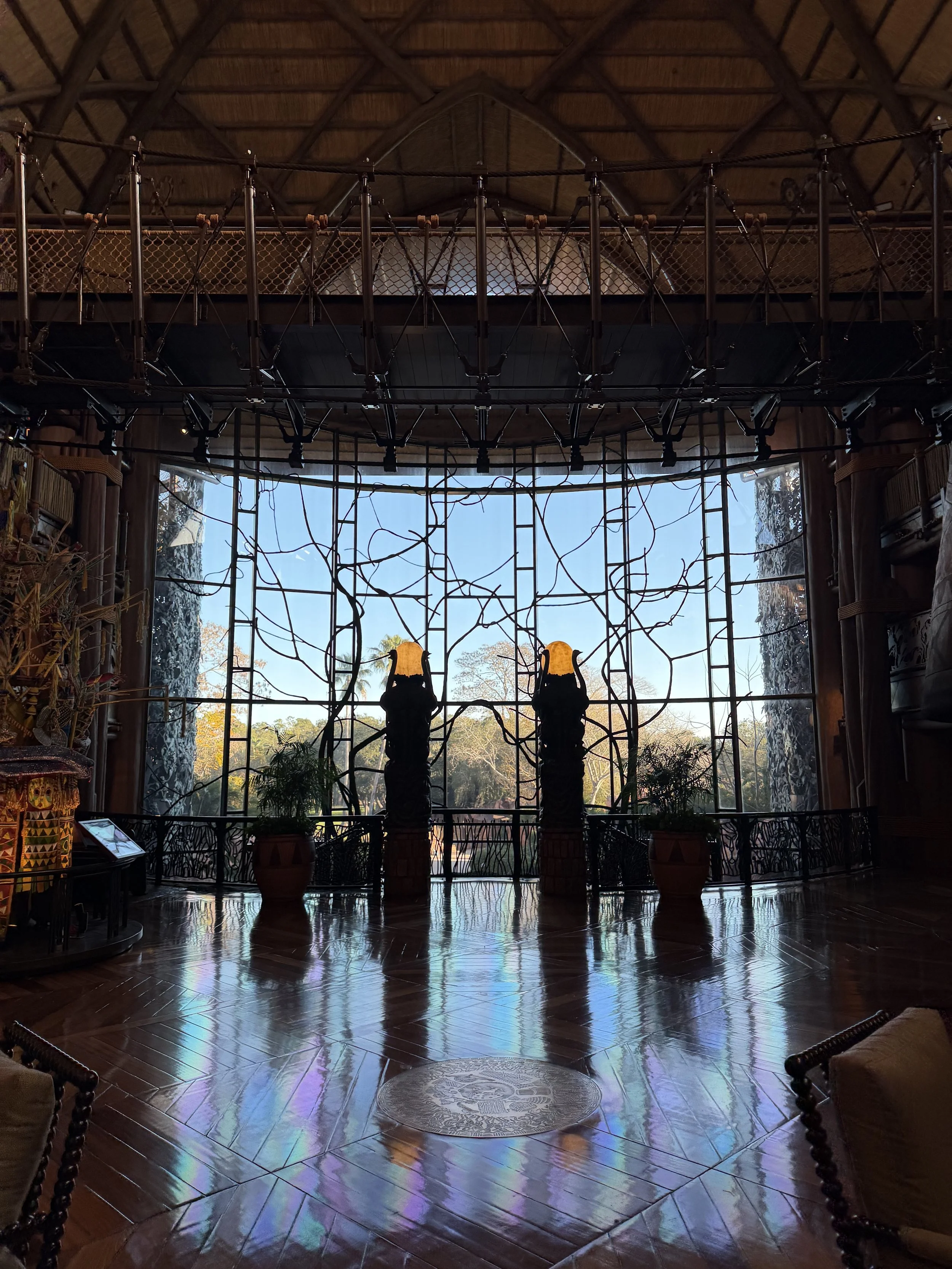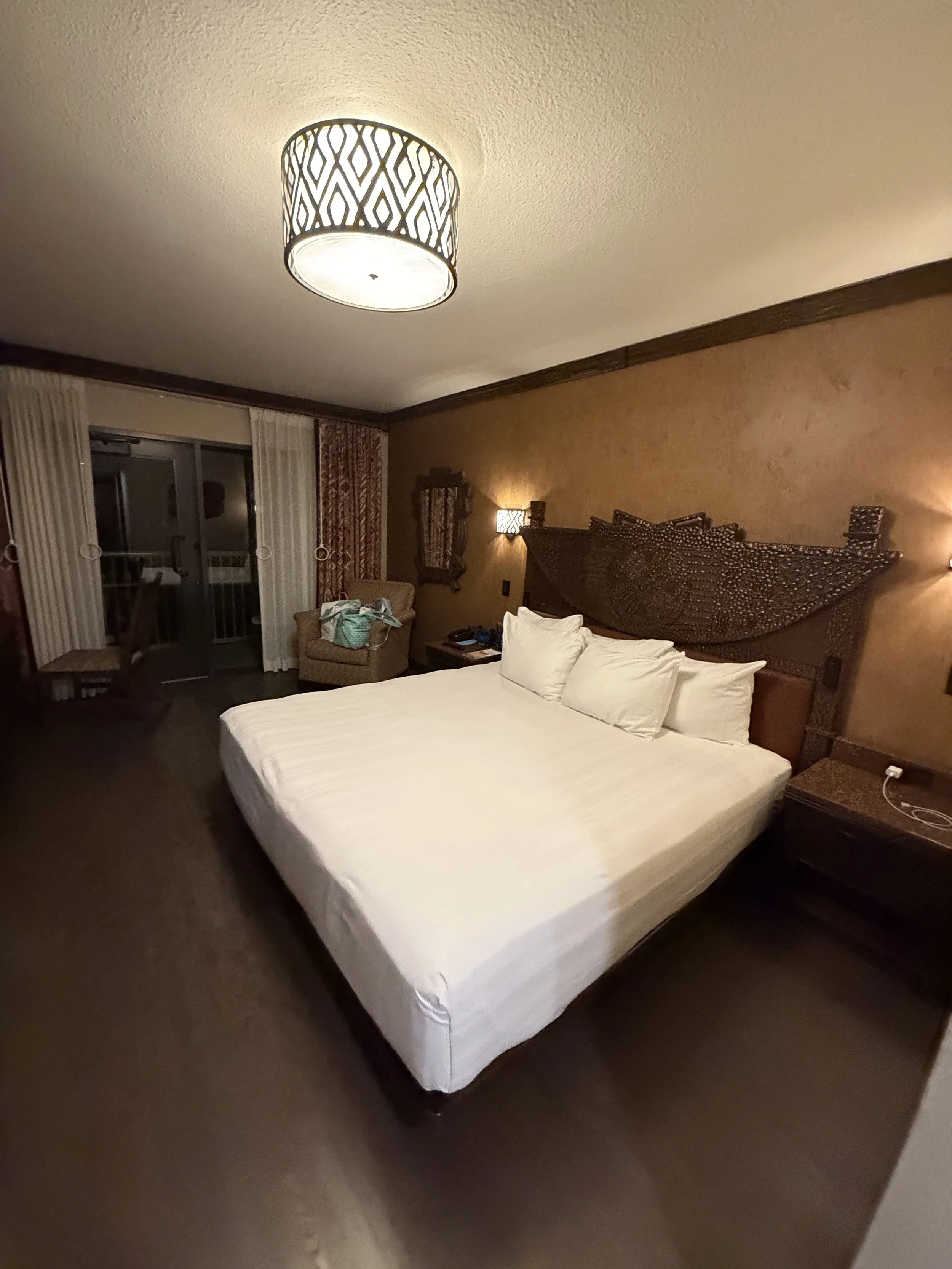 We finally arrived at Animal Kingdom Lodge, which is a beautiful hotel. It really reminded me of the Grand Californian in Los Angeles—very brown, very woodsy, very Lion King-esque. We checked in, and surprisingly our rooms were already ready even though it was only around 11:15. Our rooms were technically on the ground floor (which is actually the third floor), which initially didn’t thrill me—but then we realized we had been given a savanna view. I definitely did not pay for that, but we looked outside and could see animals, which was very cool. We also realized that Tzvi and I were given an accessible room, so the bed was lower and the shower had a seat and a curtain for wheelchair access. But we booked this only two days ago, and I guess beggars can’t be choosers.