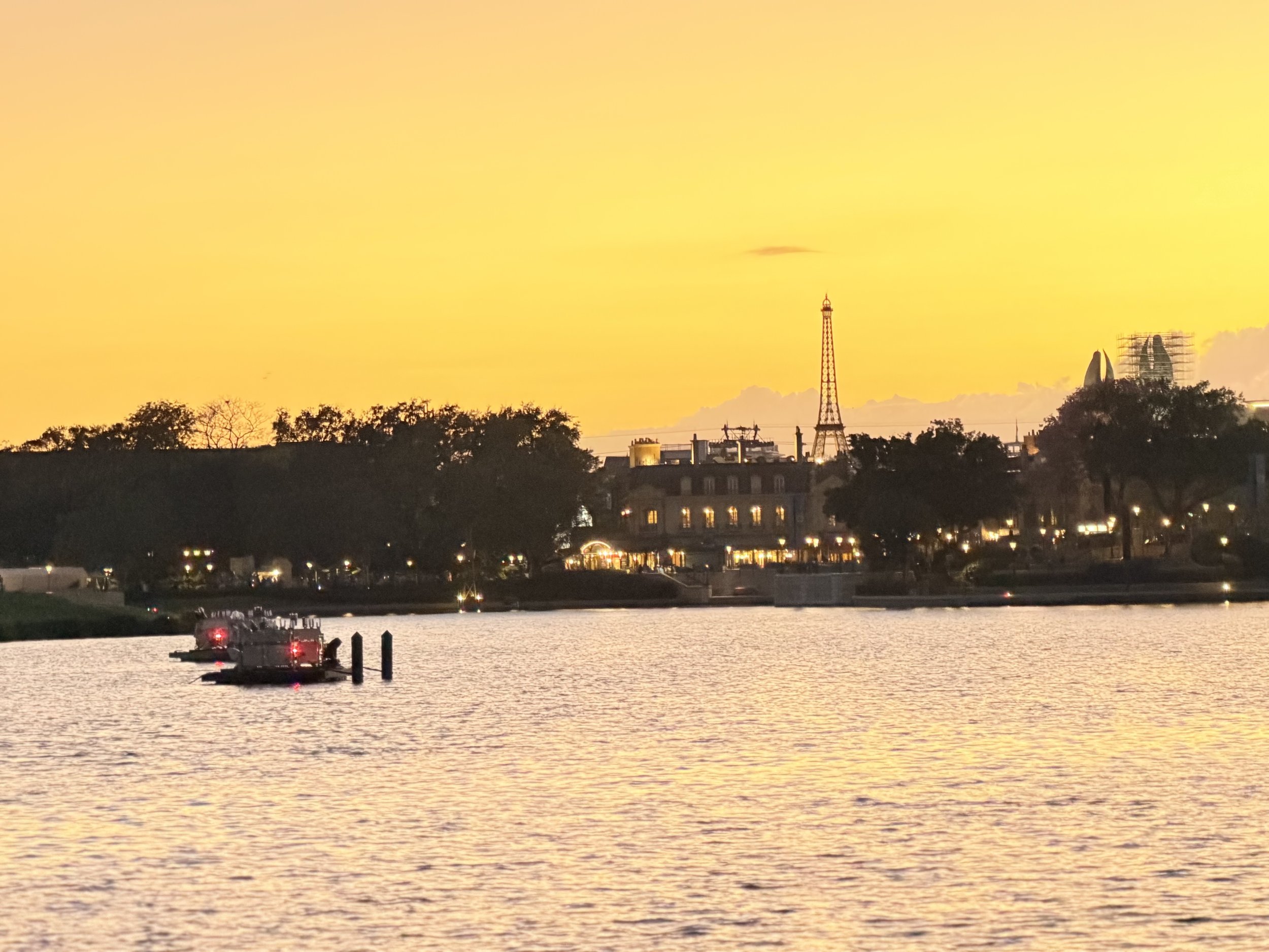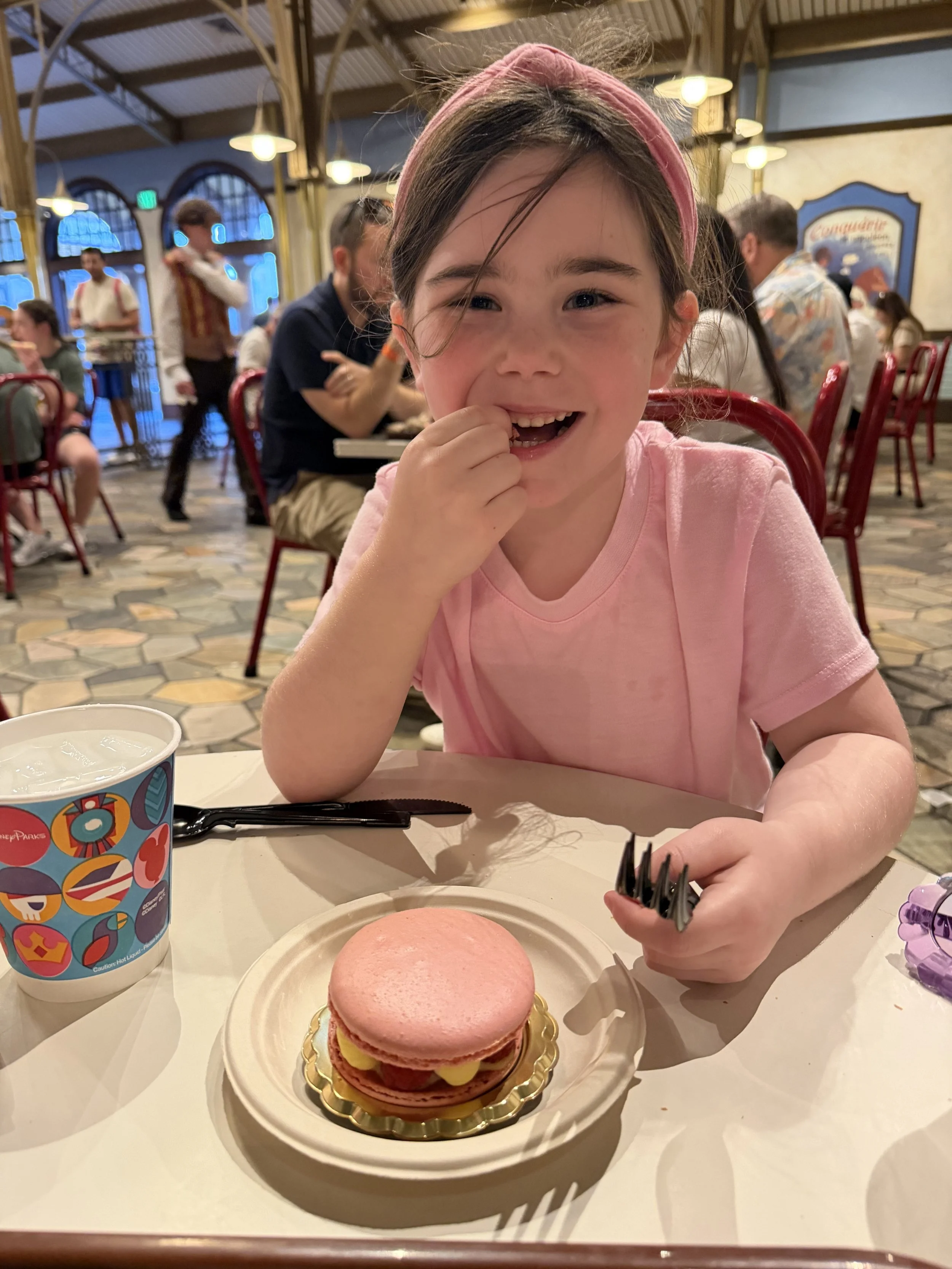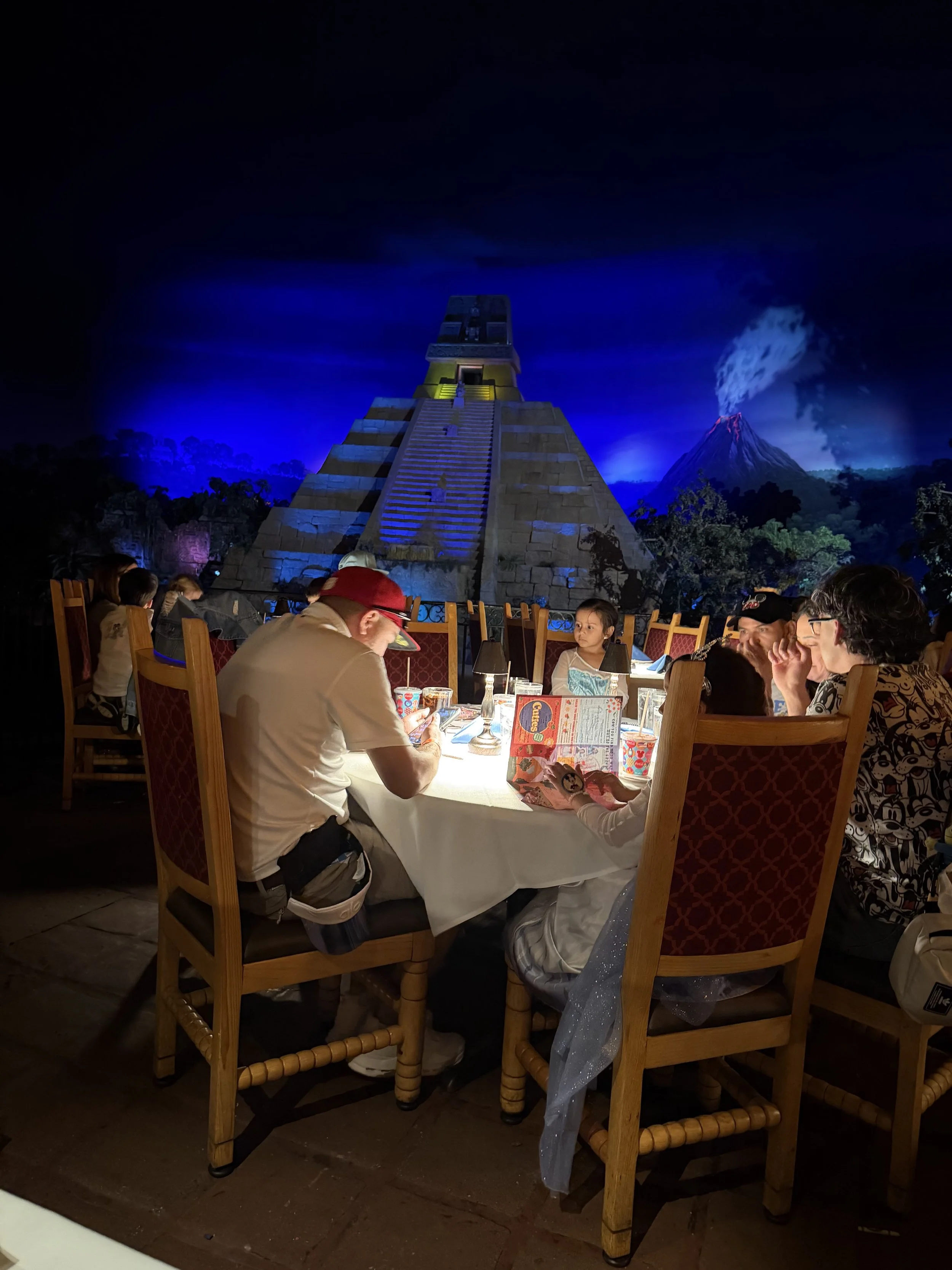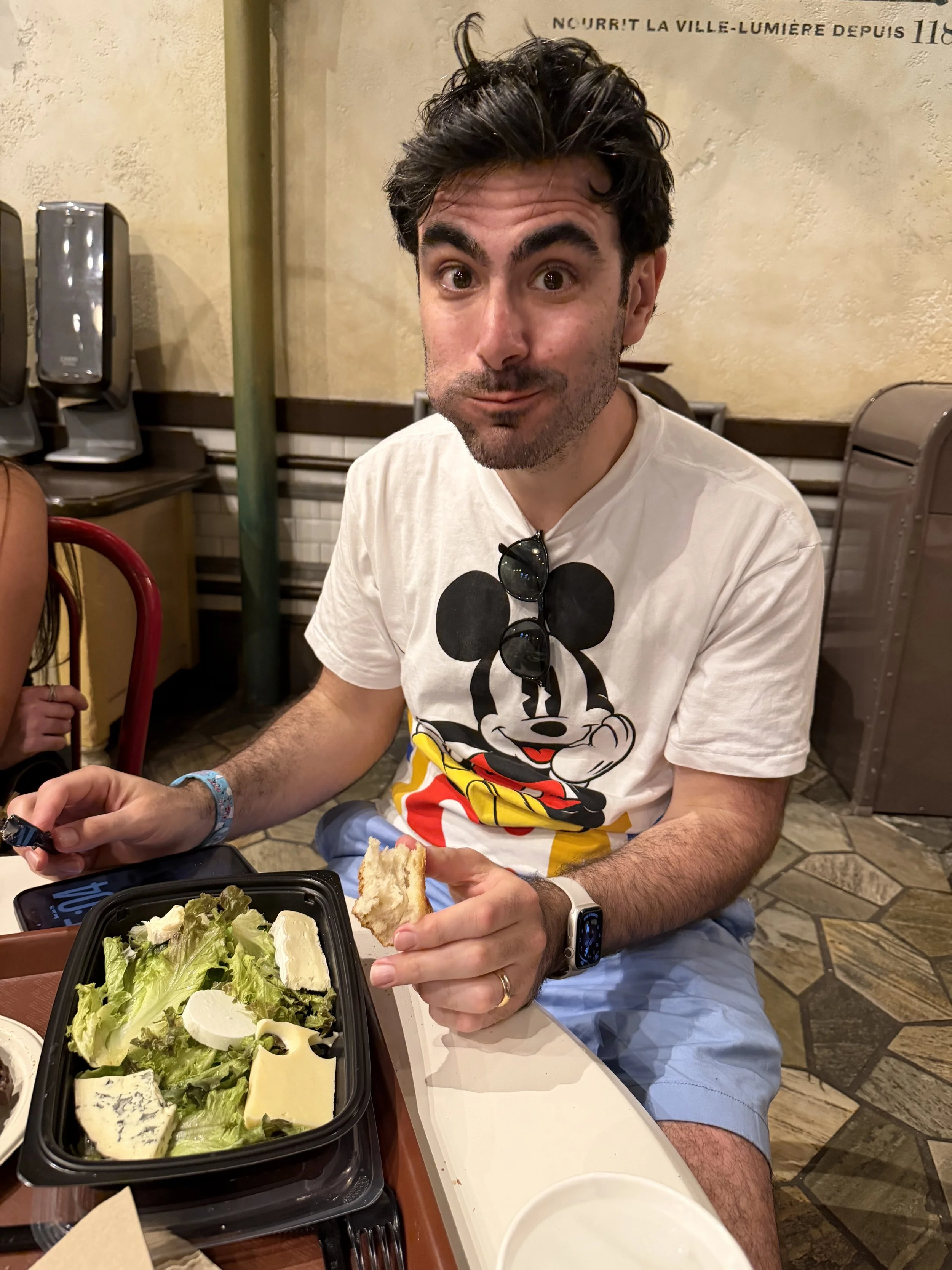 Spaceship Earth was still closed, so we headed to the countries and started with Ratatouille. Two notable things: it’s no longer 3D (which didn’t really matter), and they now cram six people into each ride vehicle—which is not great. We watched a tiny French cast member trying to politely instruct much larger adults to squeeze into these little cars. They looked extremely uncomfortable. We had a pre-dinner snack in France: the five of us shared an entire baguette, Tzvi had a cheese plate, and we had a few pastries.