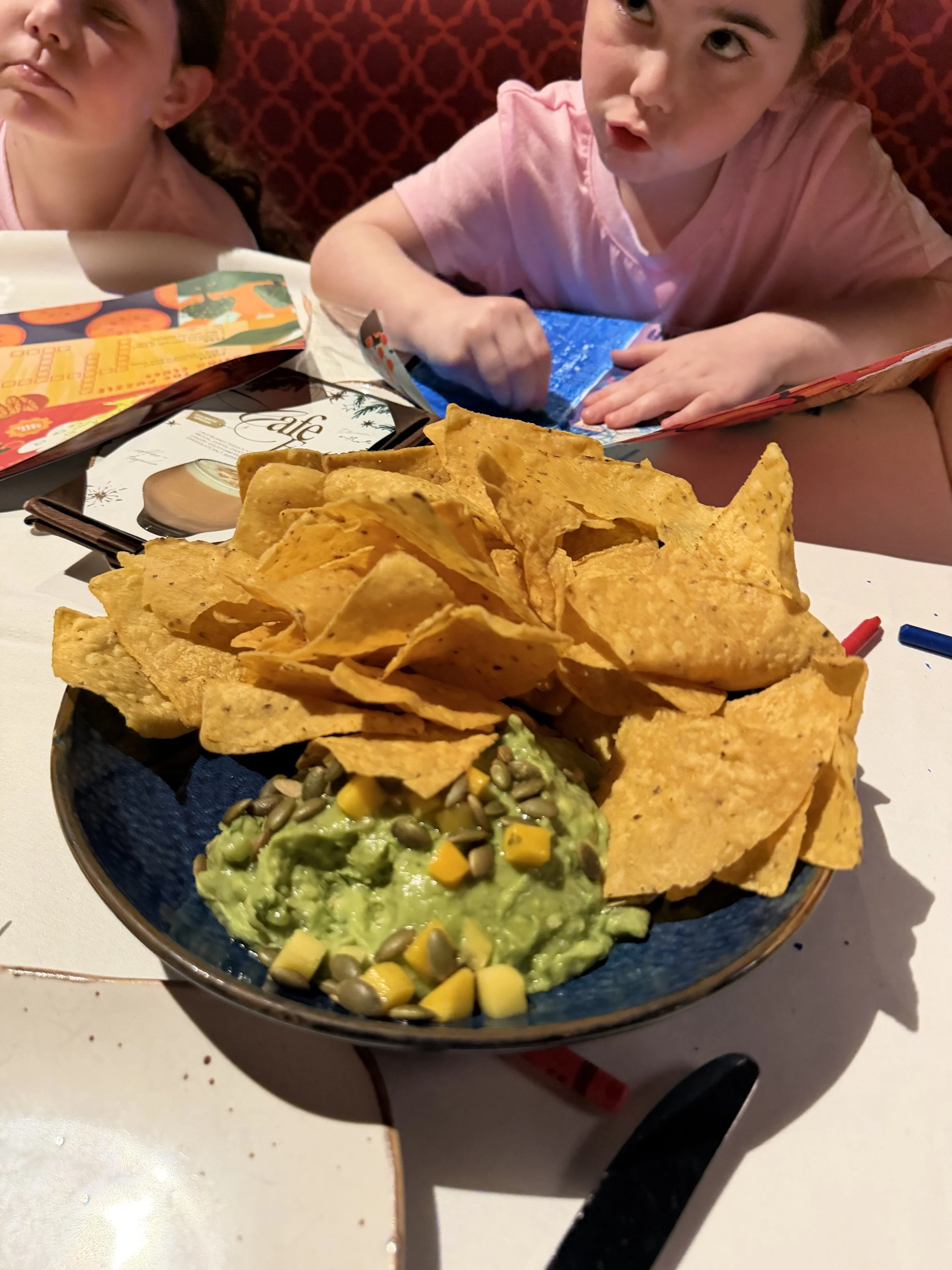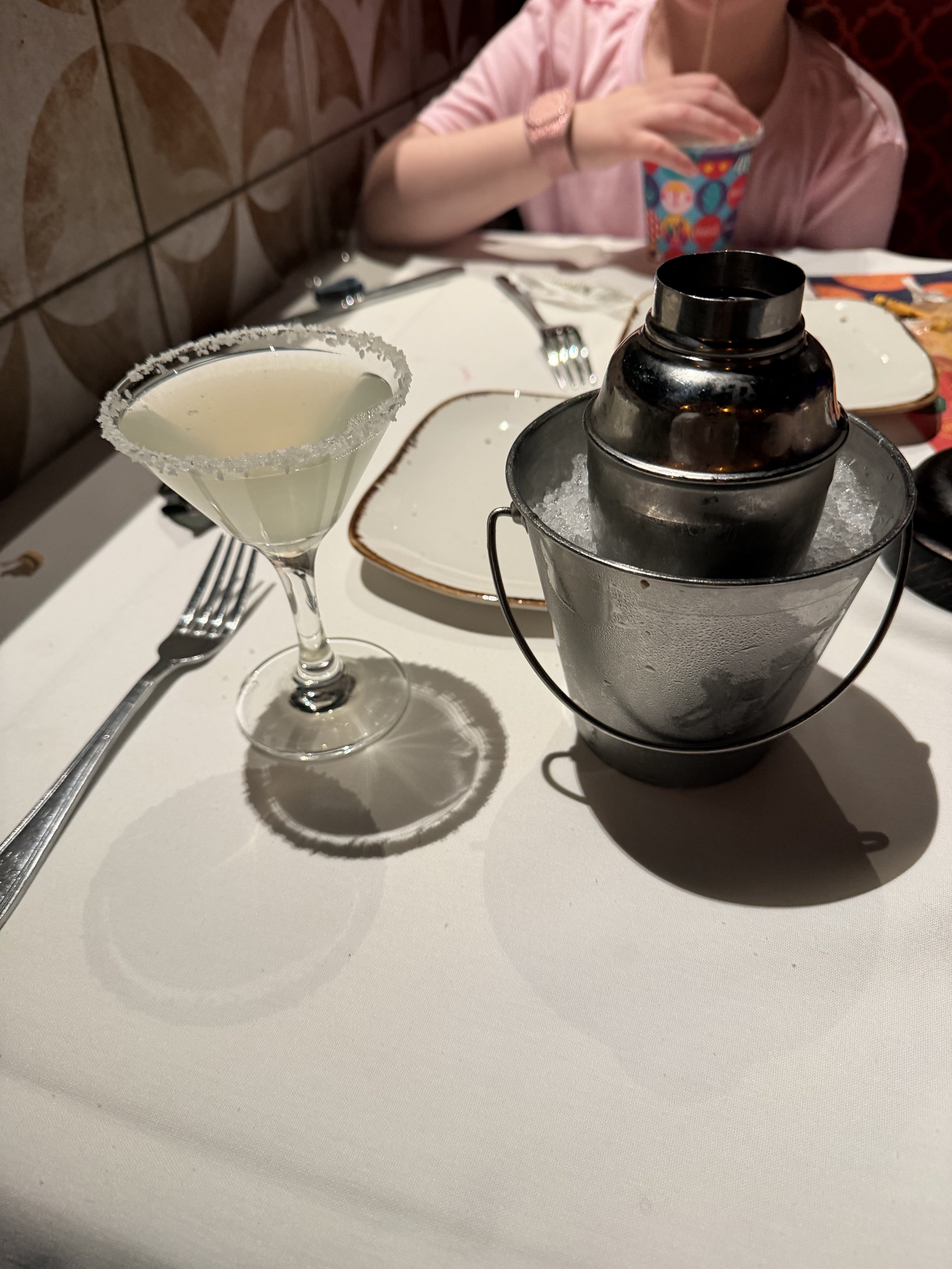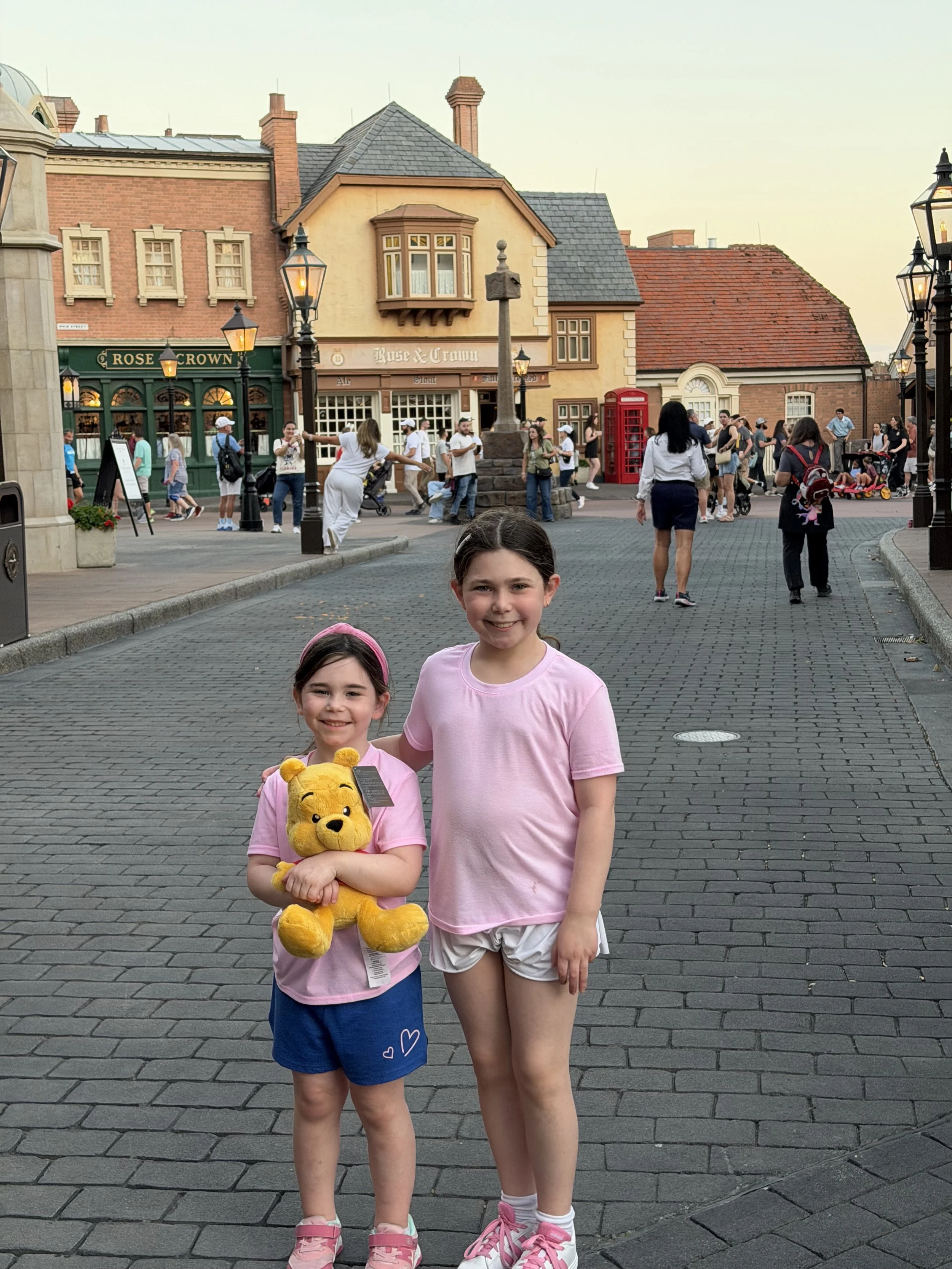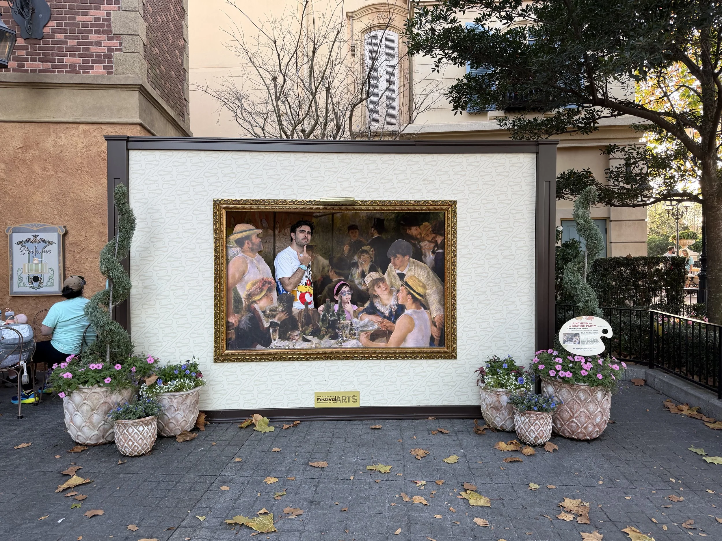 Spaceship Earth was still closed, so we headed to the countries and started with Ratatouille. Two notable things: it’s no longer 3D (which didn’t really matter), and they now cram six people into each ride vehicle—which is not great. We watched a tiny French cast member trying to politely instruct much larger adults to squeeze into these little cars. They looked extremely uncomfortable. We had a pre-dinner snack in France: the five of us shared an entire baguette, Tzvi had a cheese plate, and we had a few pastries.