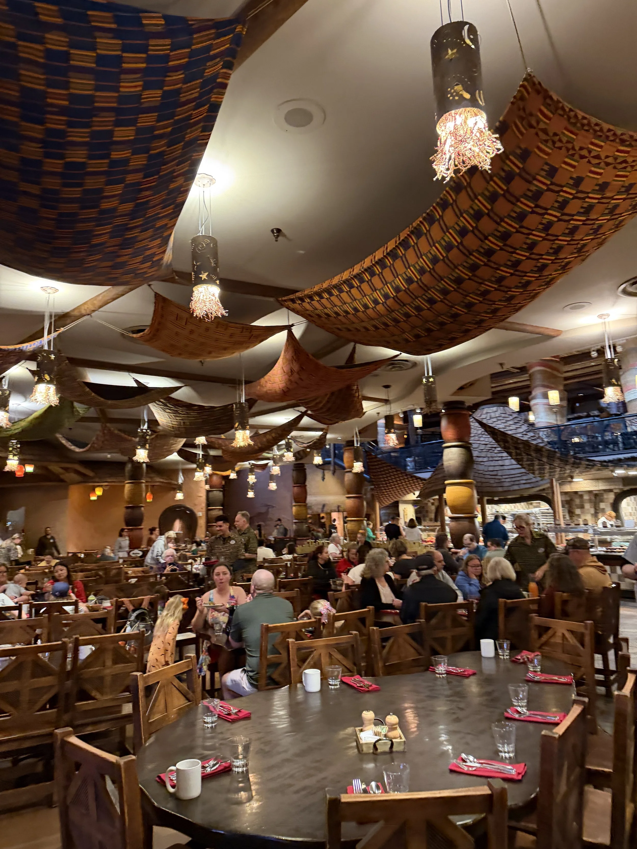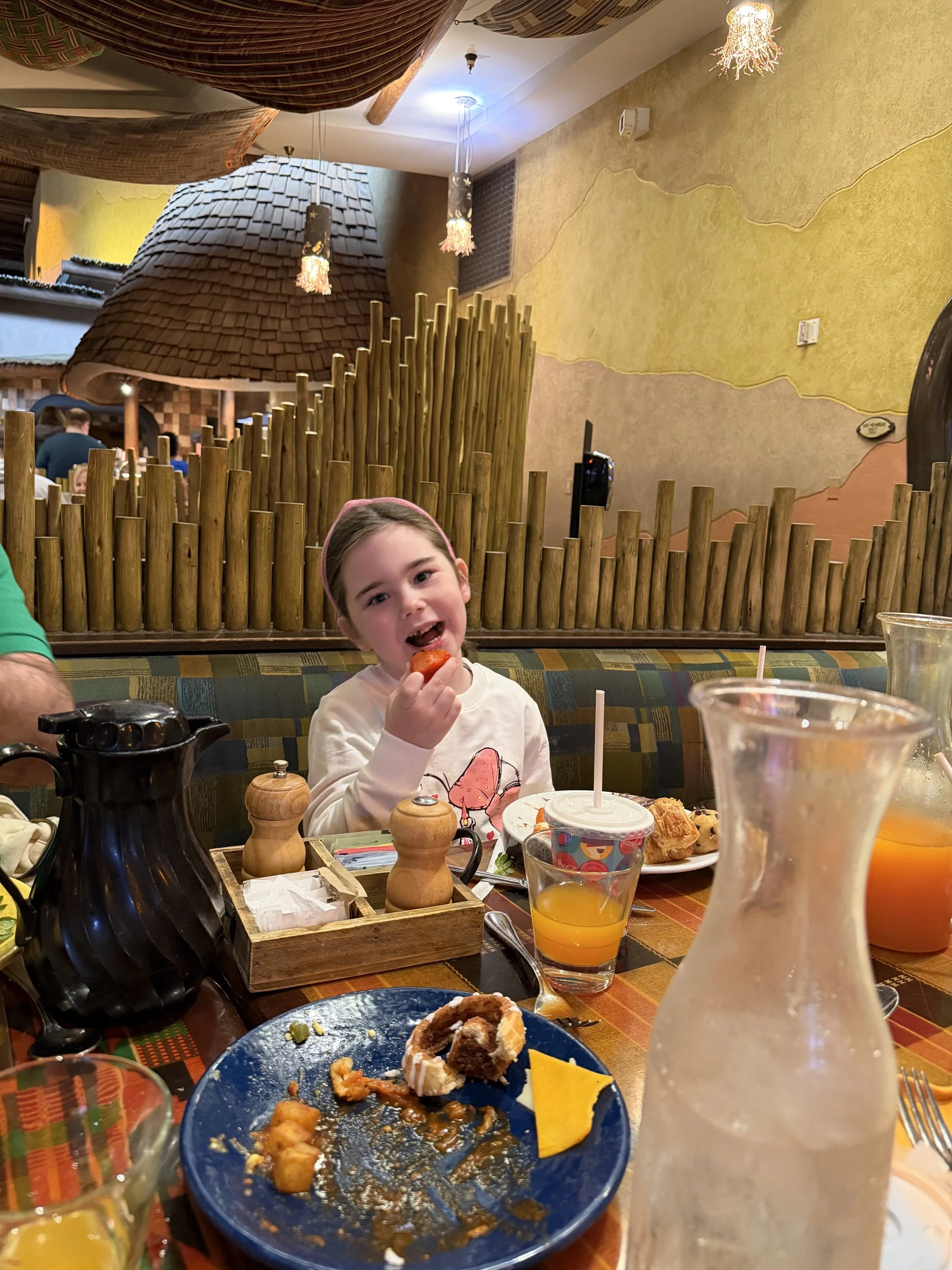 The plan was for Tzvi to stay in the room to work all day, while the girls and I went to Animal Kingdom, but first we started with a breakfast at Boma, the restaurant in our hotel. It’s a buffet (not a character breakfast), but honestly much better than Chef Mickey’s. They had all of the usual Disney breakfast staples (Mickey Waffles), plus African-inspired dishes (Tzvi ate chakalaka which was both delicious and fun to say). Every so often drummers would come through the restaurant, which was fun. There was also a peach crisp situation that was really good. Strong start to the day.