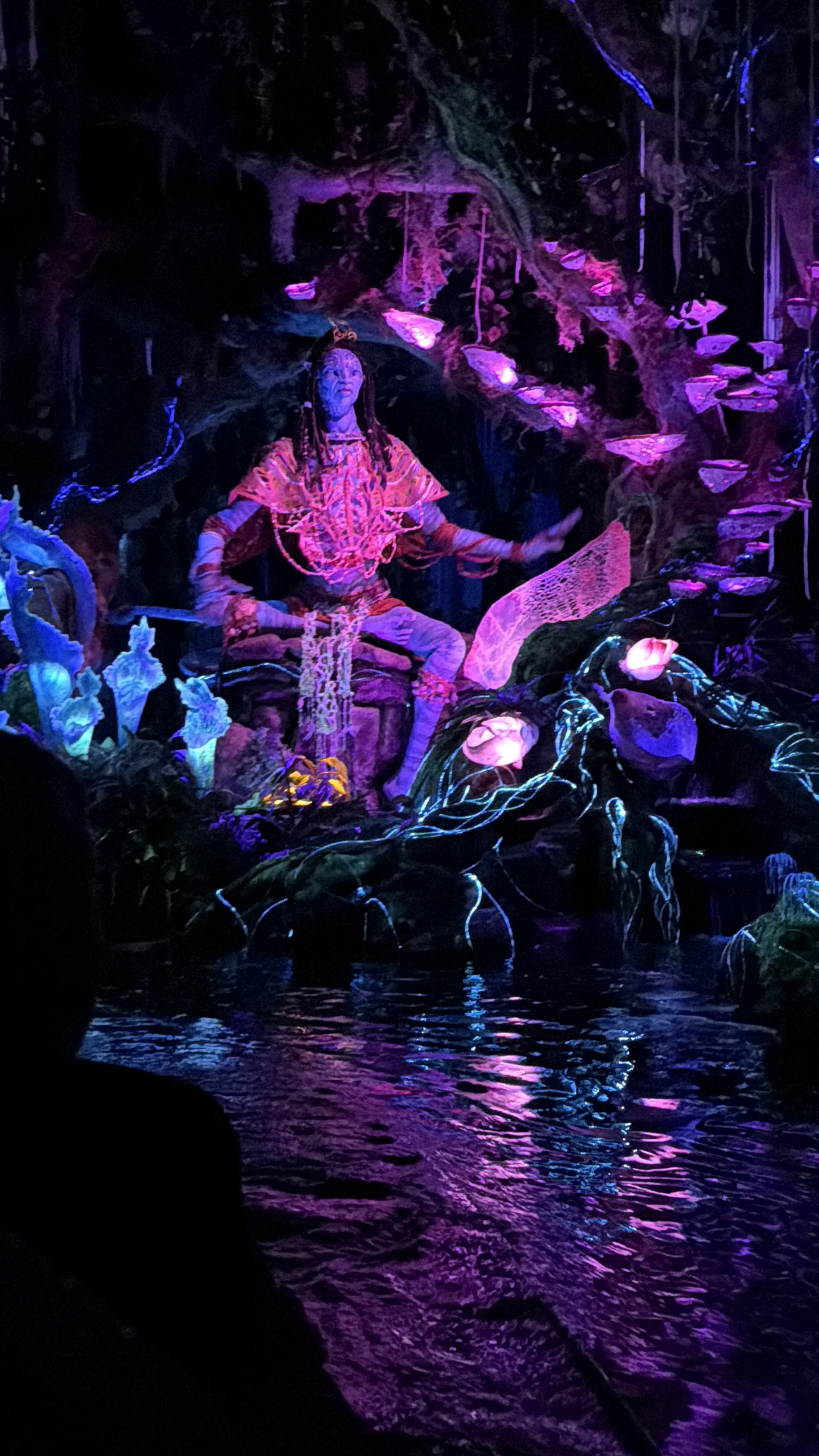 After that, we had pizza for lunch, and then we went to the Zootopia show, which is like a 10 minute movie, which was great because we all love Zootopia. We did pass by Judy Hopps and Nick Wilde, and would have loved to meet them, but the line was like over an hour long. Just was not worth it. Then we went to Pandora and rode the Avatar ride. Madeleine almost did it, but the ride mechanism is where you're sitting on, I don't know how to explain it, like a banshee and you're leaning forward and there's restraints in back of you and in front of you, and Madeleine got into the restraints, but then we were sitting waiting for the ride to start for several minutes, and I think that just got her creeped out, and then she didn't want to ride. So she got off the ride with Shir. Hallie and I rode it and did a rider switch, so Hallie got to ride it twice. Then we all rode the Navi River Journey ride, which is a slow moving river ride with the super expensive, crazy animatronic at the end which I always find so strange. It’s the weirdest ride. Nothing happens and then there’s this giant blue person and then it just ends.