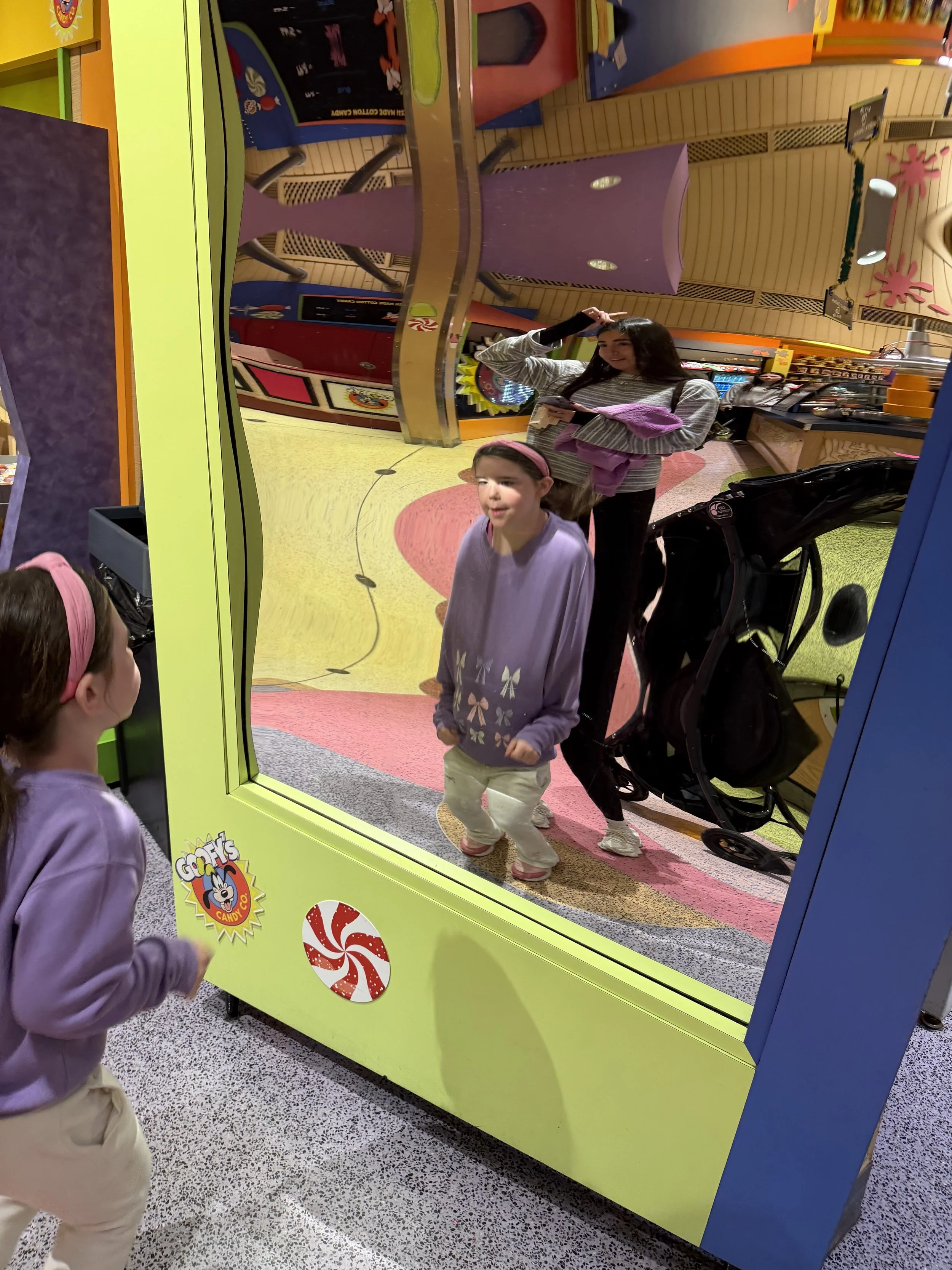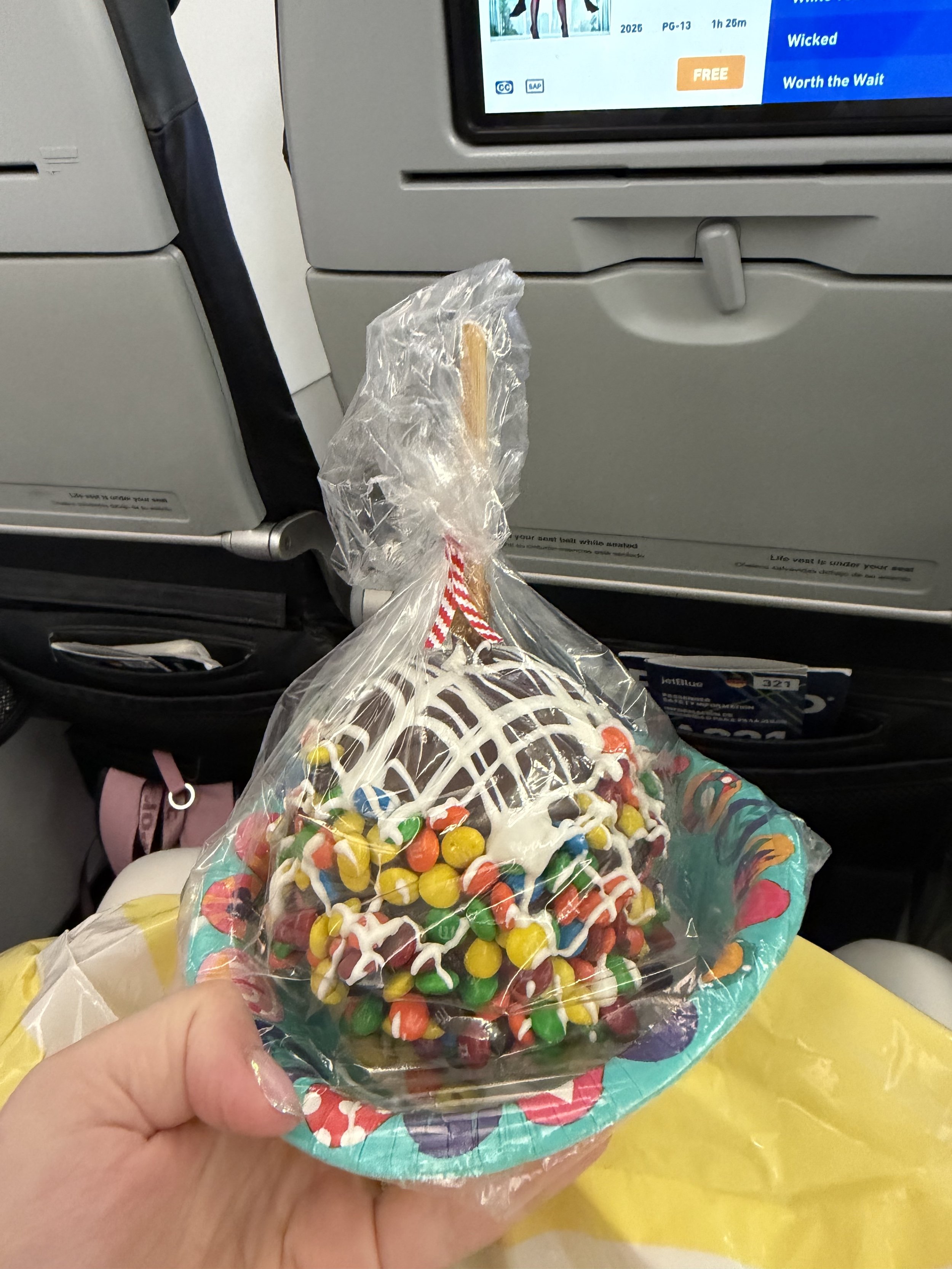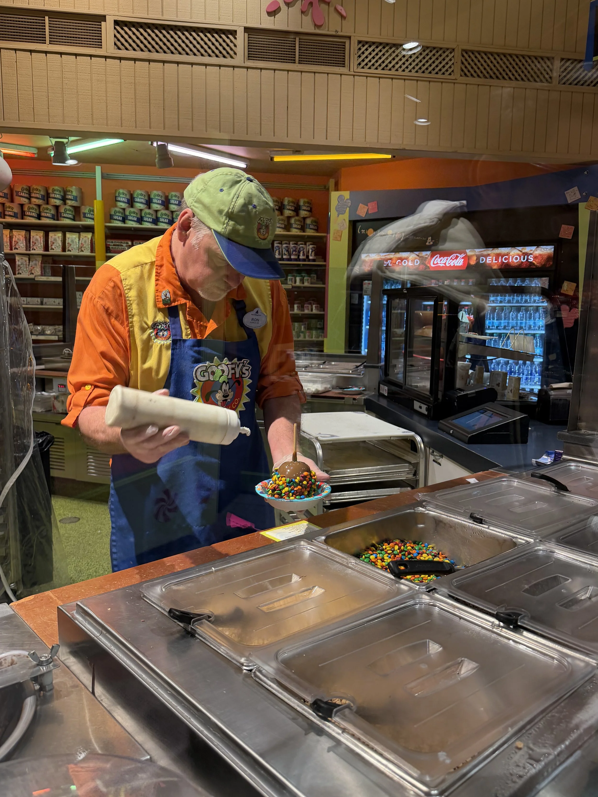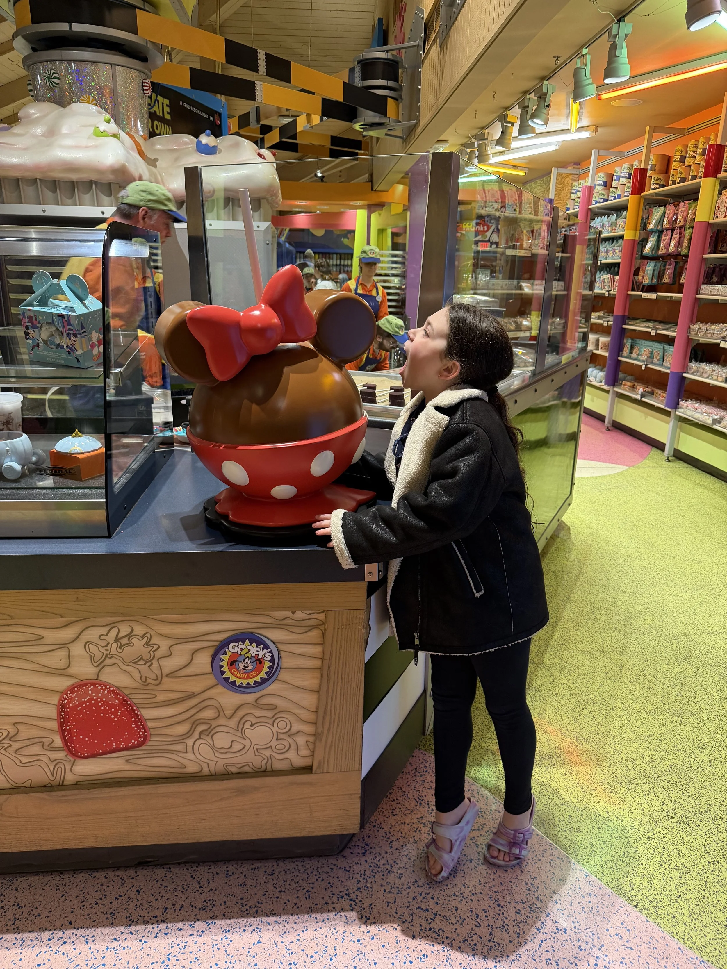 Finally it was time for Hallie’s long awaited meal at the Rainforest Cafe. She was so happy that we were able to get there. The dinner was fine, actually better than expected. The chef did come out to discuss allergies, but unlike previous trips we didn't have to wait a long time for him to come. Like previous trips, we did have to wait a long time for our food, but it wasn’t too bad. Nice dinner. After dinner we went to Goofy's Candy Co. and I got my caramel apple, which was very exciting. Then we walked around World of Disney and did our second final shopping. Tzvi just kept saying that we had already done our big Disney shopping the previous week so we shouldn’t be buying anything. That was funny. Then we headed back to the hotel in a Lyft with a driver who had been a marine. Semper fi.